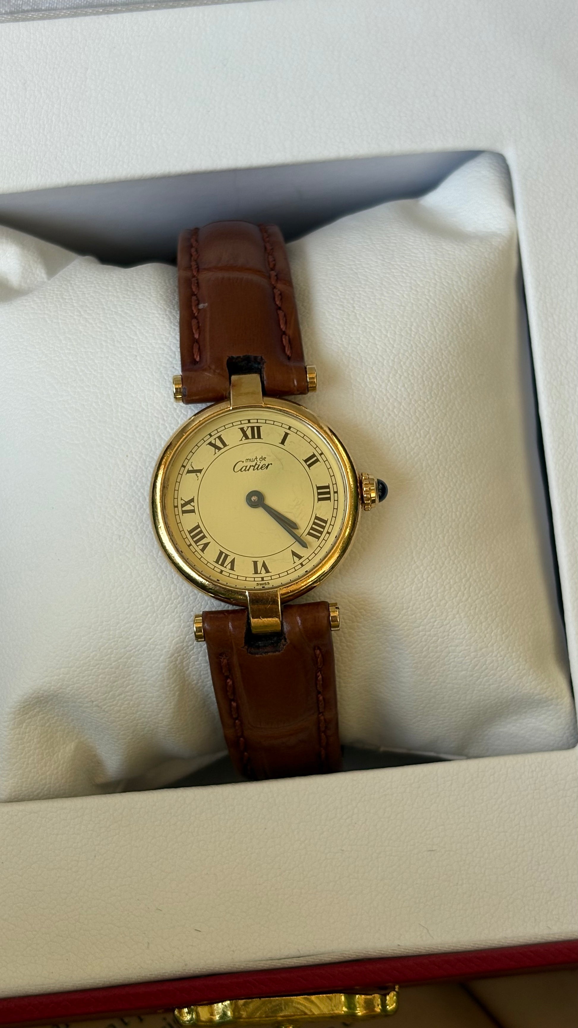 Extremely Rare 1980s Vintage Cartier Must de Vendôme Vermeil in Brown Leather Gold Tone