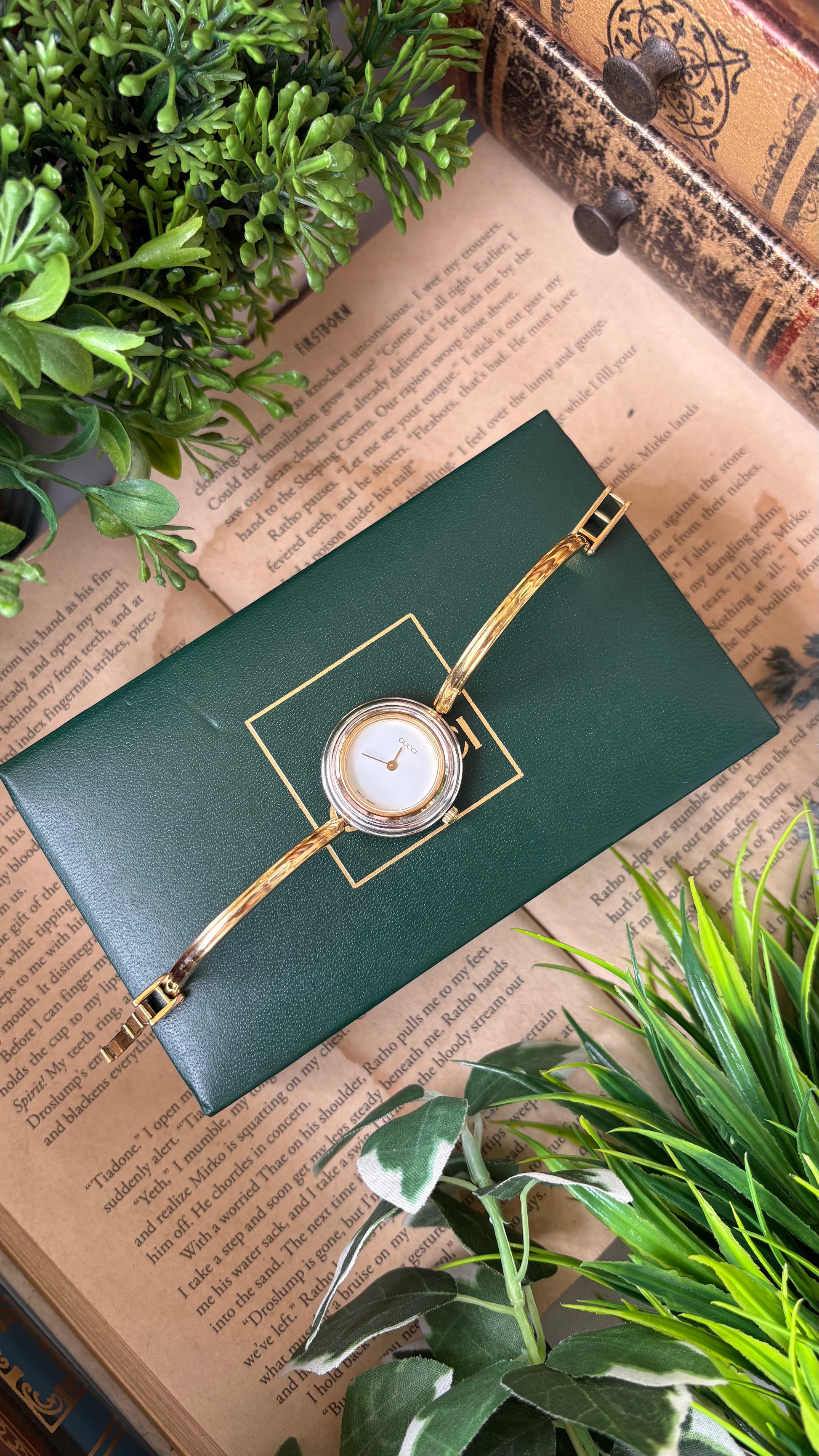 Extremely Rare Vintage Gucci 1100L Interchangeable Bezel Set Bangle Watch in Gold Tone