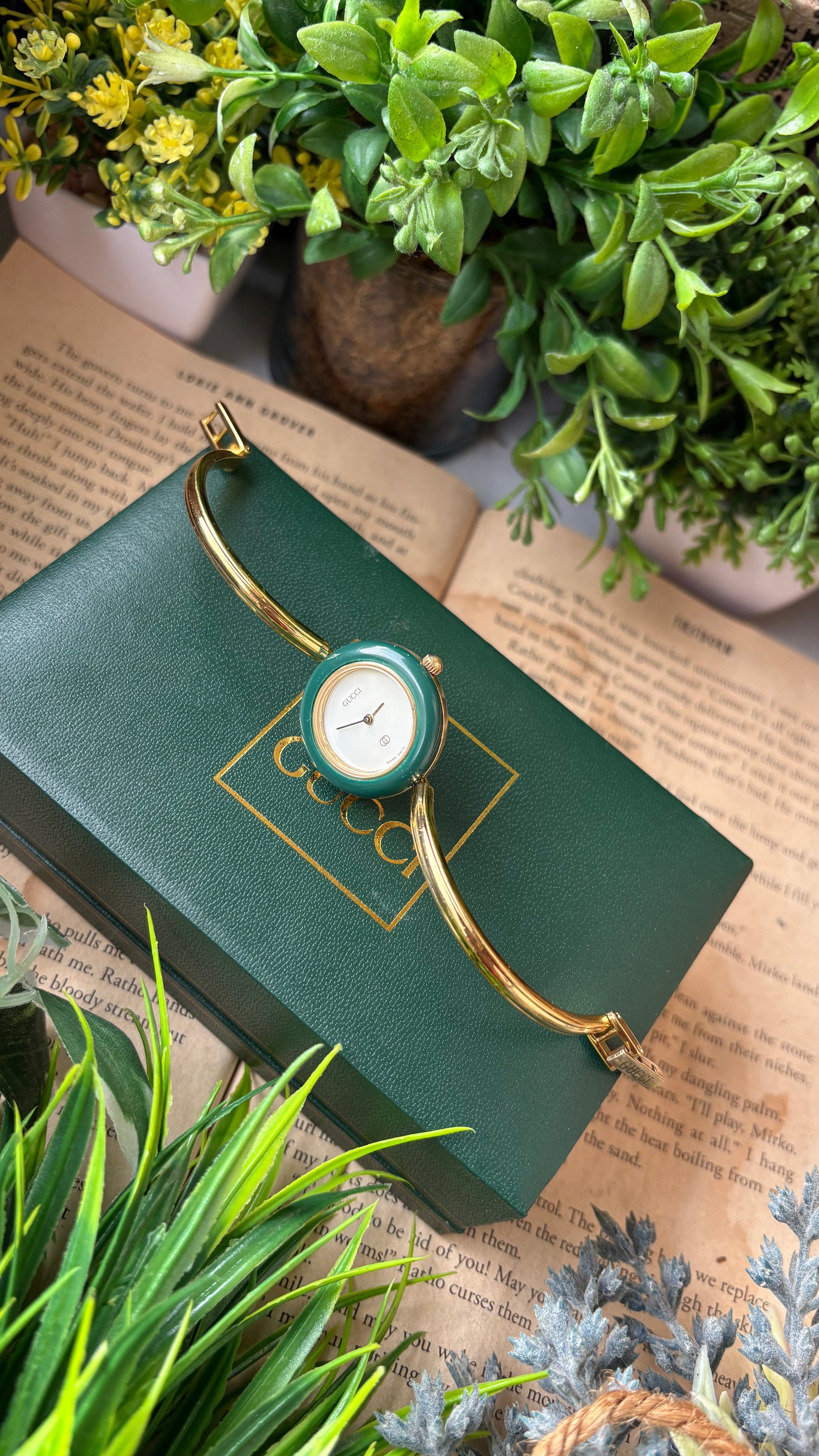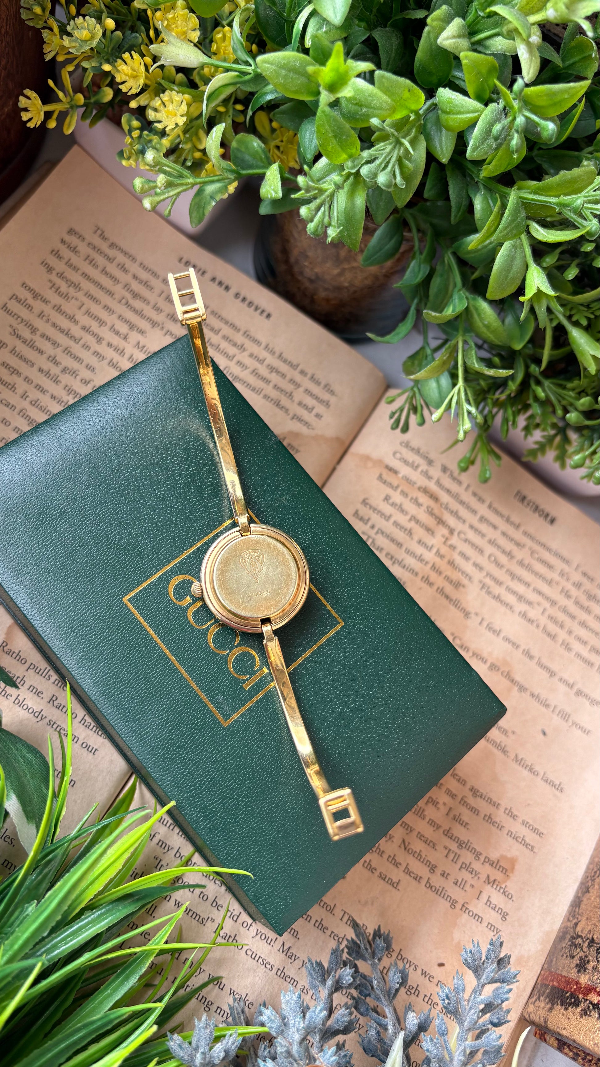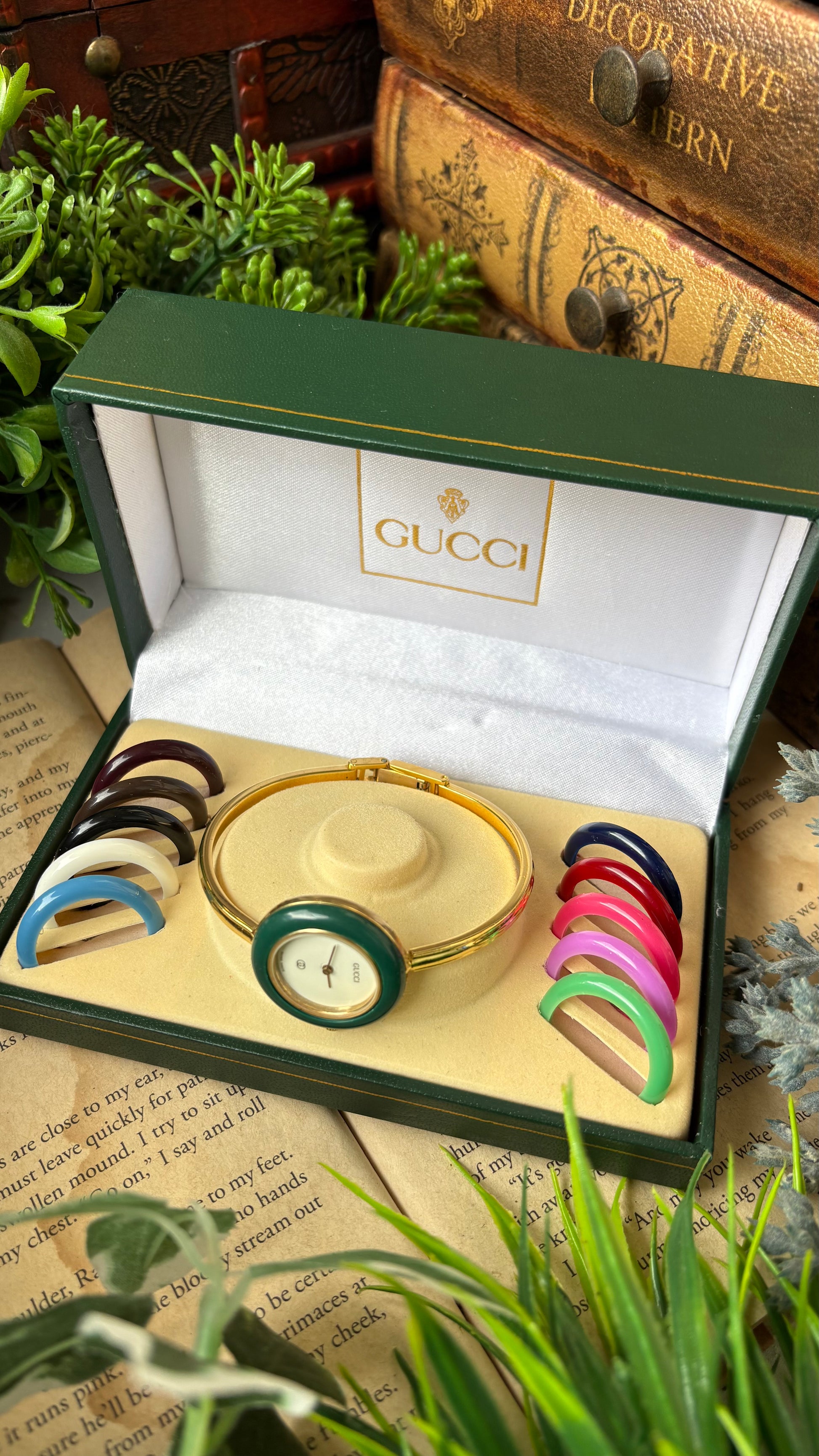 Extremely Rare Vintage Gucci 1100L Interchangeable Bezel Set Bangle Watch in Gold Tone