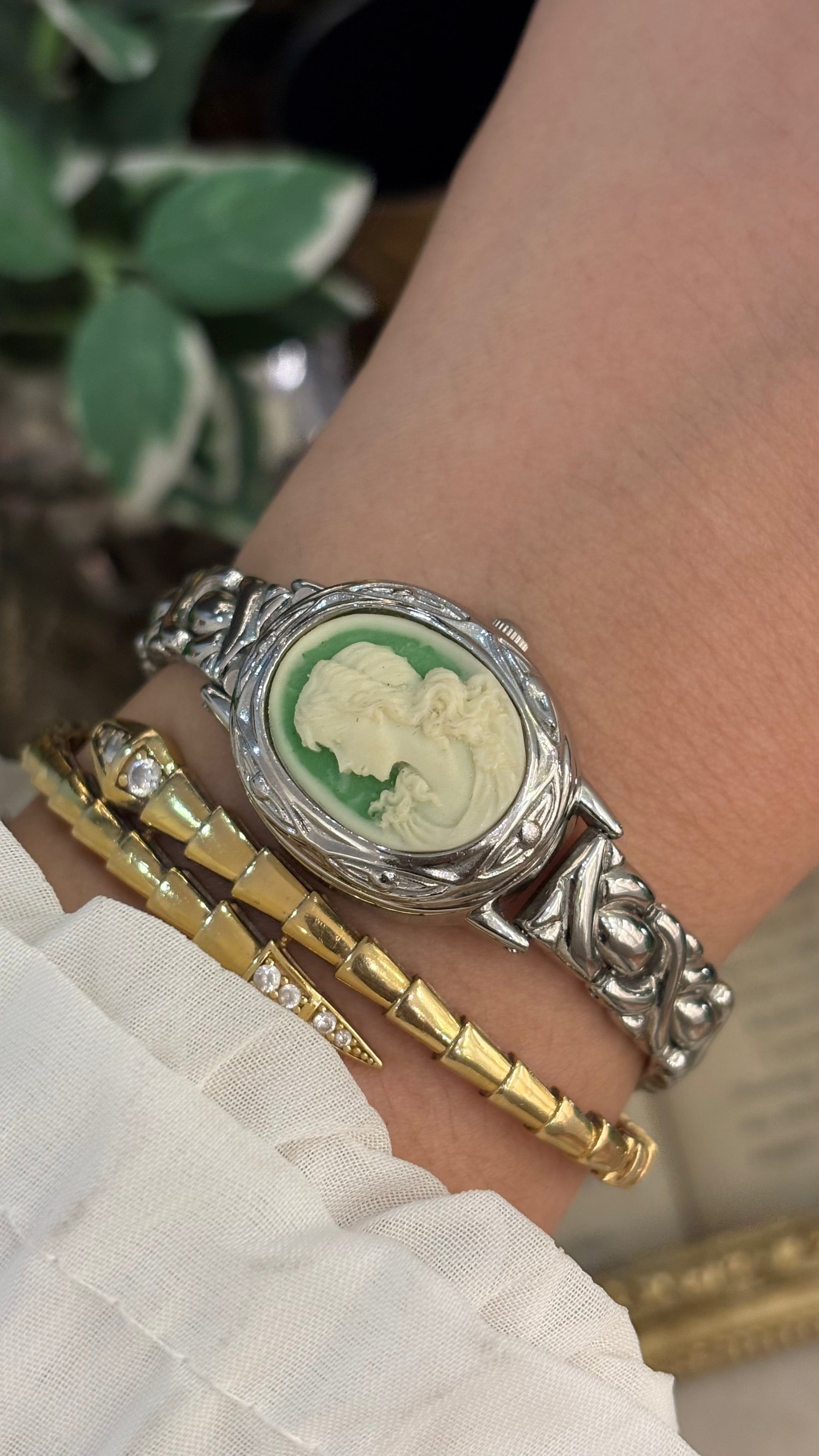 Extremely Rare Vintage Marba Green Cameo Peekaboo Watch in Silver Tone Quartz