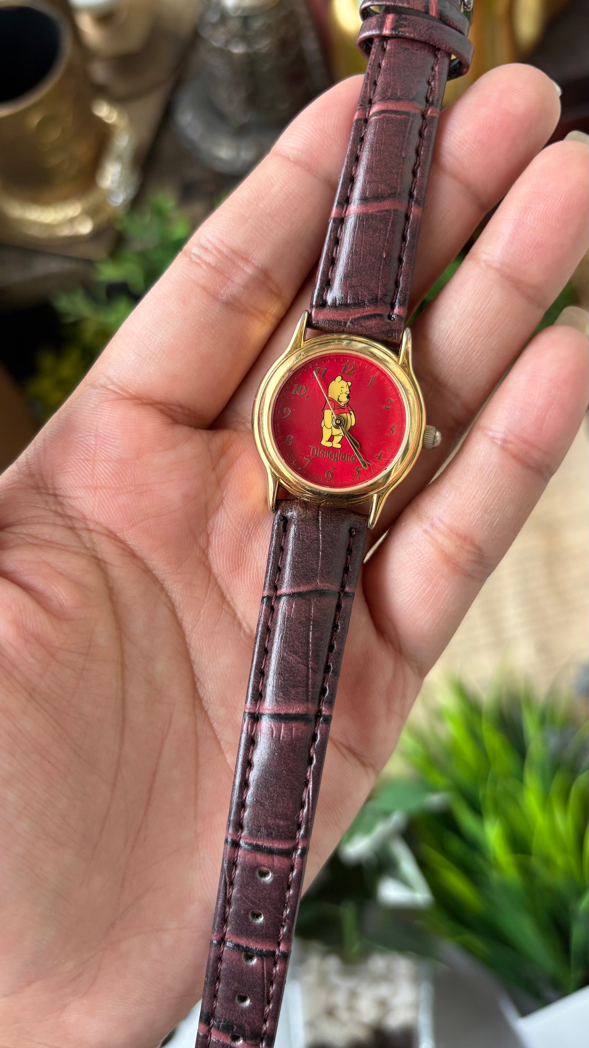 Rare Vintage Winnie the Pooh Red Dial Watch in Gold Tone Maroon Leather Quartz #00931