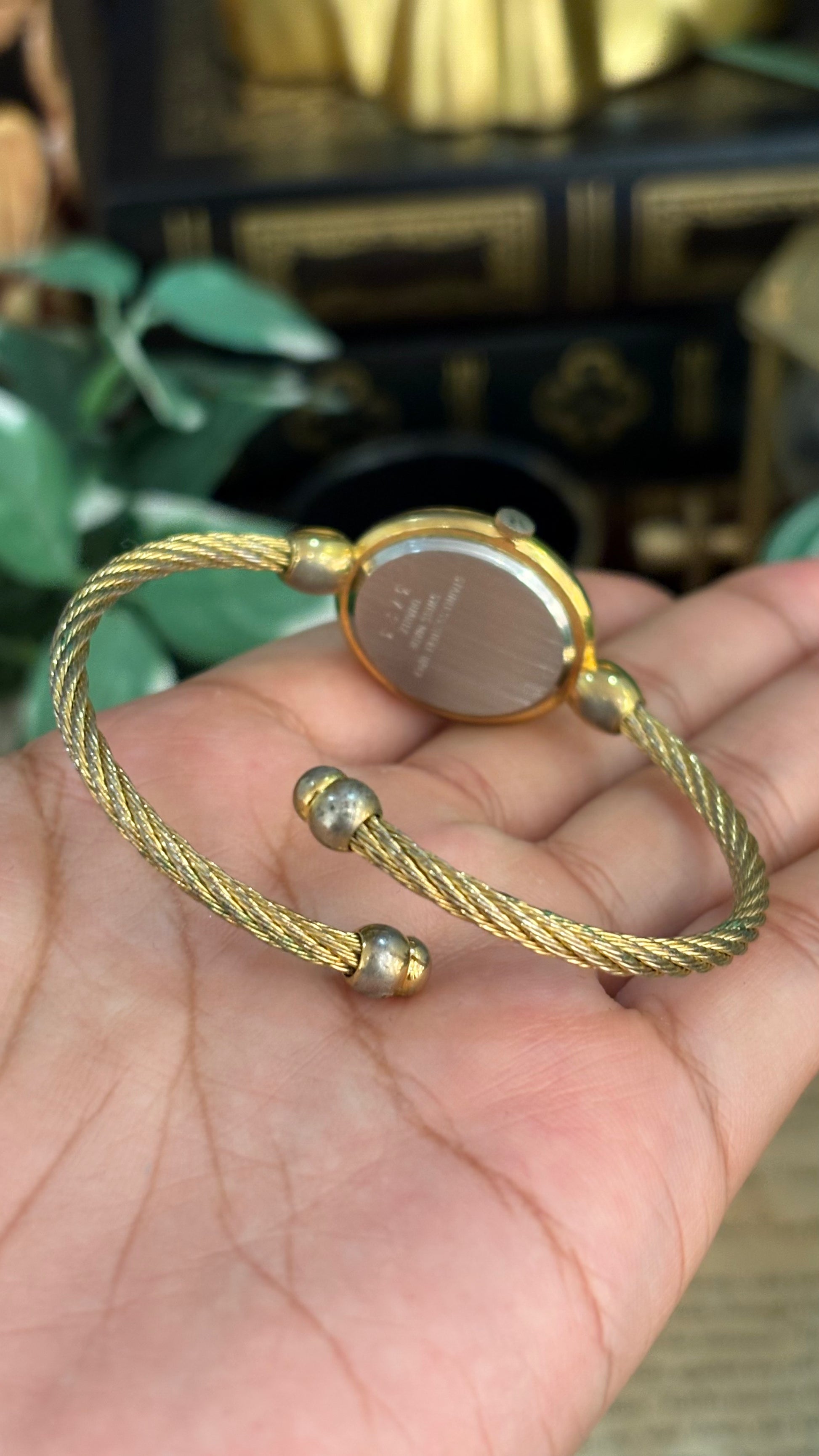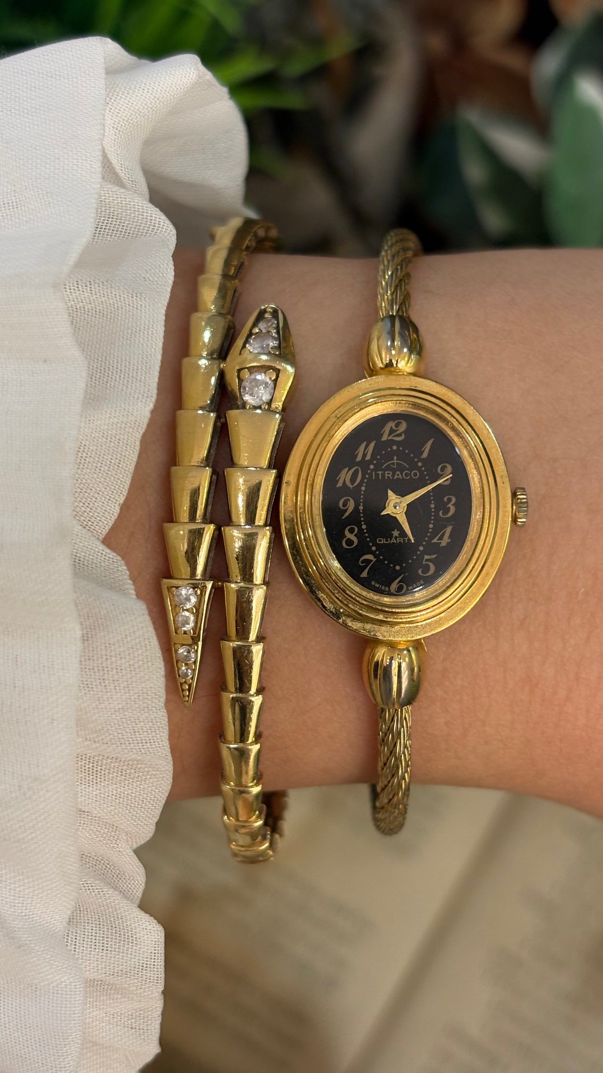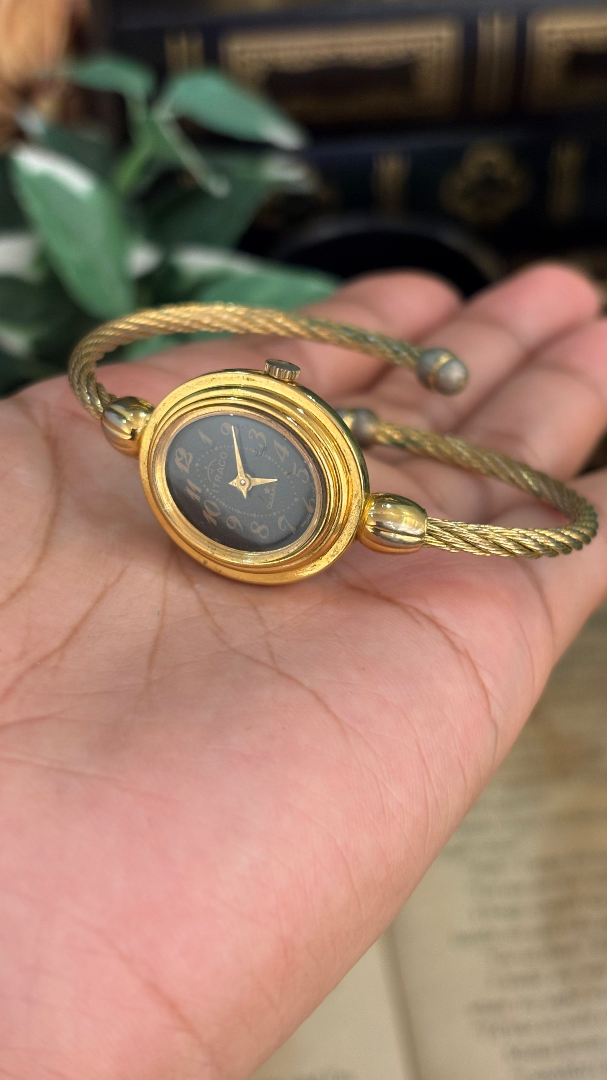 Rare Elegant Vintage Itraco Twisted Bangle Watch in Gold Tone Black Oval Dial Quartz