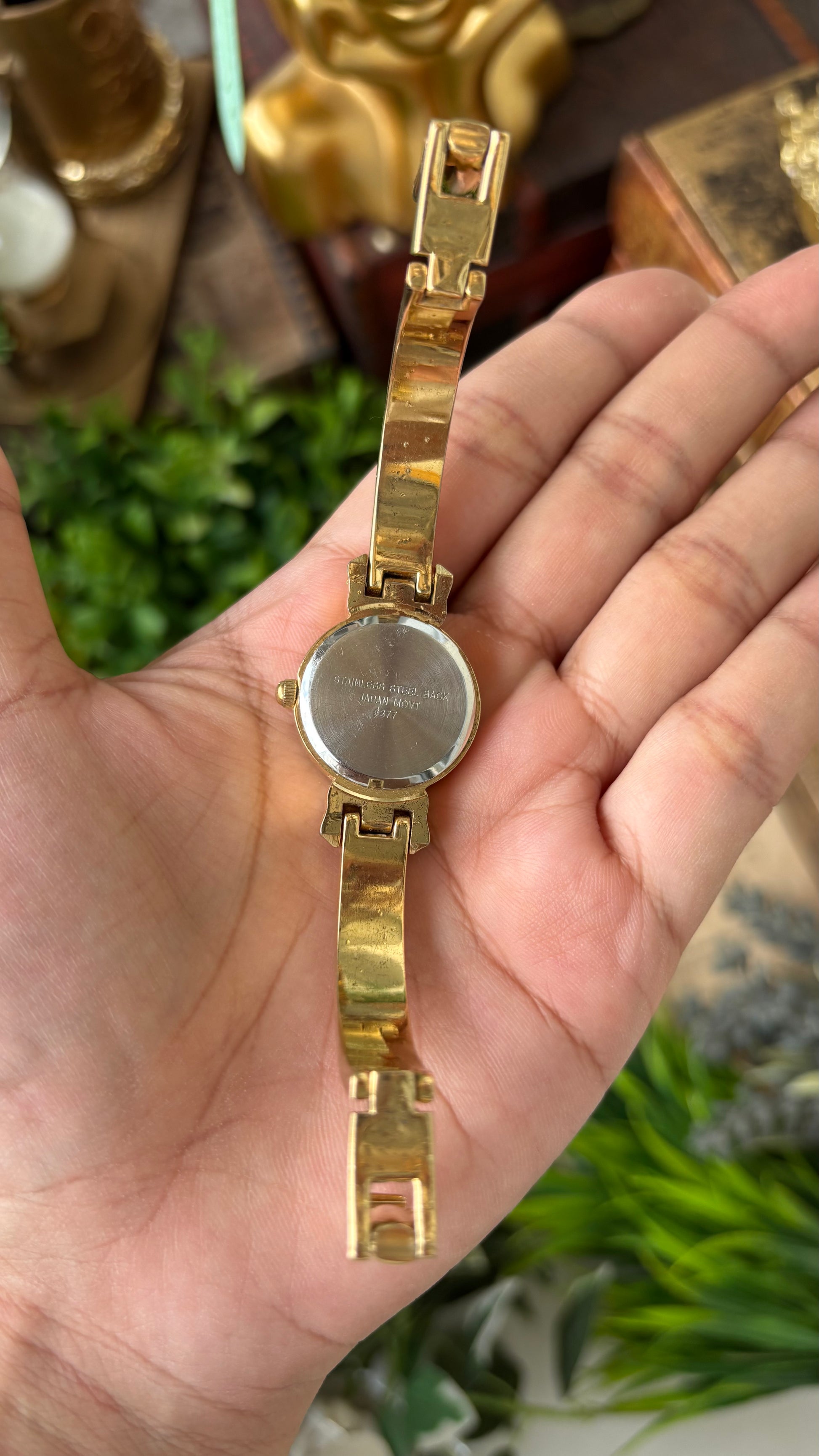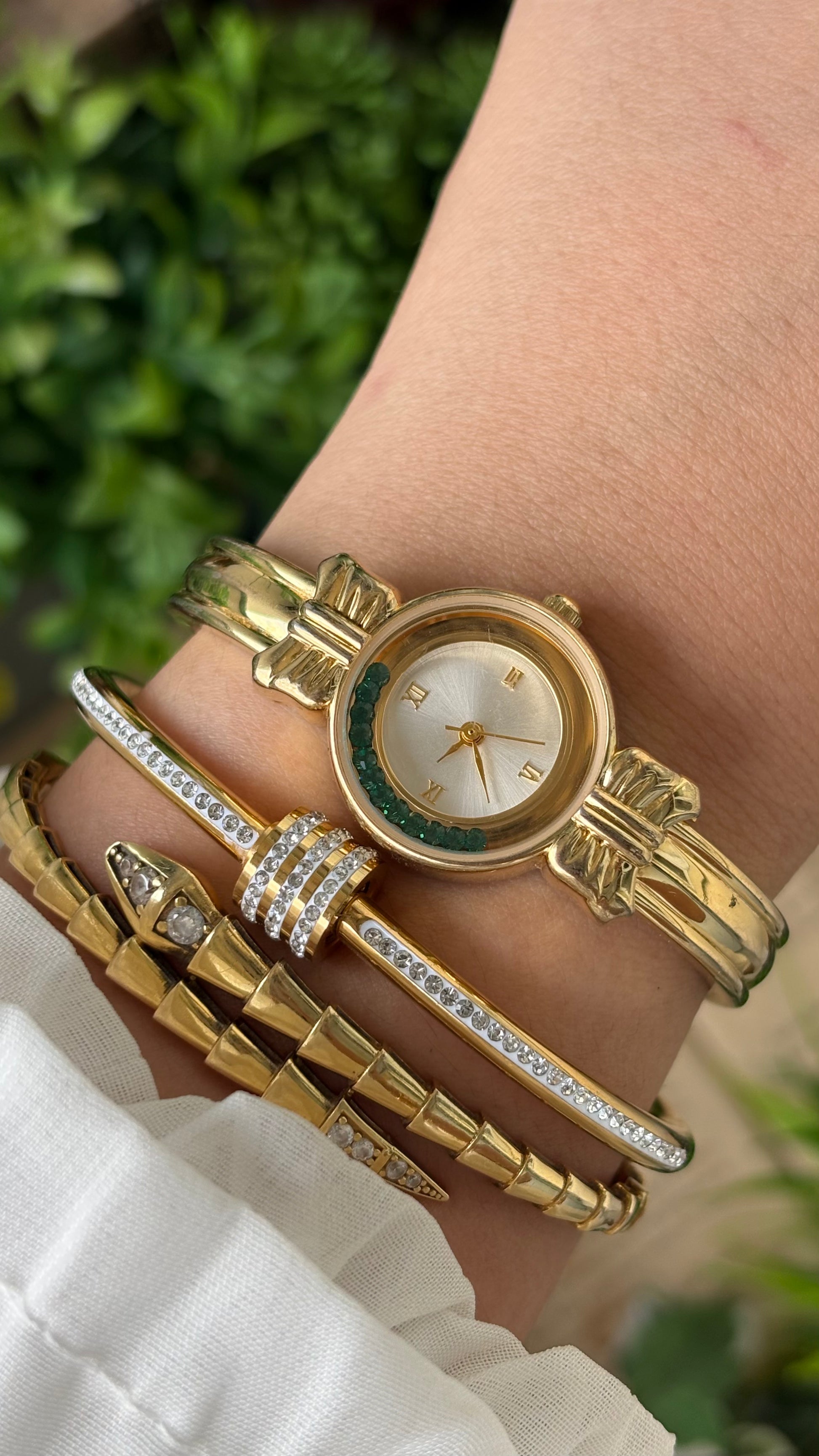 Rare Vintage Coquette Japan Quartz Dancing Green Jewels Bezel Watch in Gold Tone #00226
