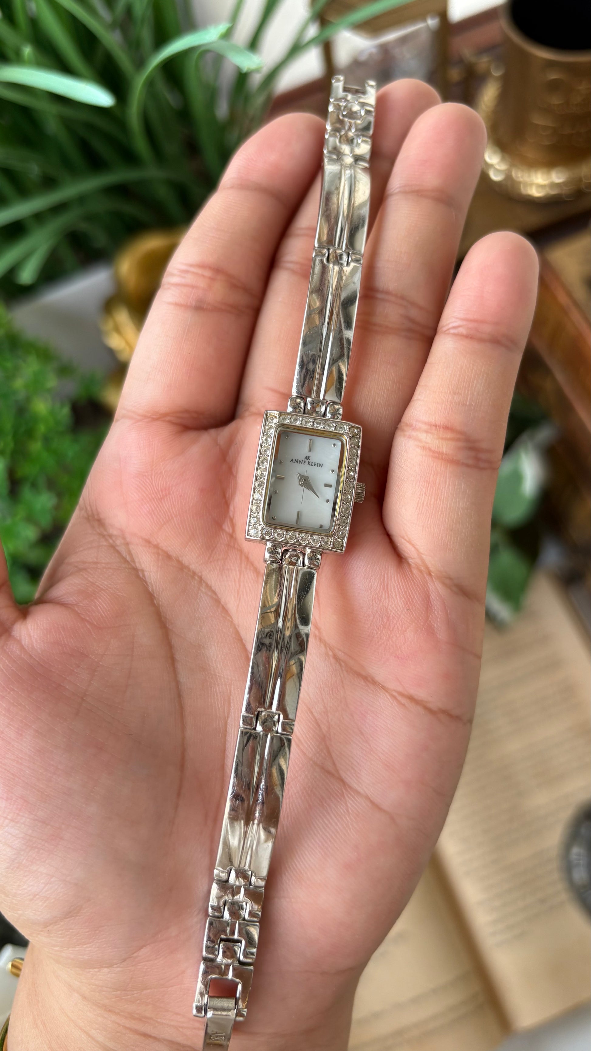 Rare Vintage Dainty Anne Klein Rhinestone Bezel Semi Bangle Watch in Silver Tone Mother of Pearl Dial Quartz