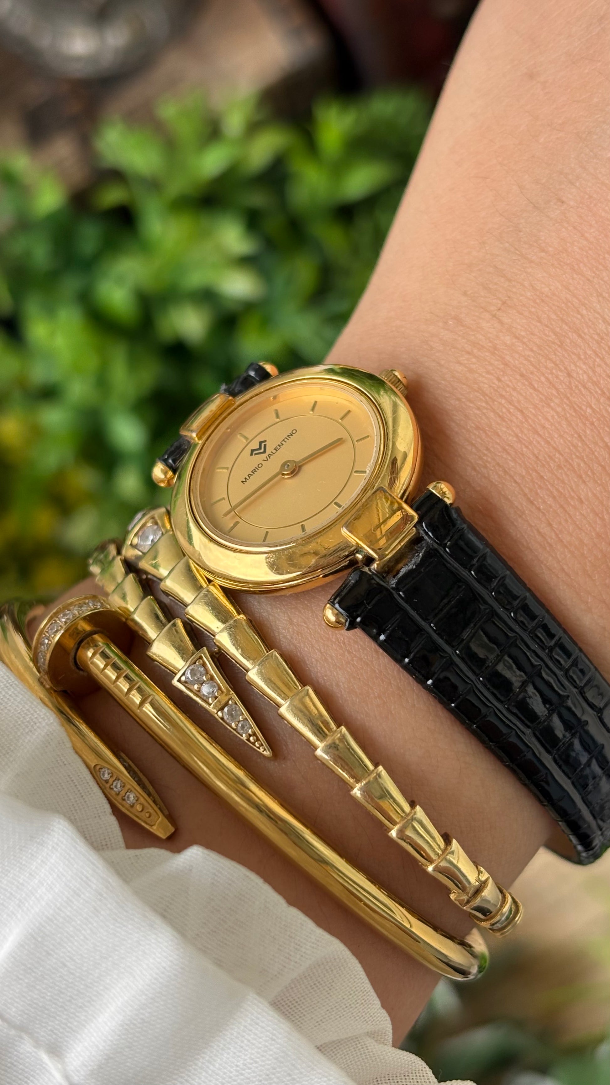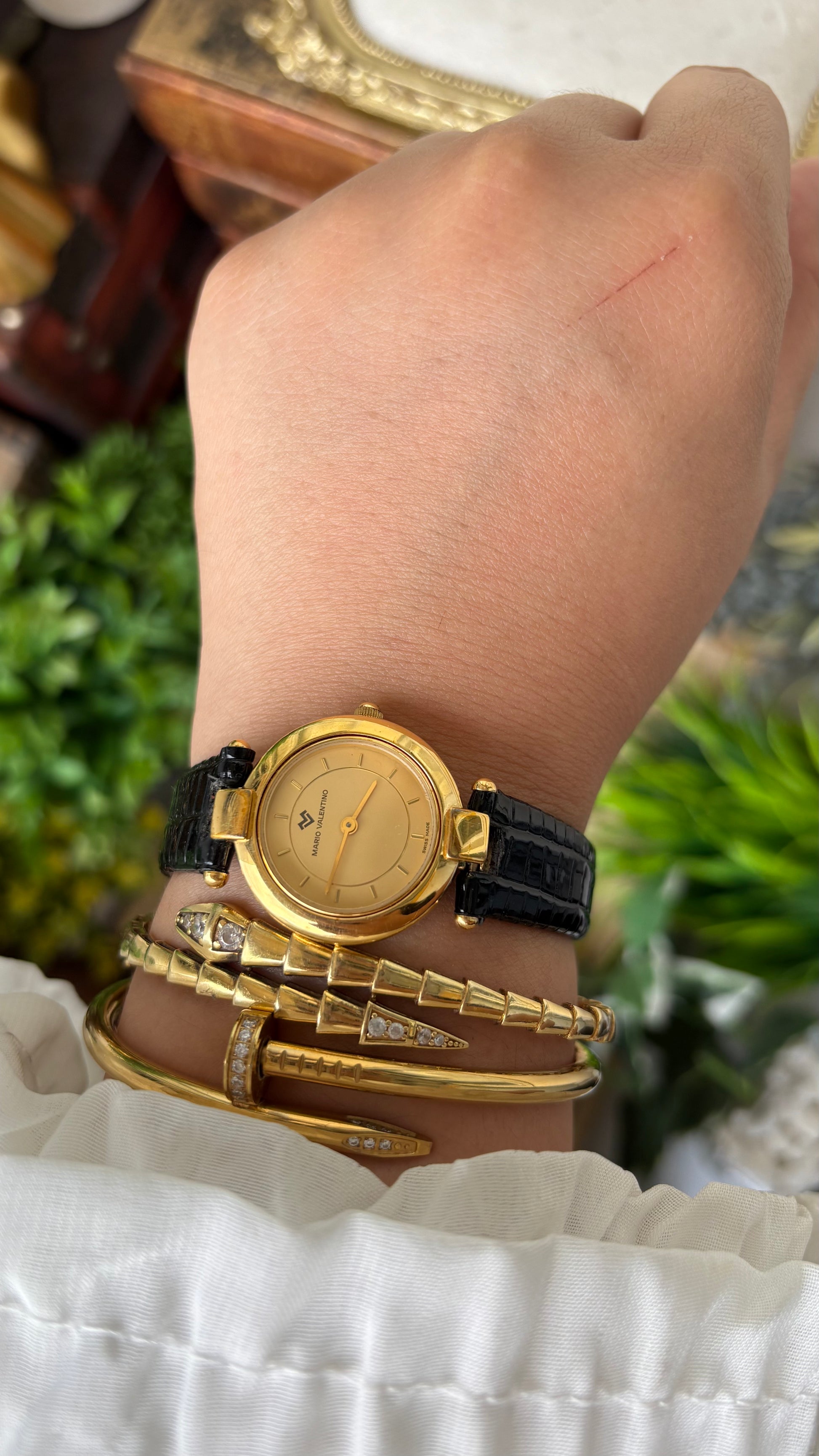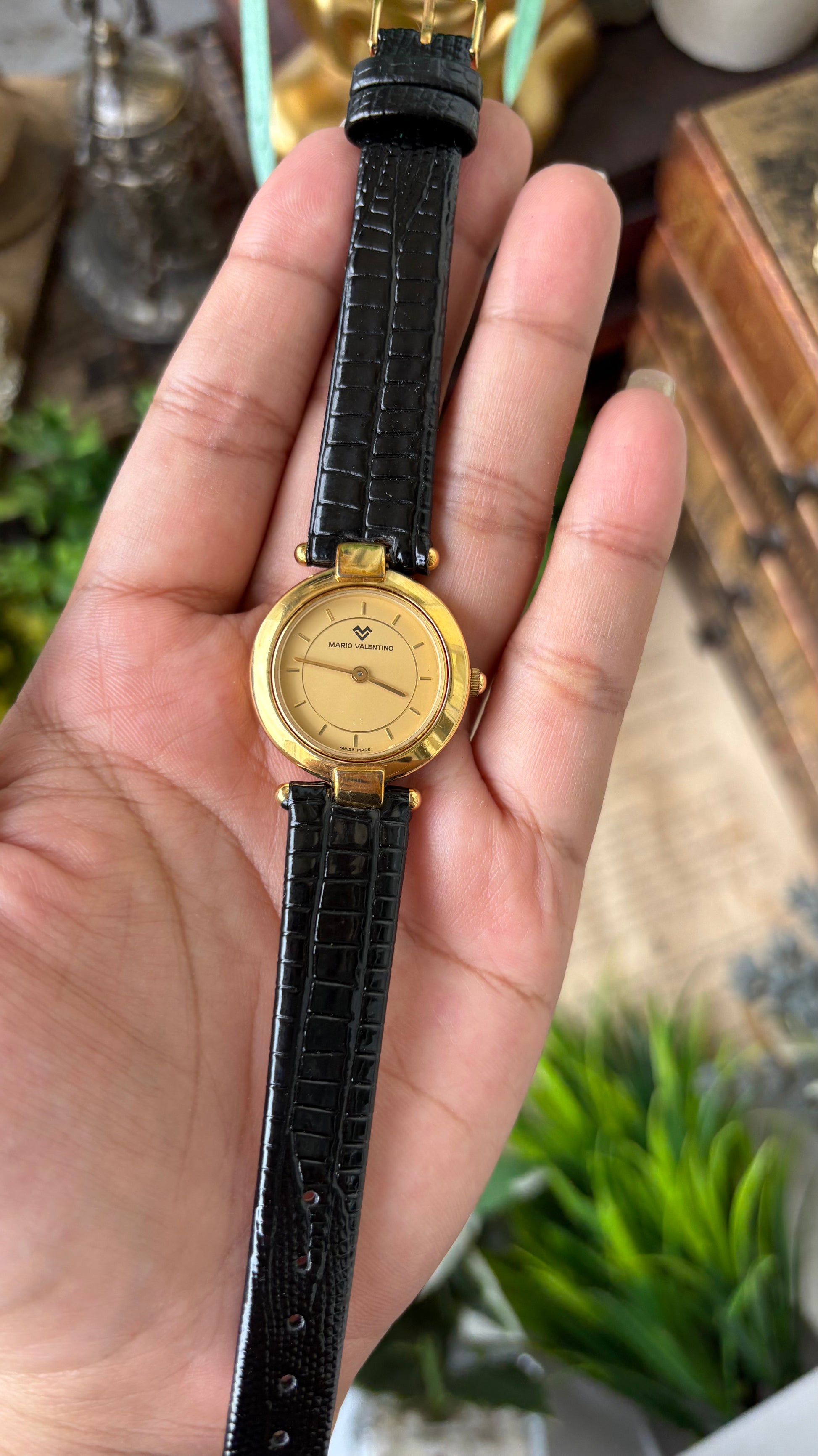 Rare Vintage Mario Valentino Swiss Elegant Minimalist Watch in Gold Tone Black Leather Gold Dial Quartz #00909