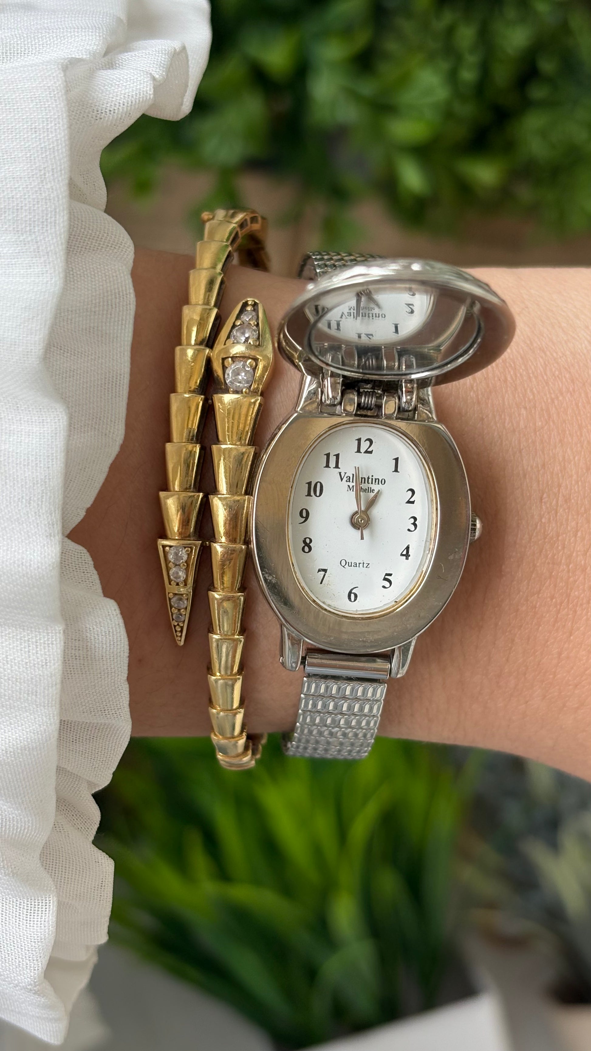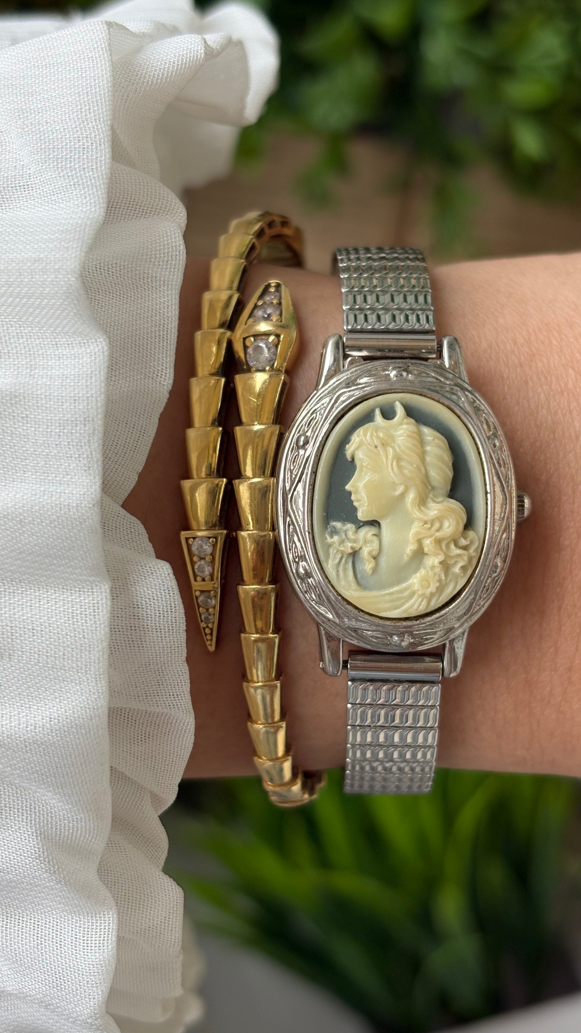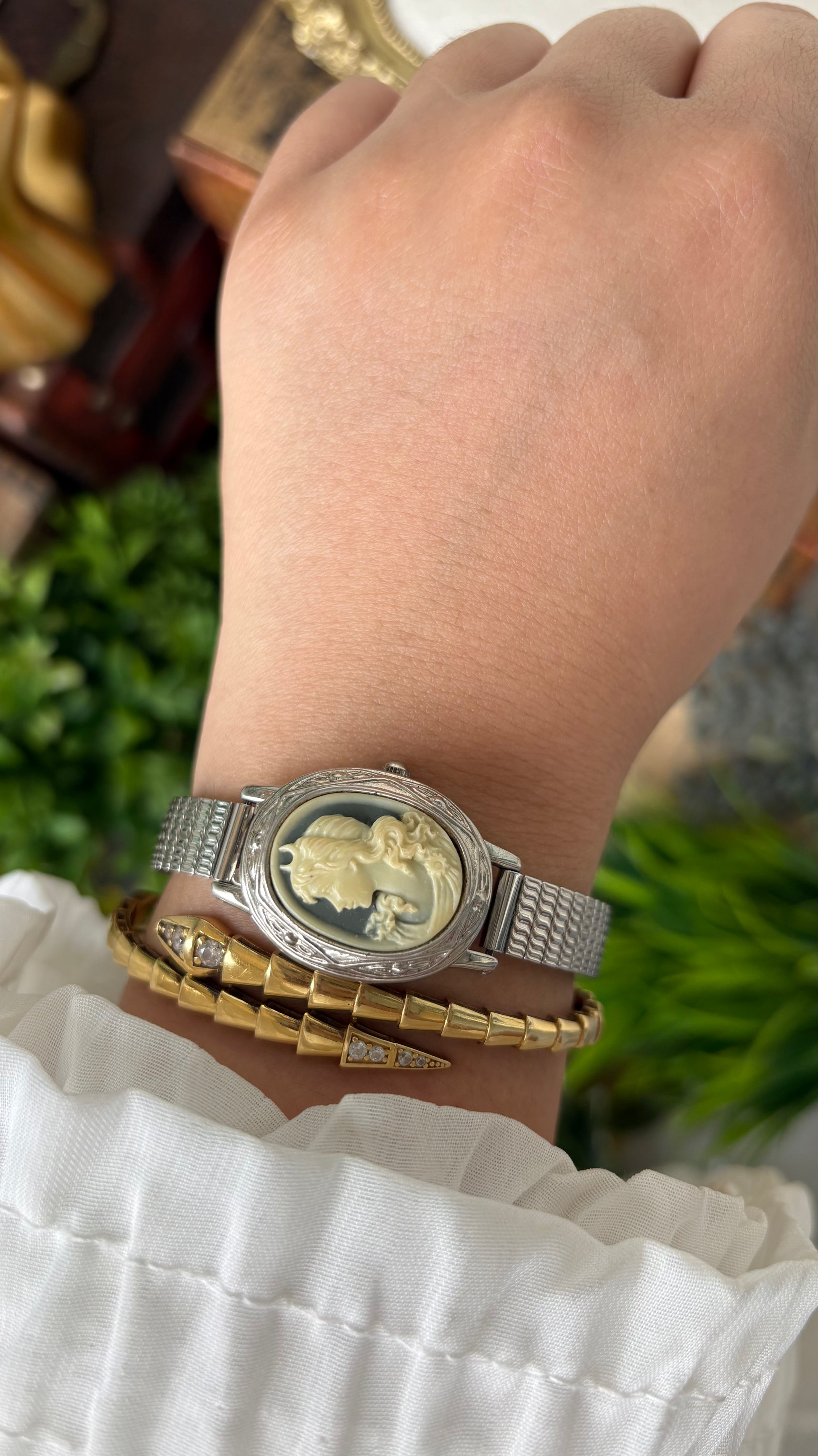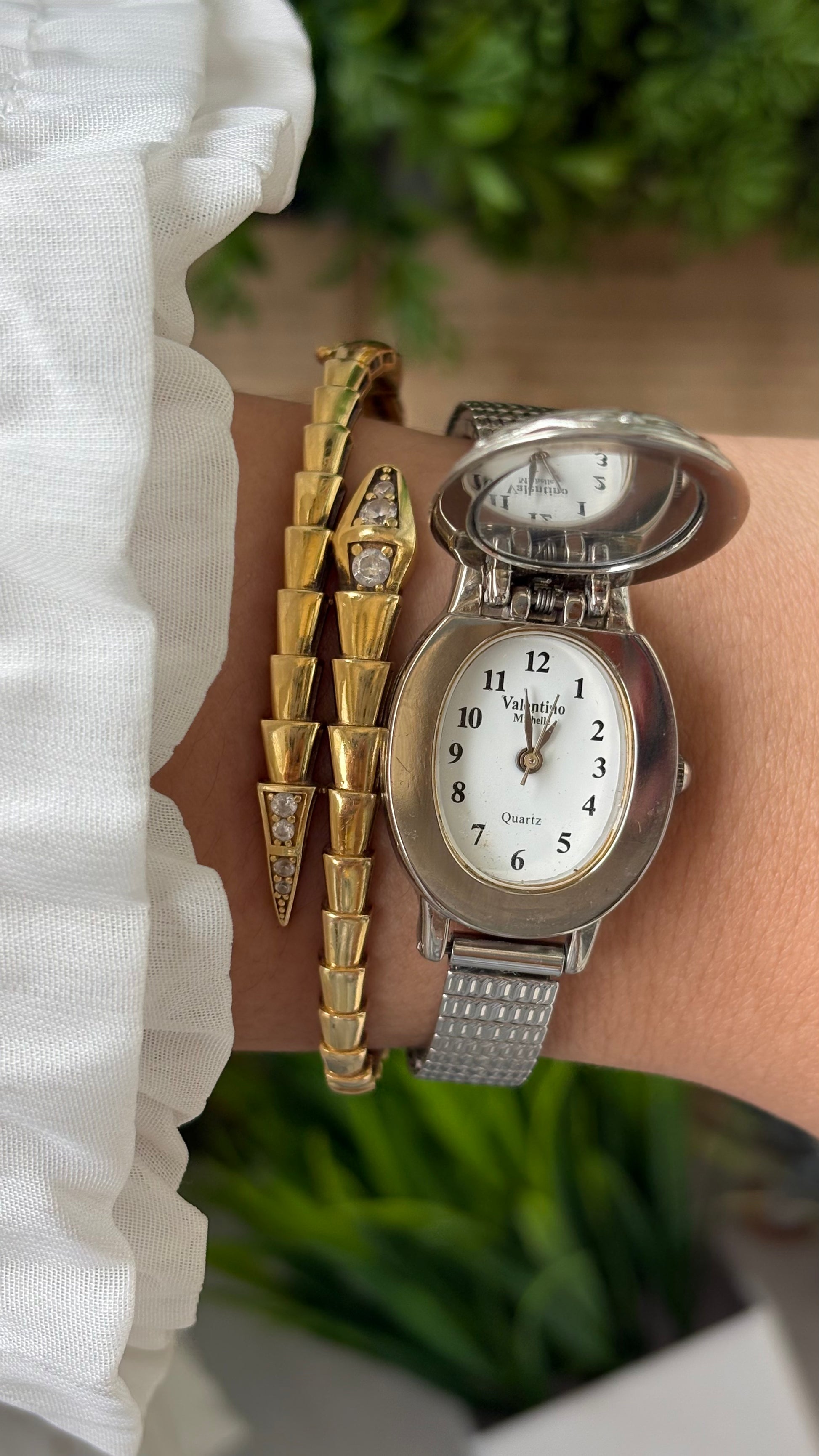 Rare Vintage Valentino Michelle Cameo Mirror Peekaboo Stretchy Band Watch in Silver Tone Quartz #00627