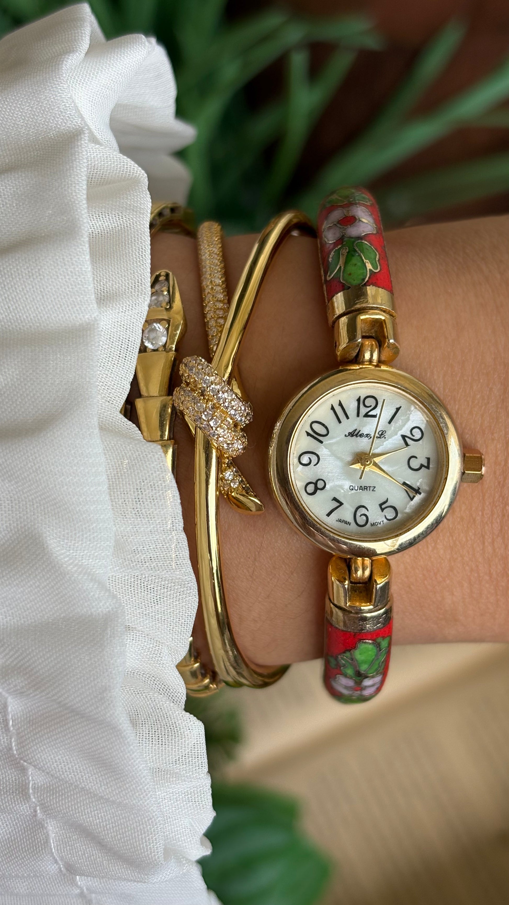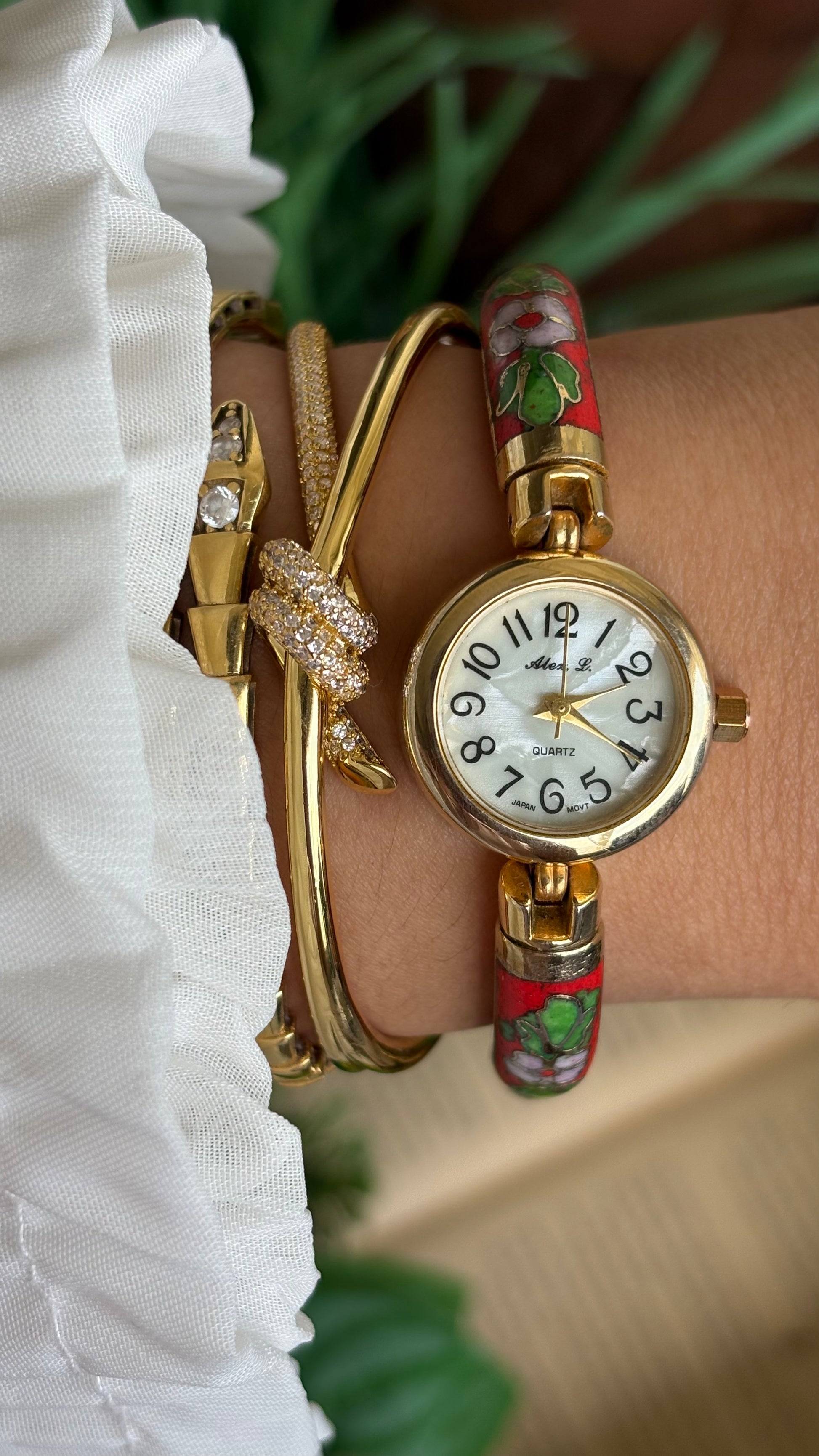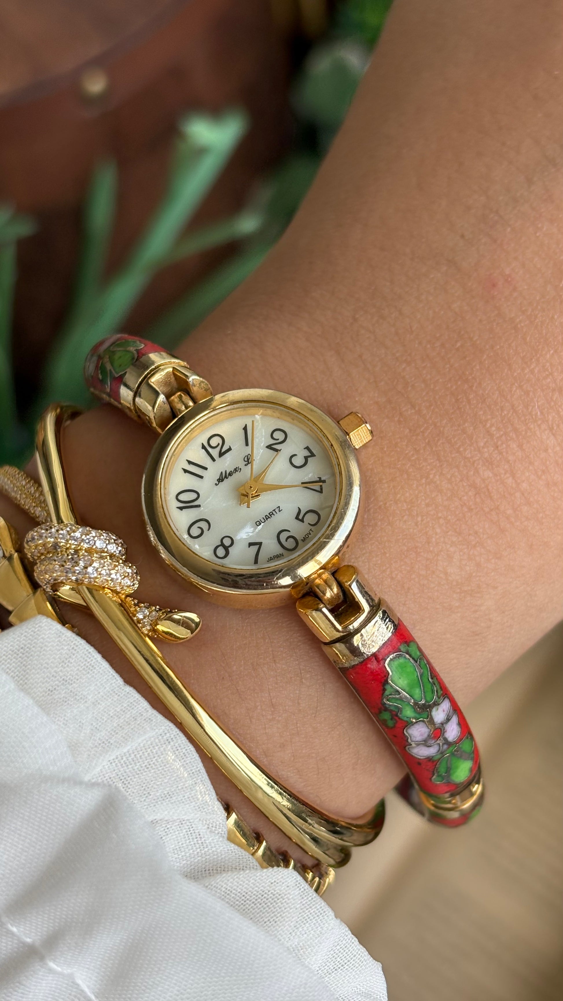 Extremely Rare Vintage L. Alex Cloisonné Watch in Gold Tone Pearl Dial Ancient Deco