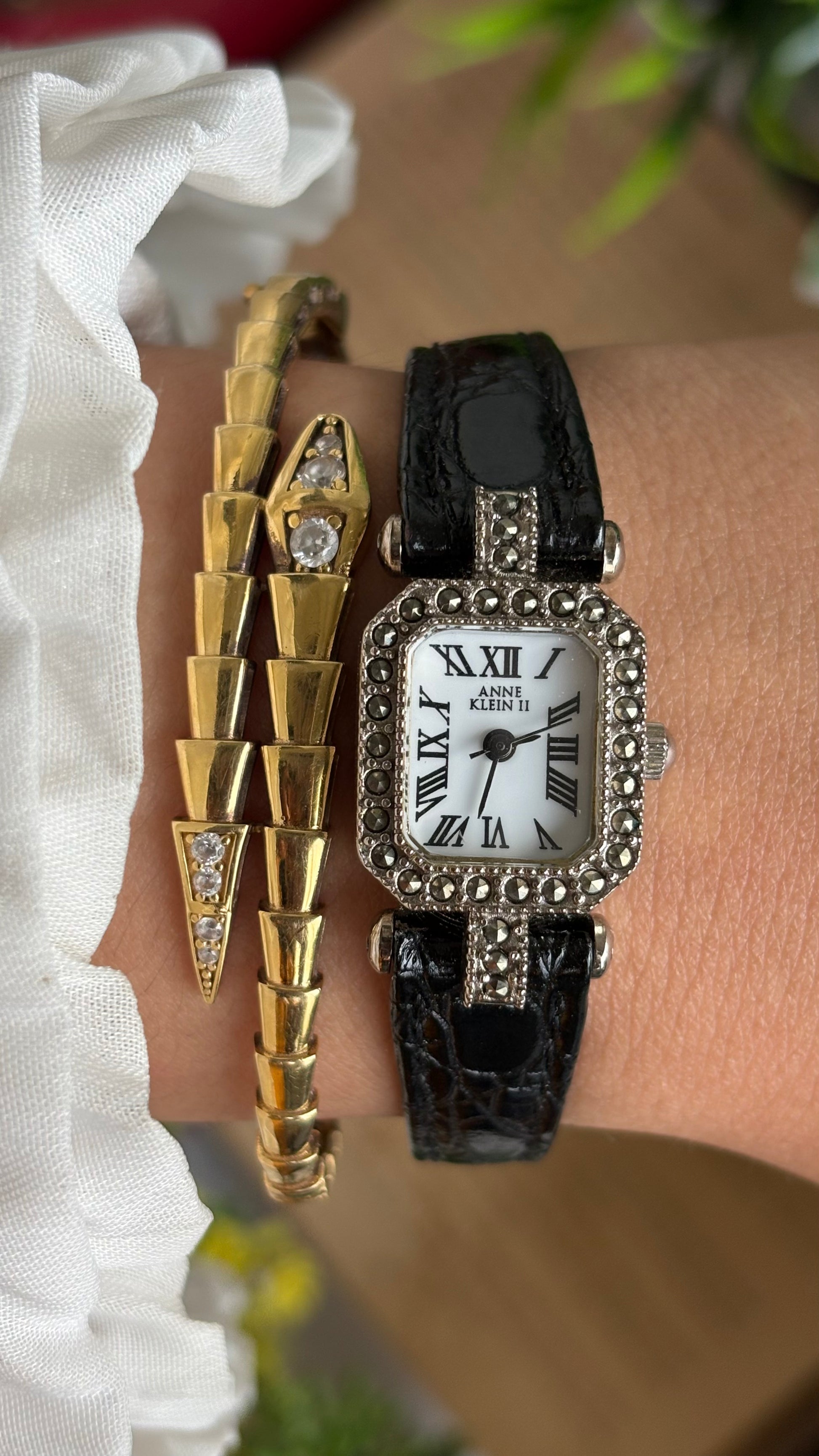Vintage Anne Klein Mini Tank Bejeweled Watch in Black Leather Strap