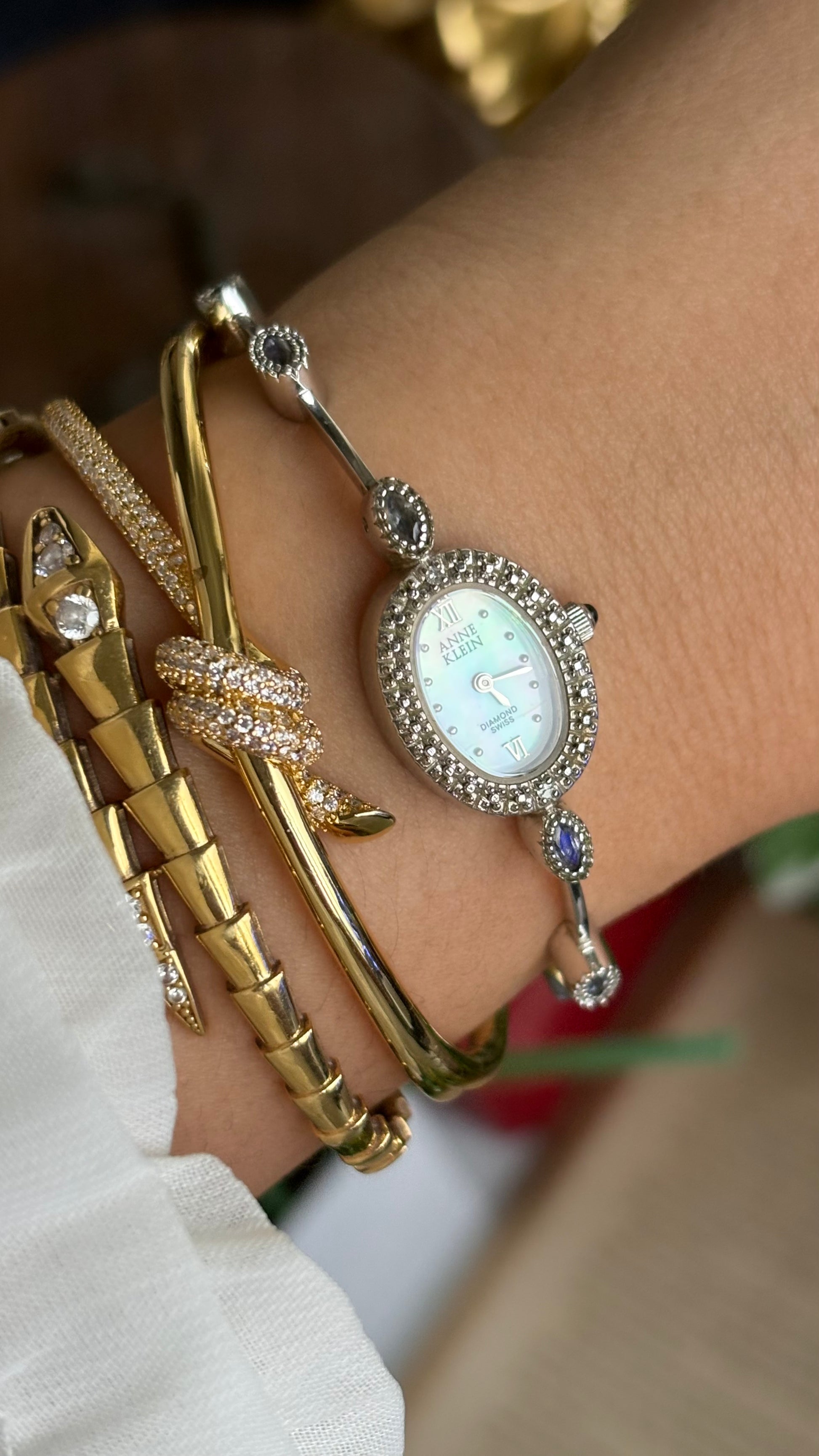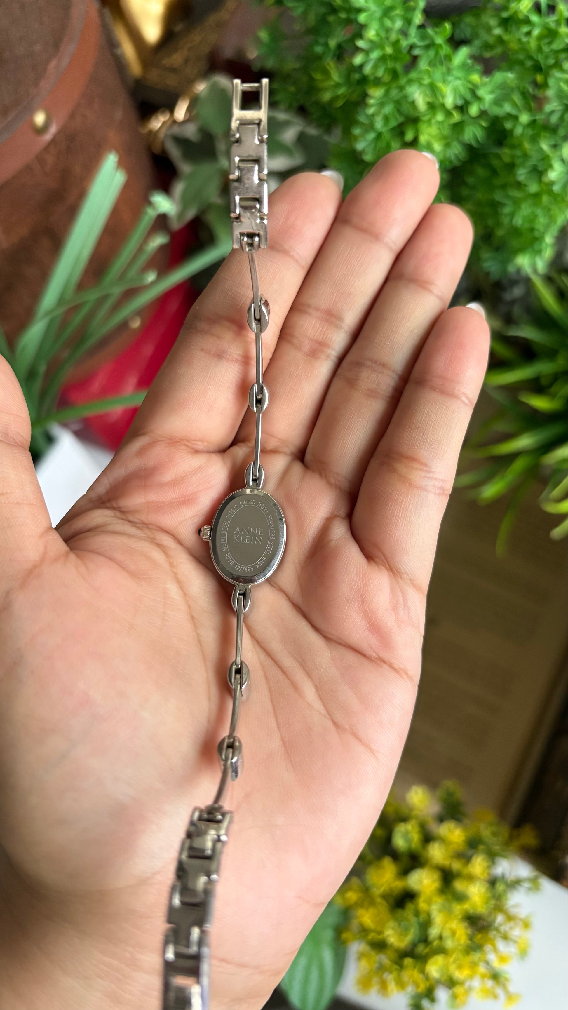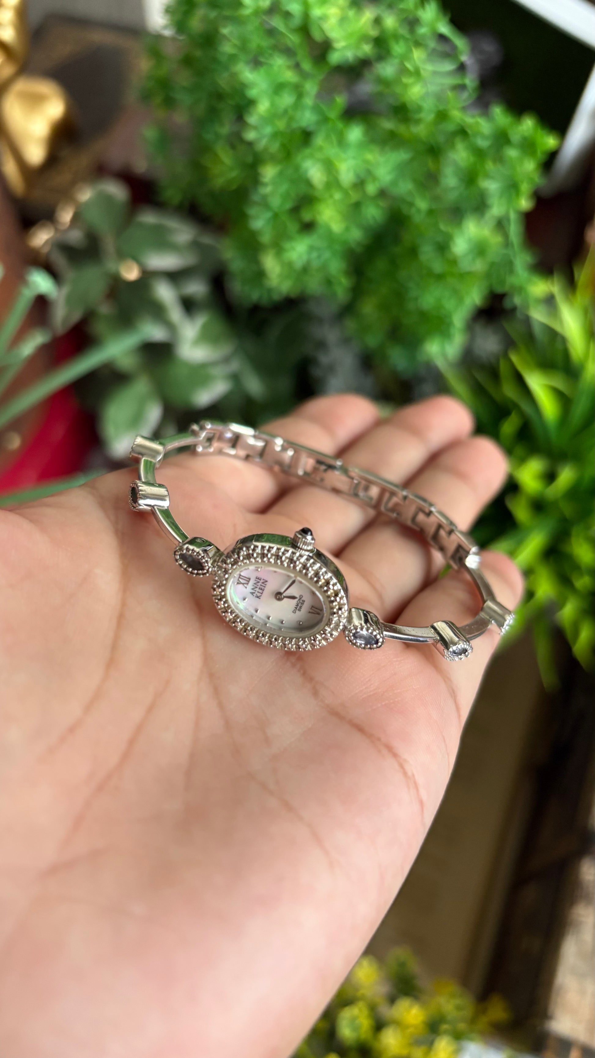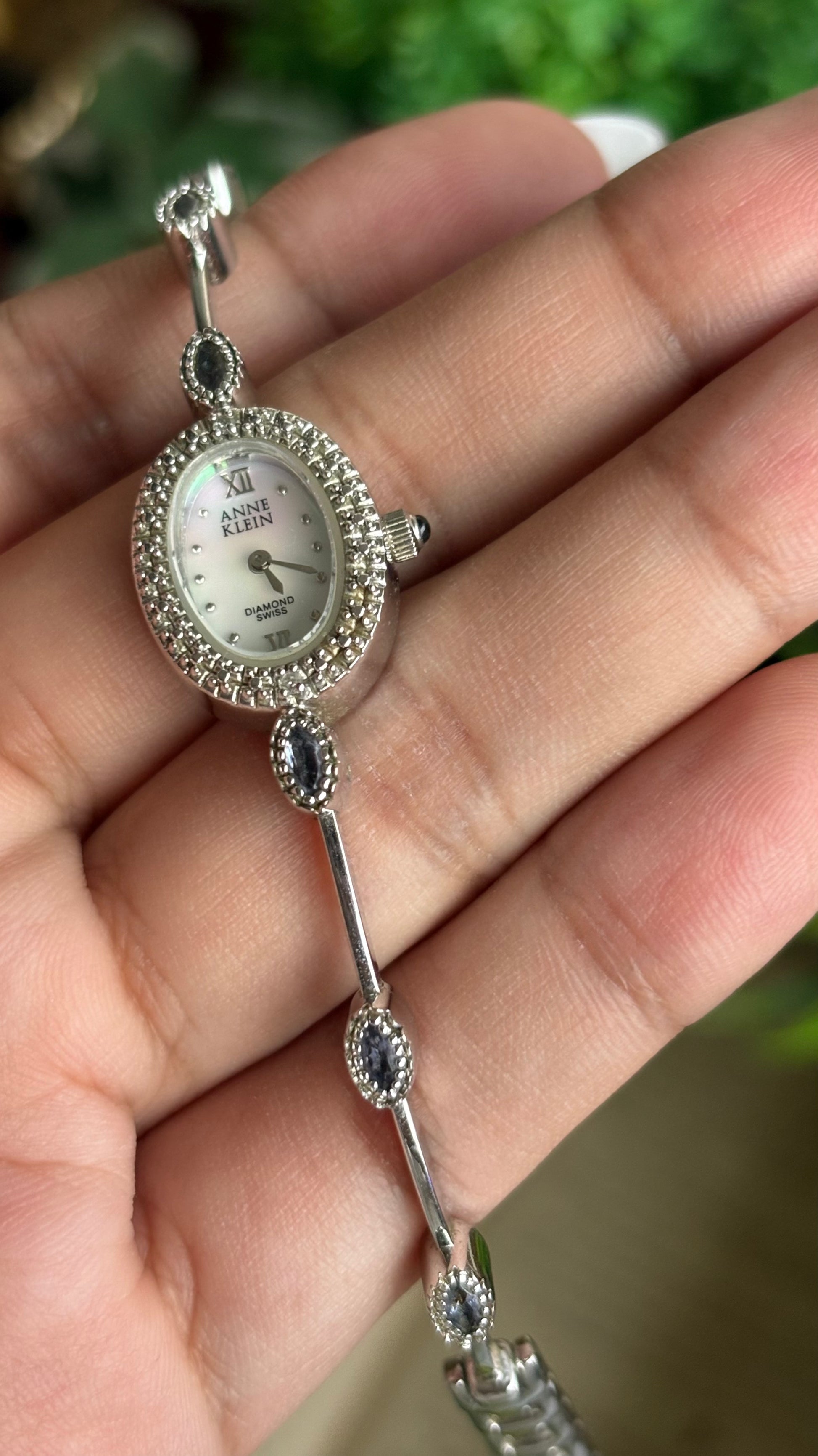 Vintage Anne Klein Swiss Watch in Silver Tone with Genuine Diamonds and Spinel Stone Mother of Pearl Dial