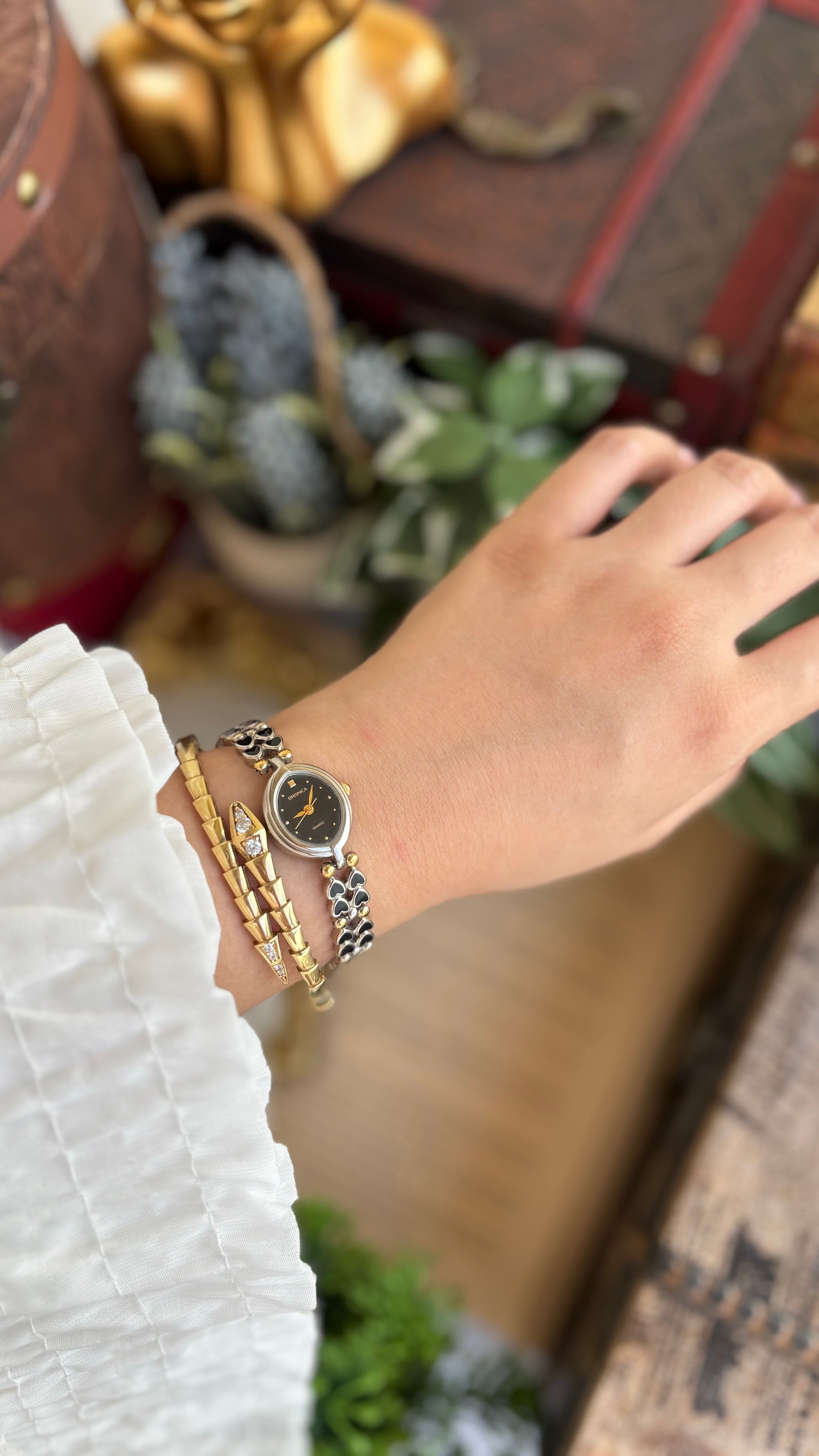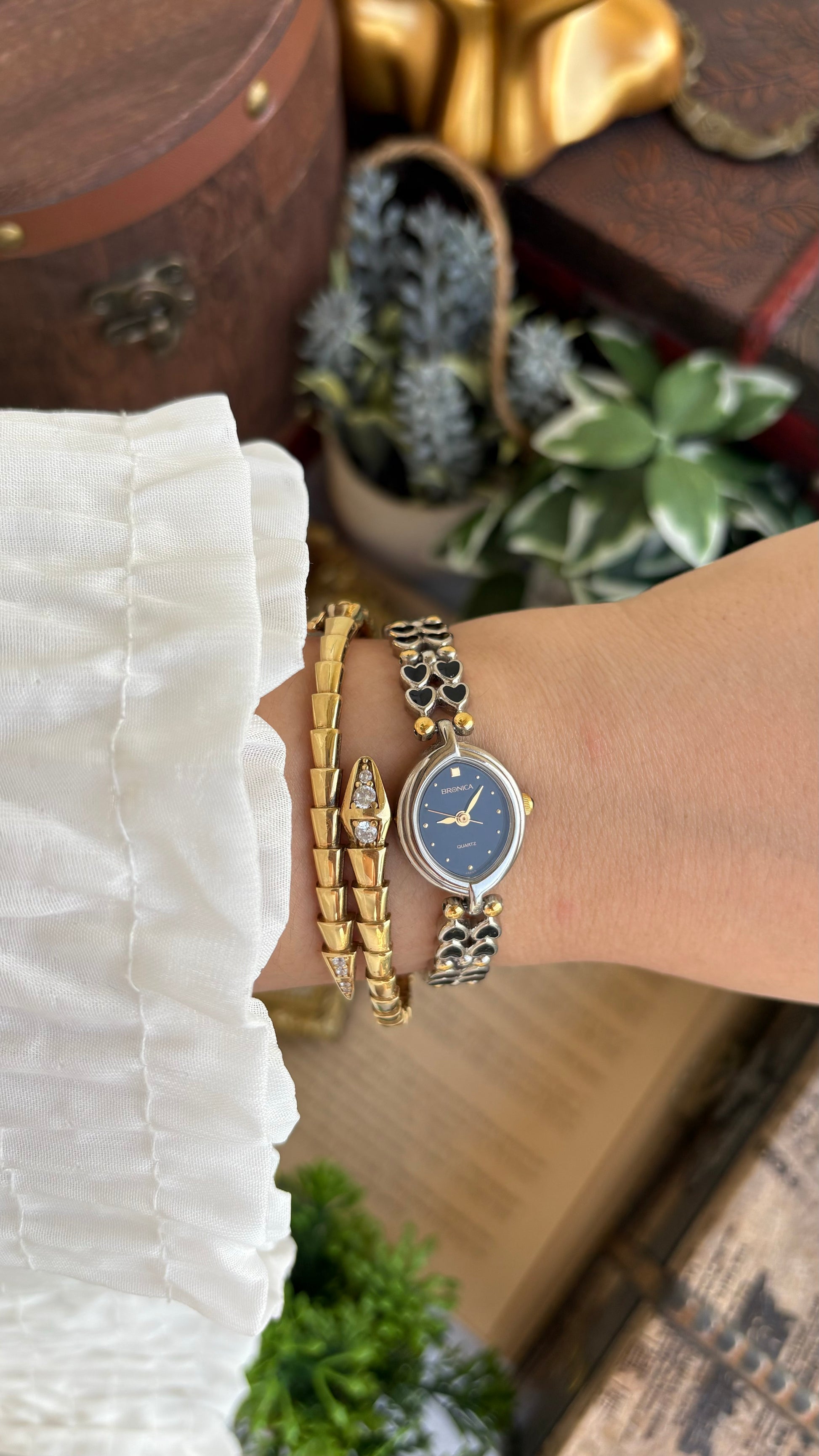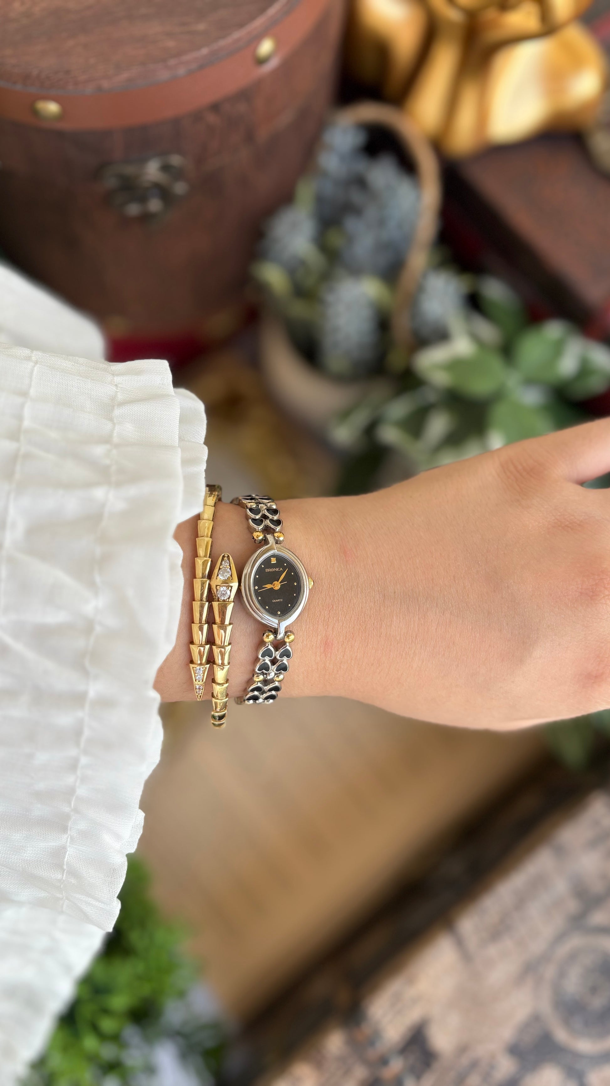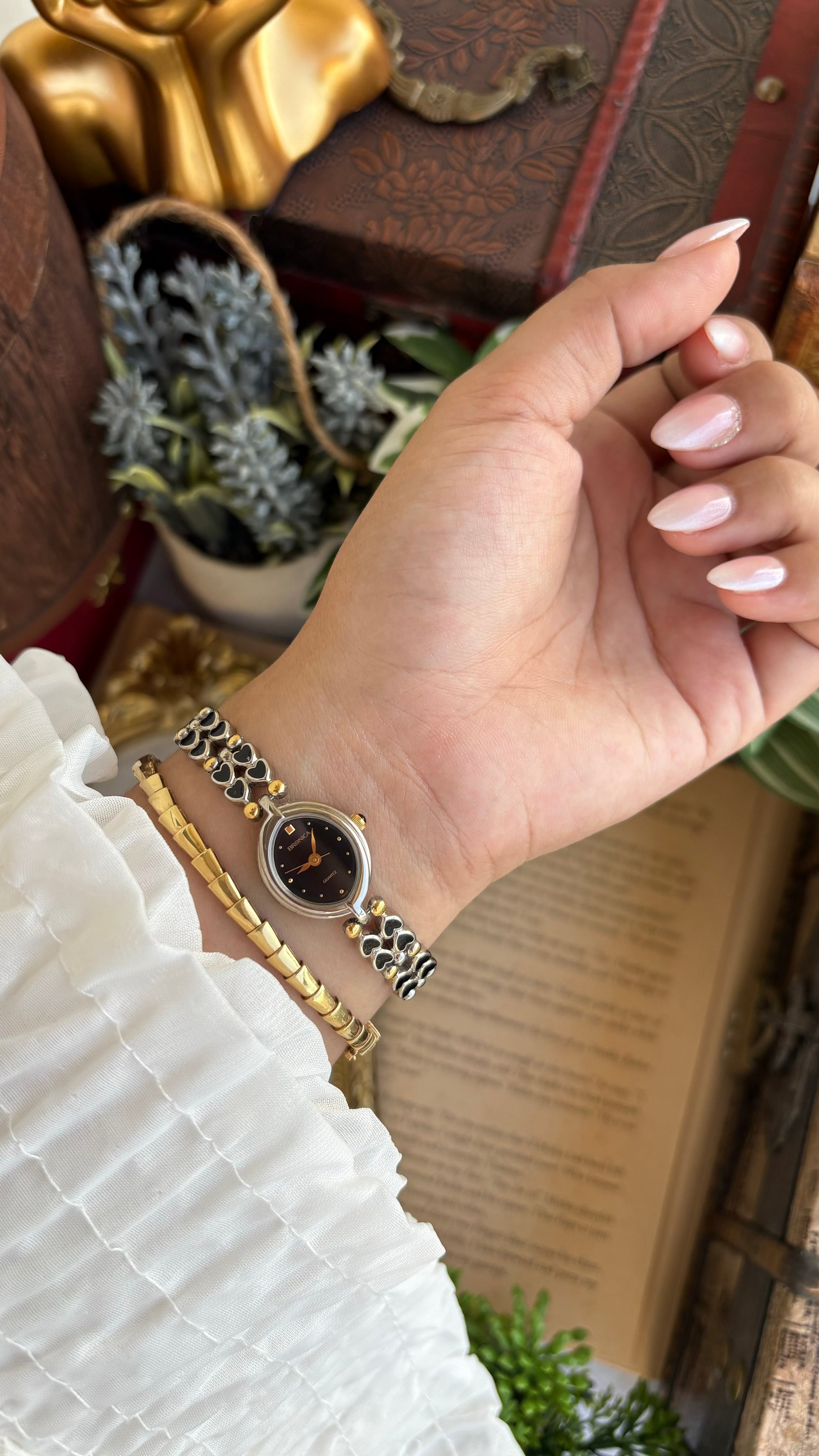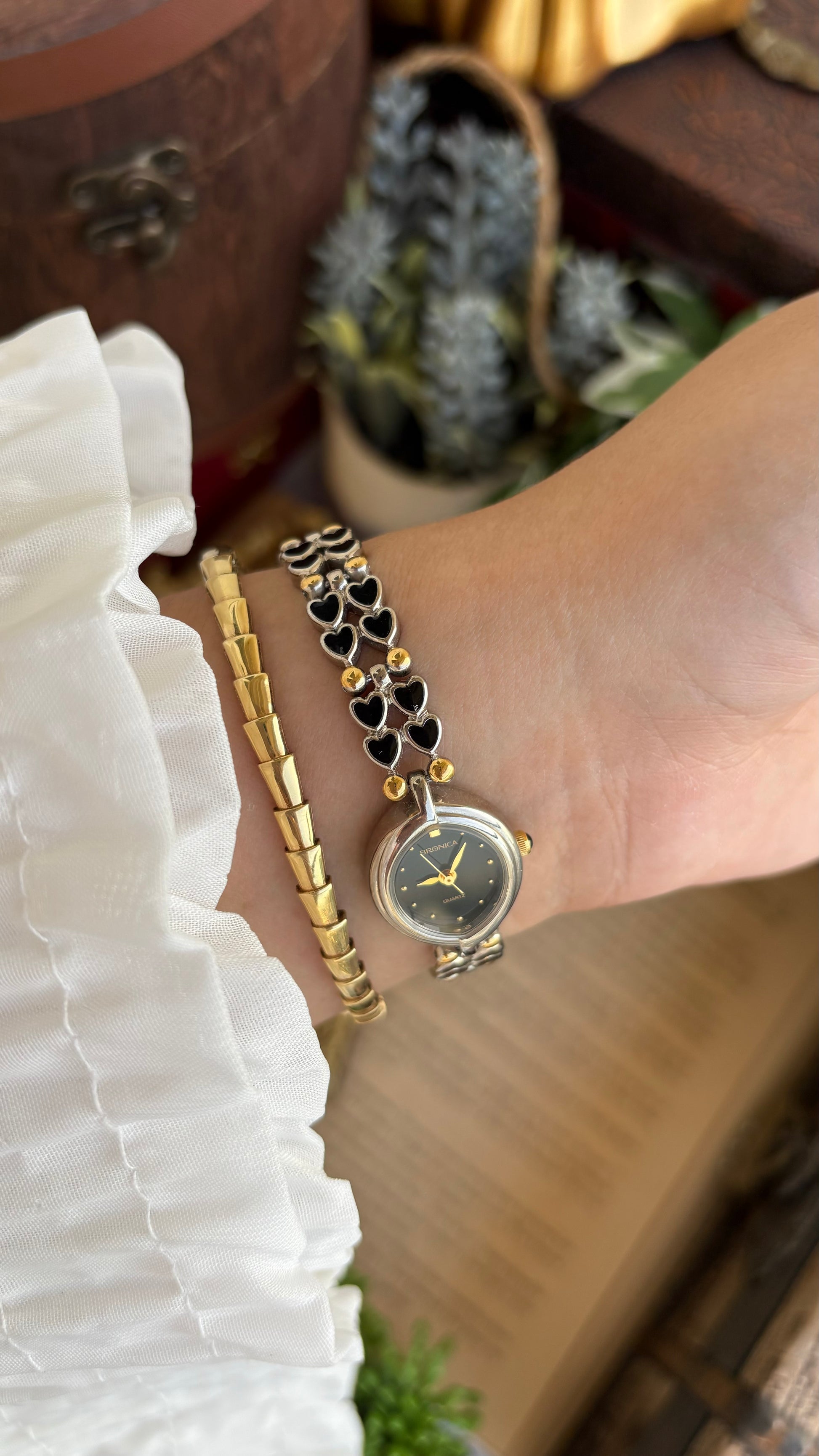 Rare Vintage Bronica Japan Almond Shape Watch in Two-Tone Heart Straps