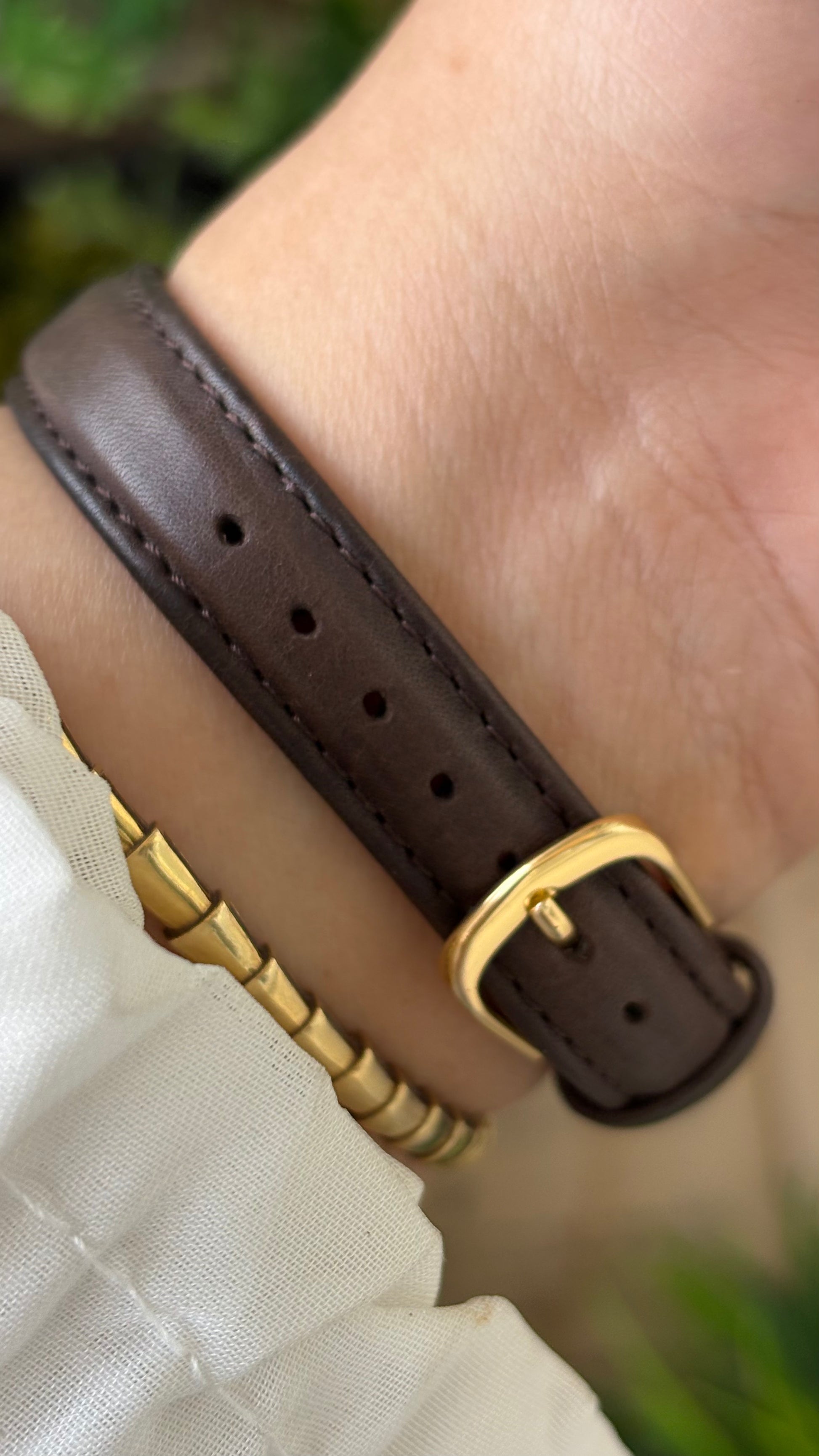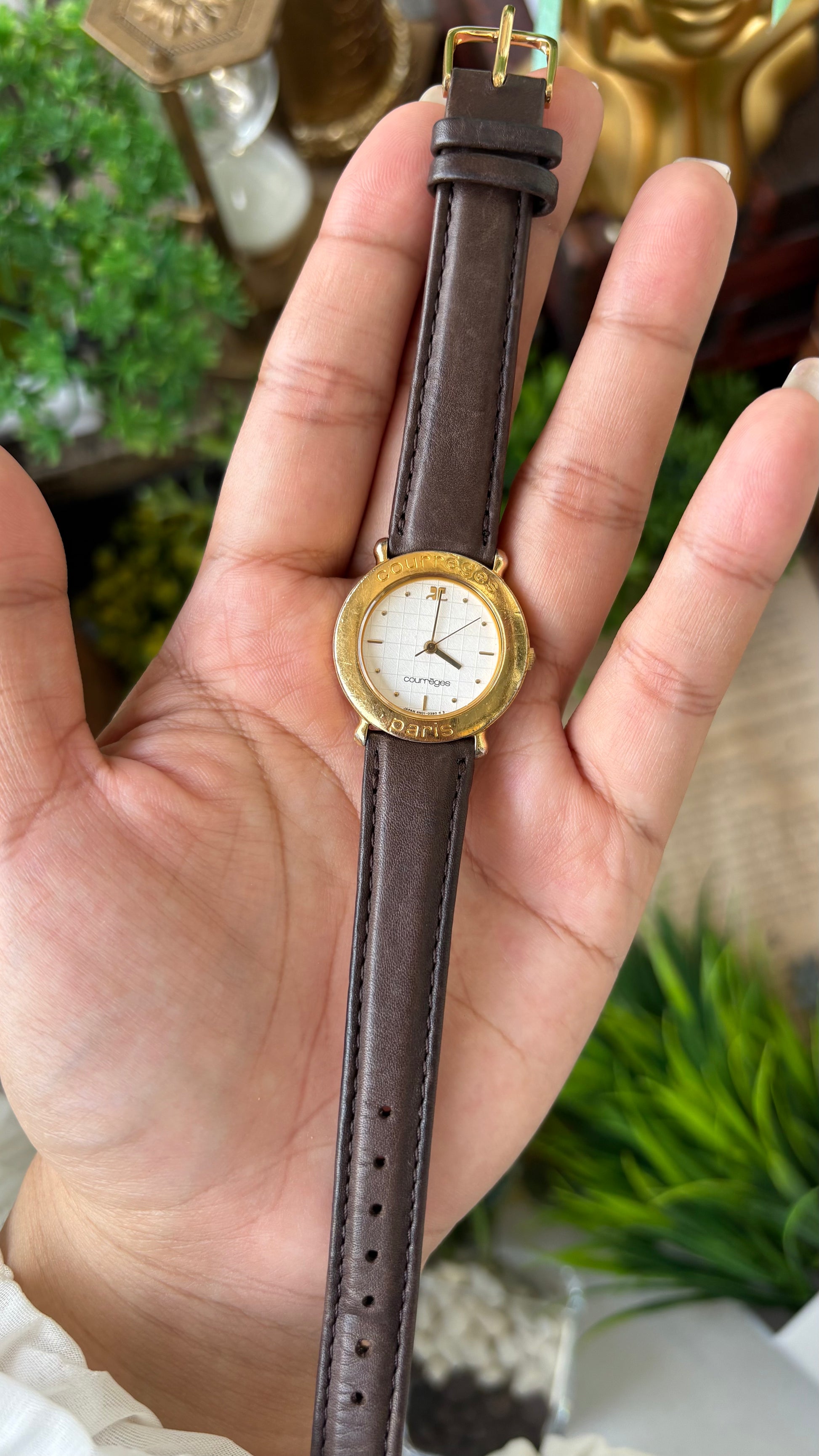 Vintage Courreges Paris Engraved Bezel Watch in Gold Tone Brown Leather Grid Dial Quartz #00604