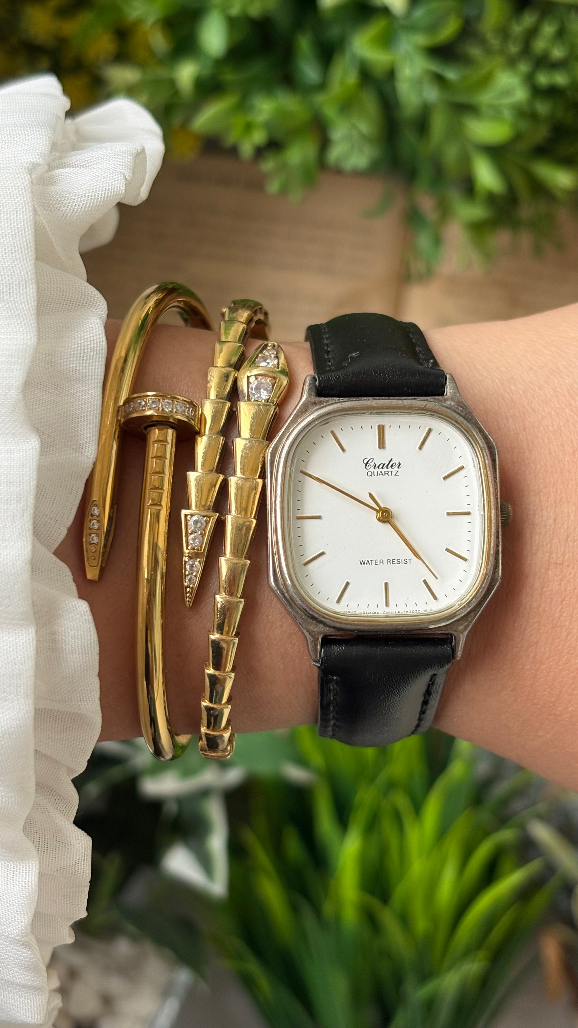 Vintage Crater Minimalist Tank Watch in Silver Tone Black Leather Quartz #00936