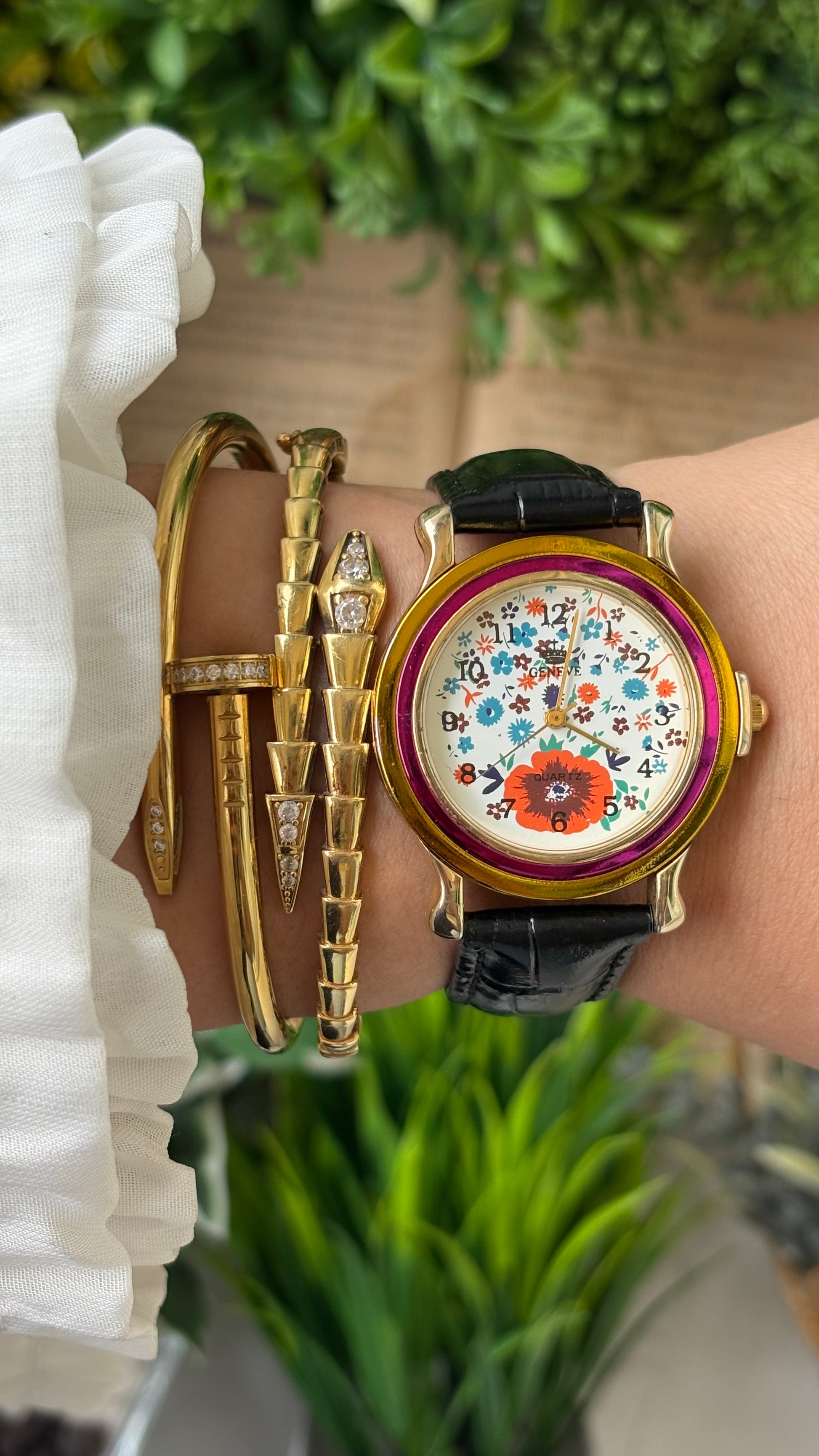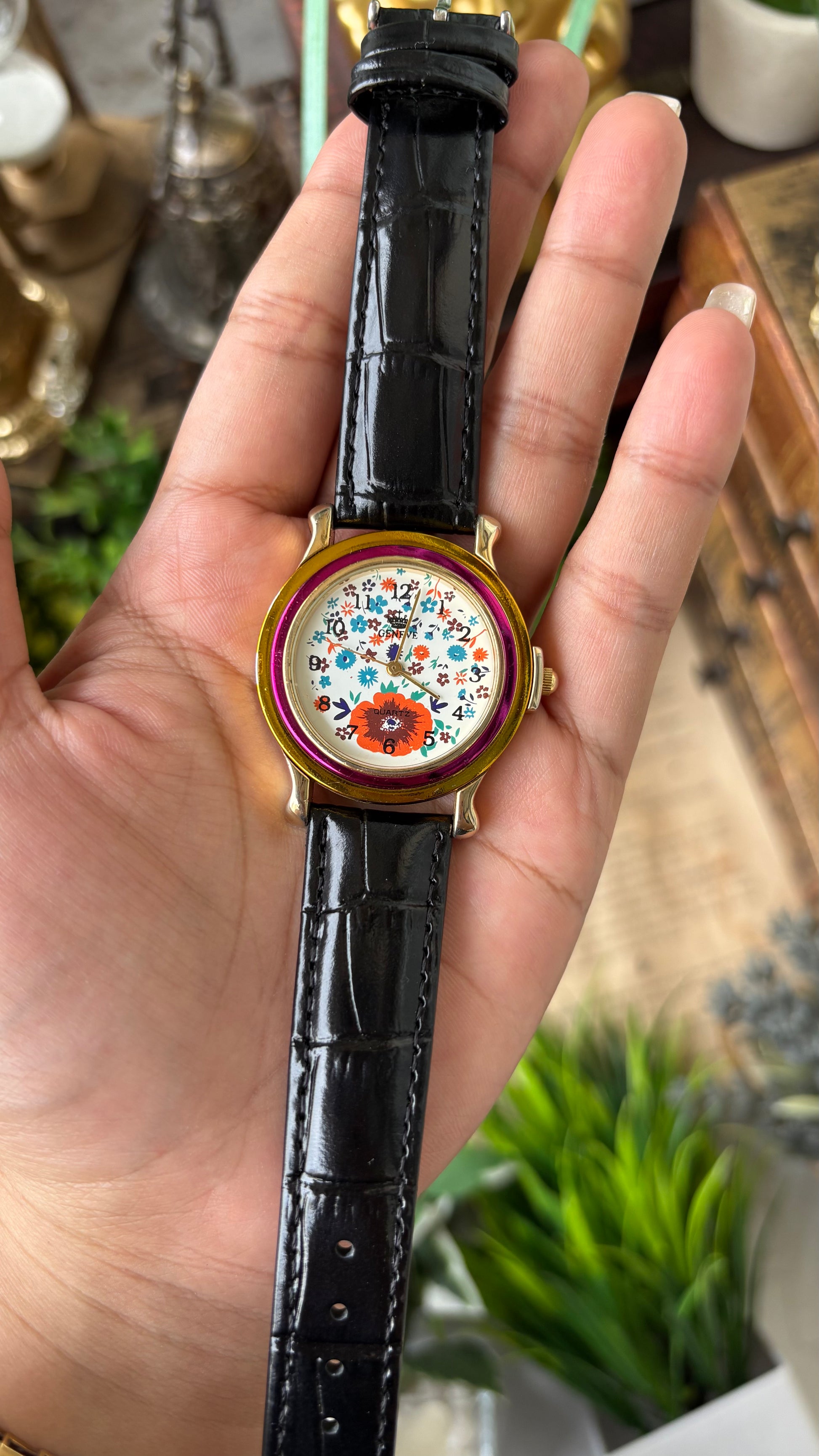 Vintage Cute Geneve Floral Art Deco Pink Line Bezel Accent Watch in Gold Tone Quartz #00923
