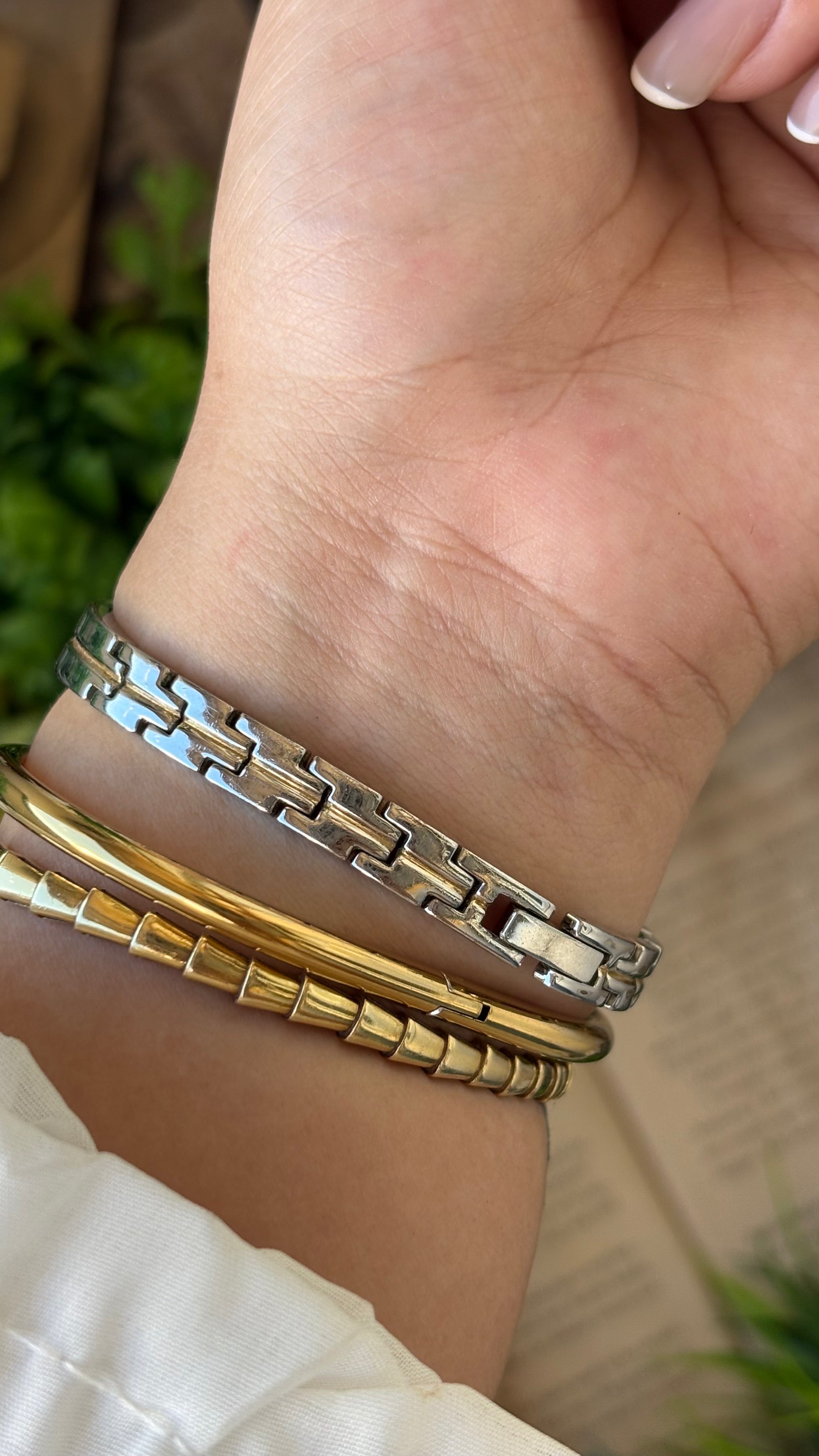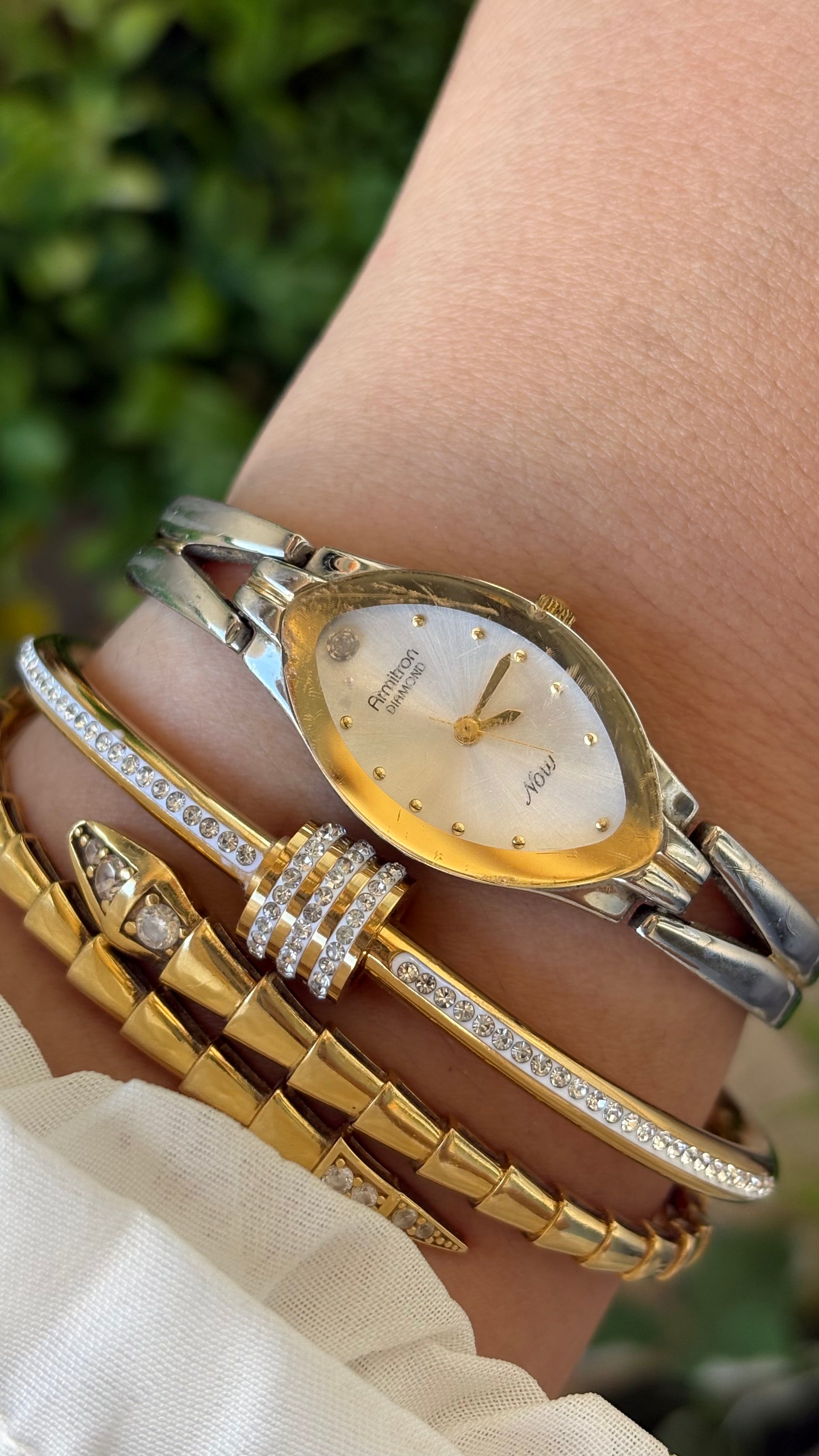 Vintage Dainty Armitron Now Elegant Gold Mirror Bezel Semi-Bangle Watch in Two-Tone Almond Dial with Diamond Quartz #00277