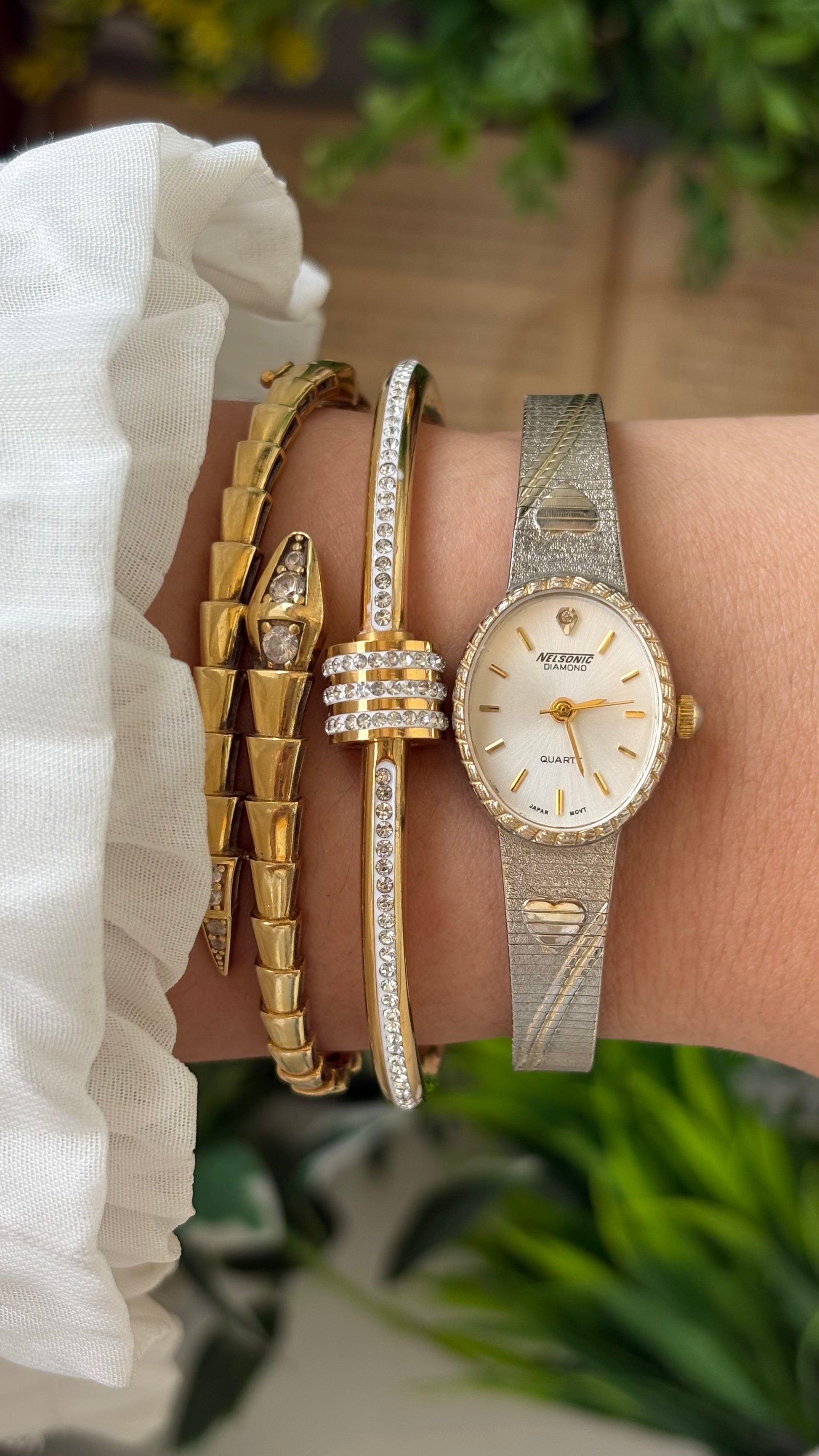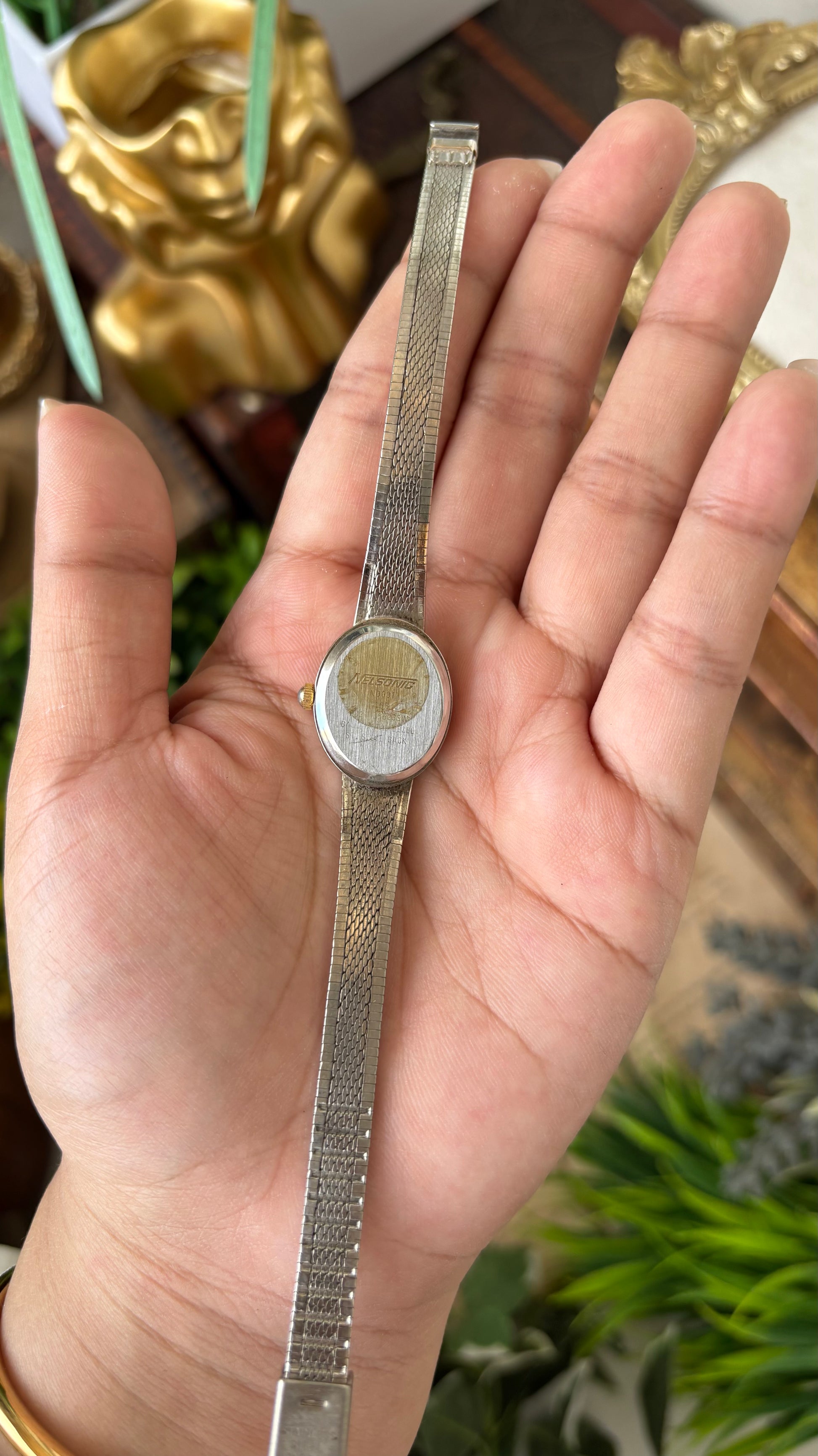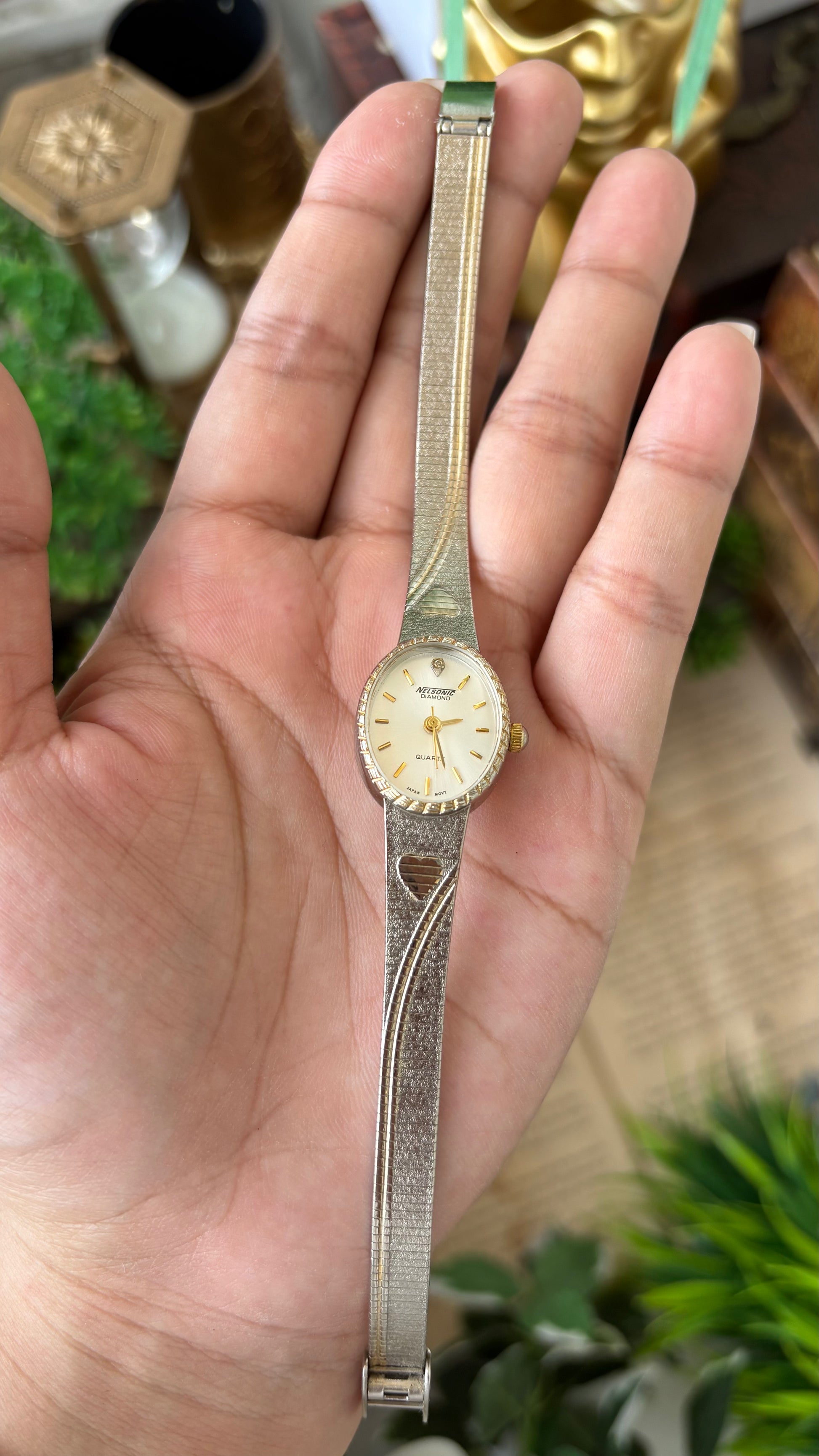 Vintage Dainty Nelsonic Embossed Heart Strap Watch in Two-Tone Diamond on Oval Dial Quartz #00218