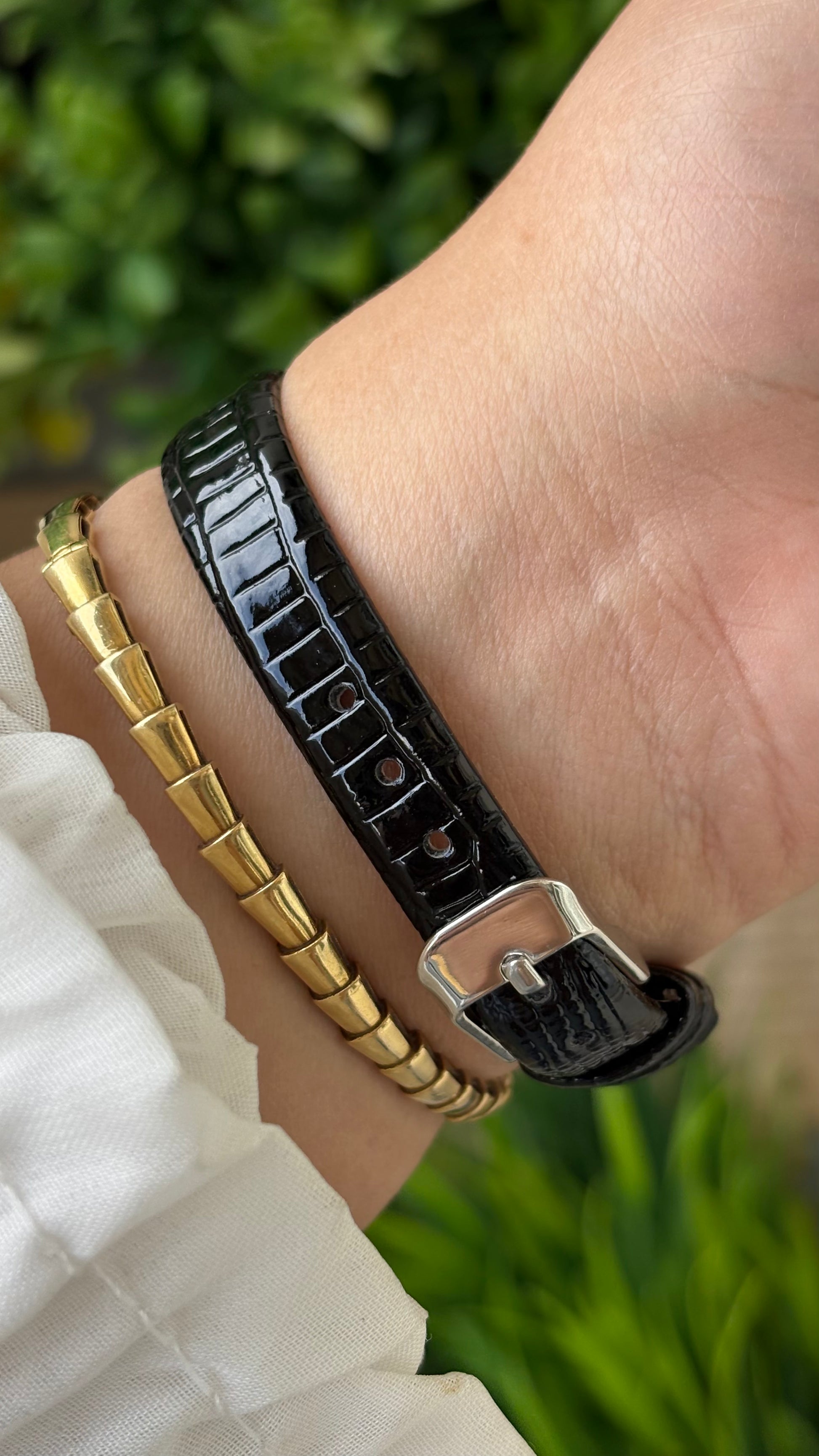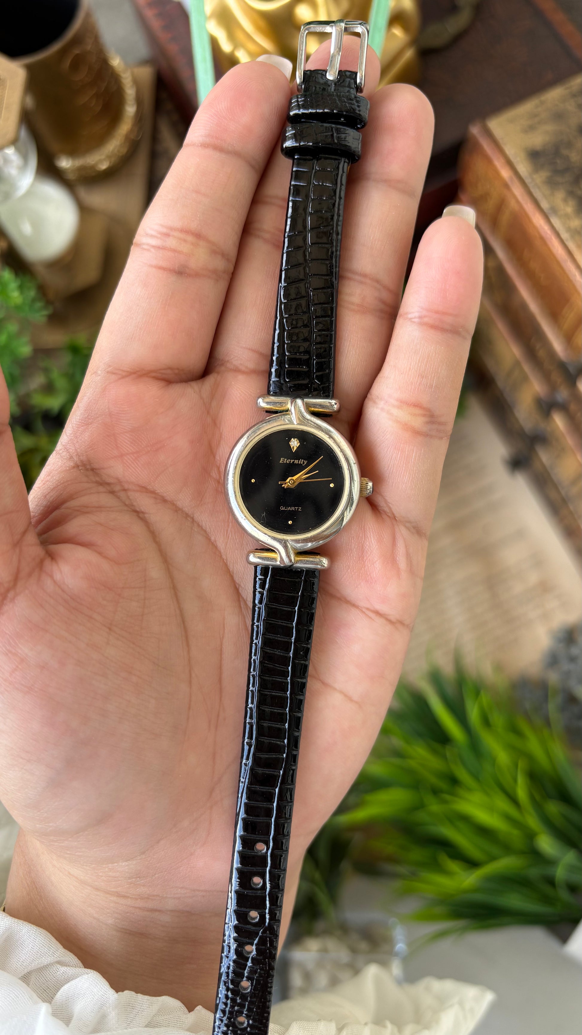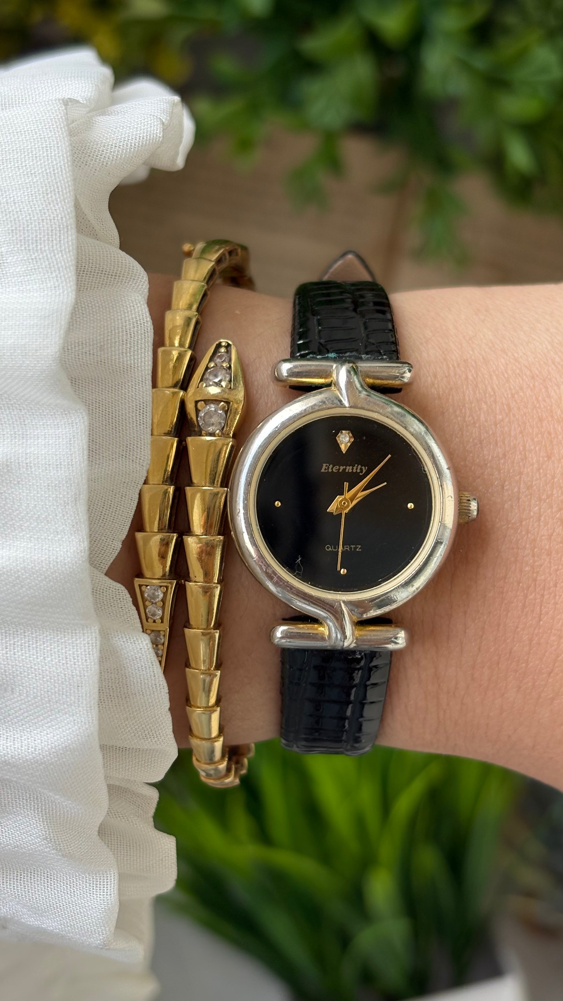 Vintage Eternity Watch in Gold Tone Black Leather Black Diamond Dial Quartz #00618