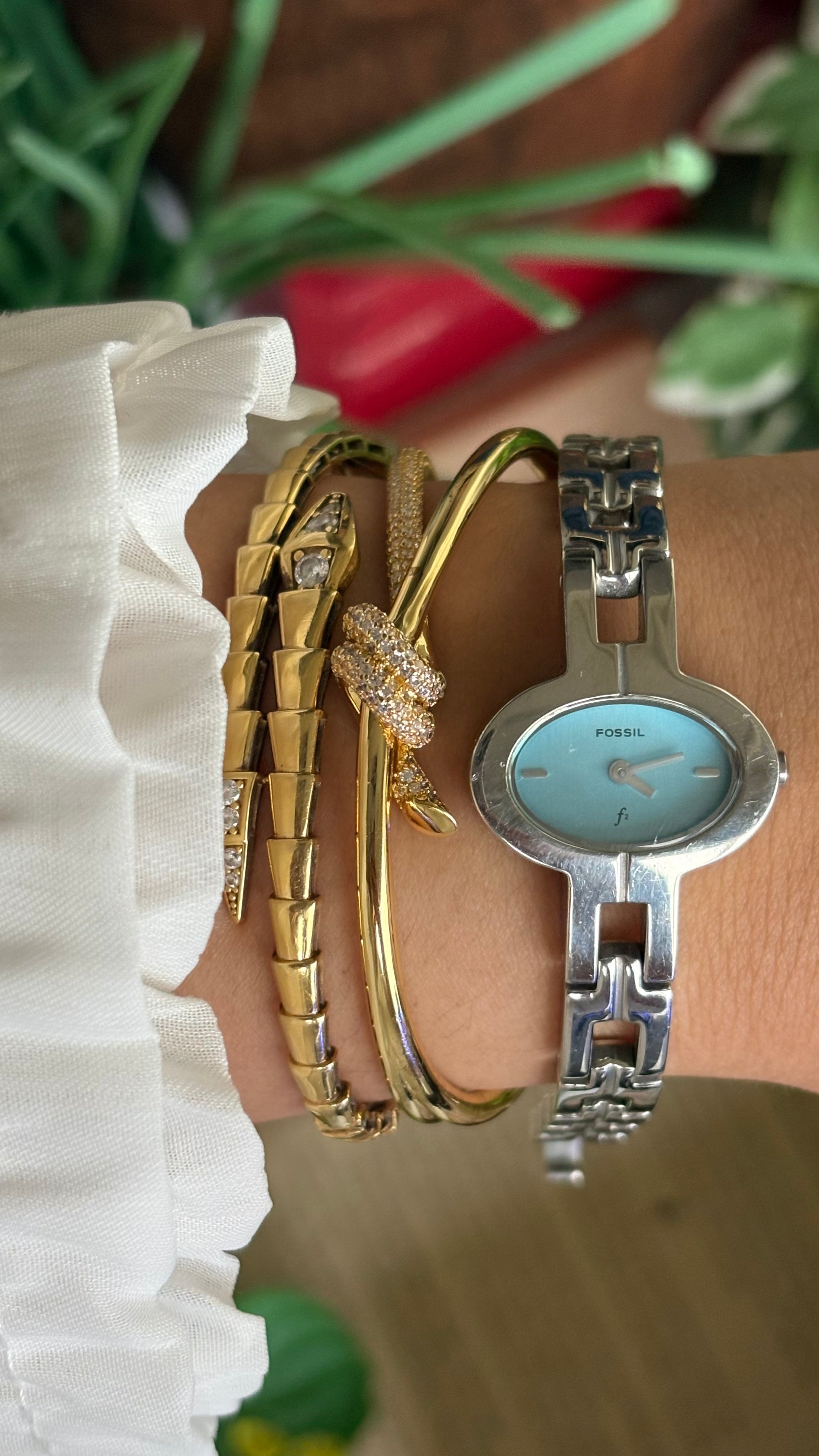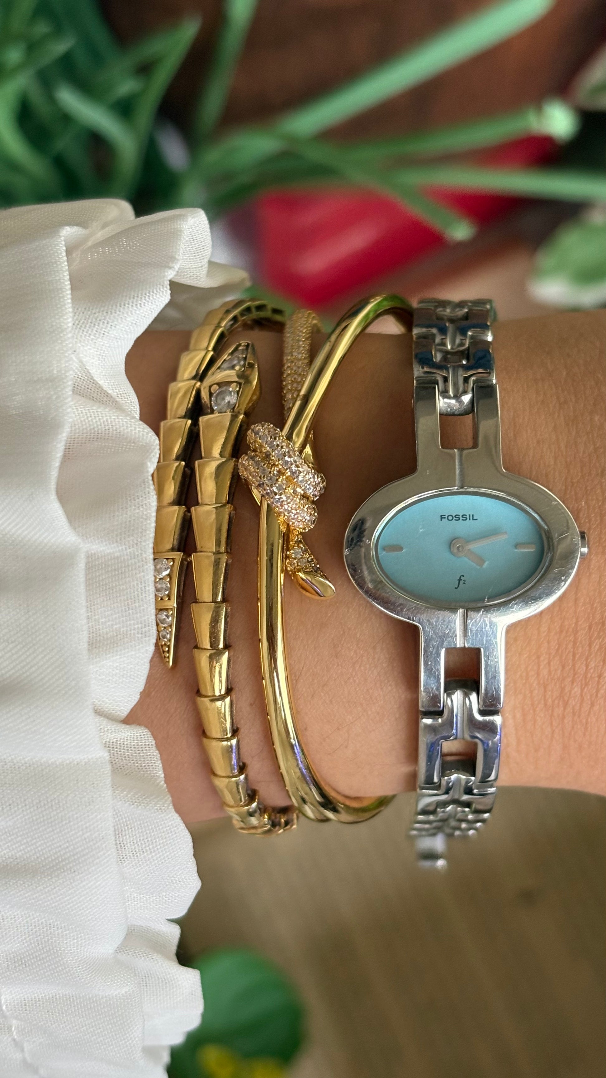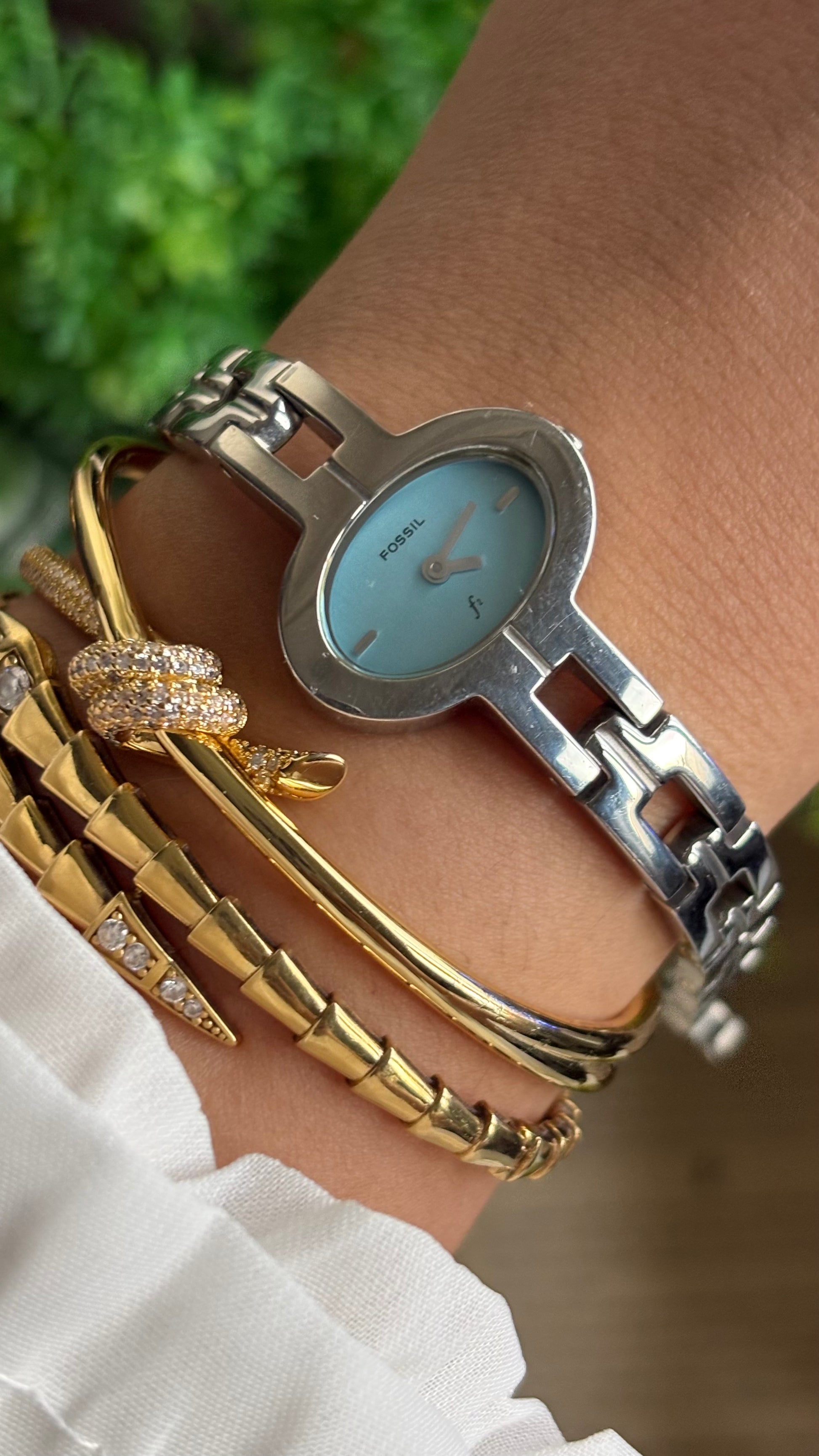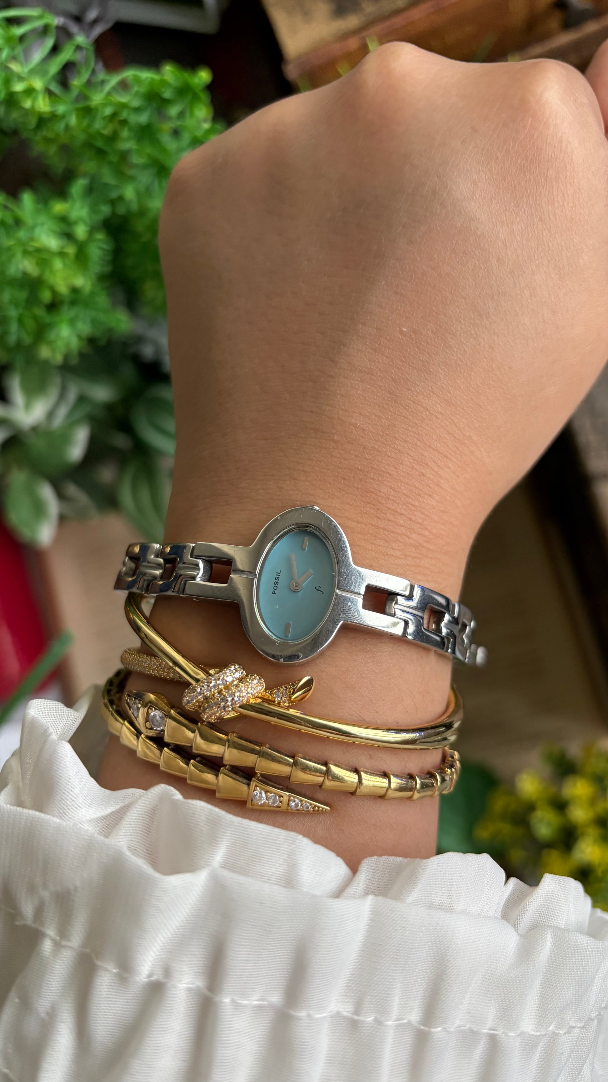 Vintage Rare Fossil Watch in Silver Tone Blue Oval Dial