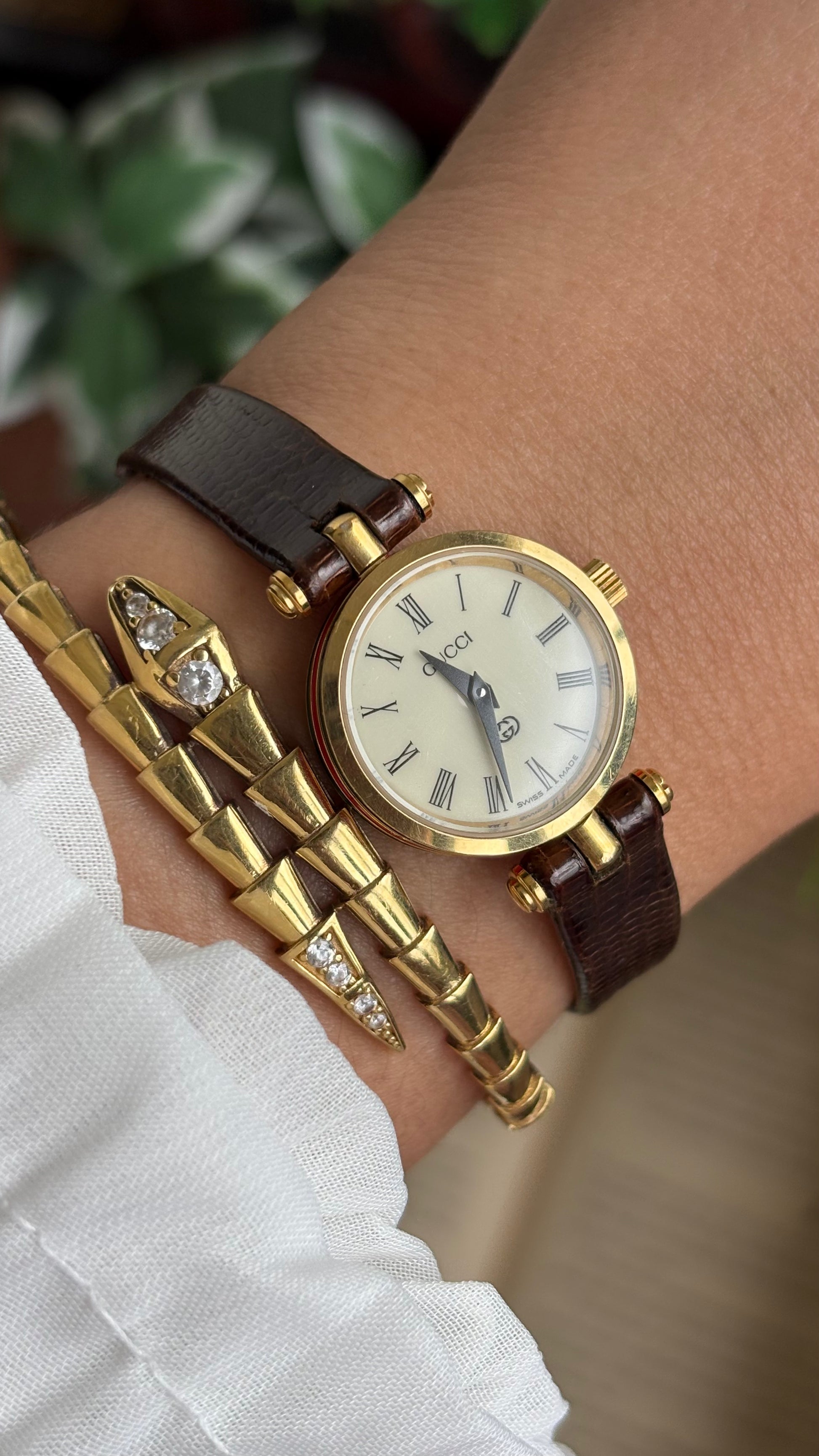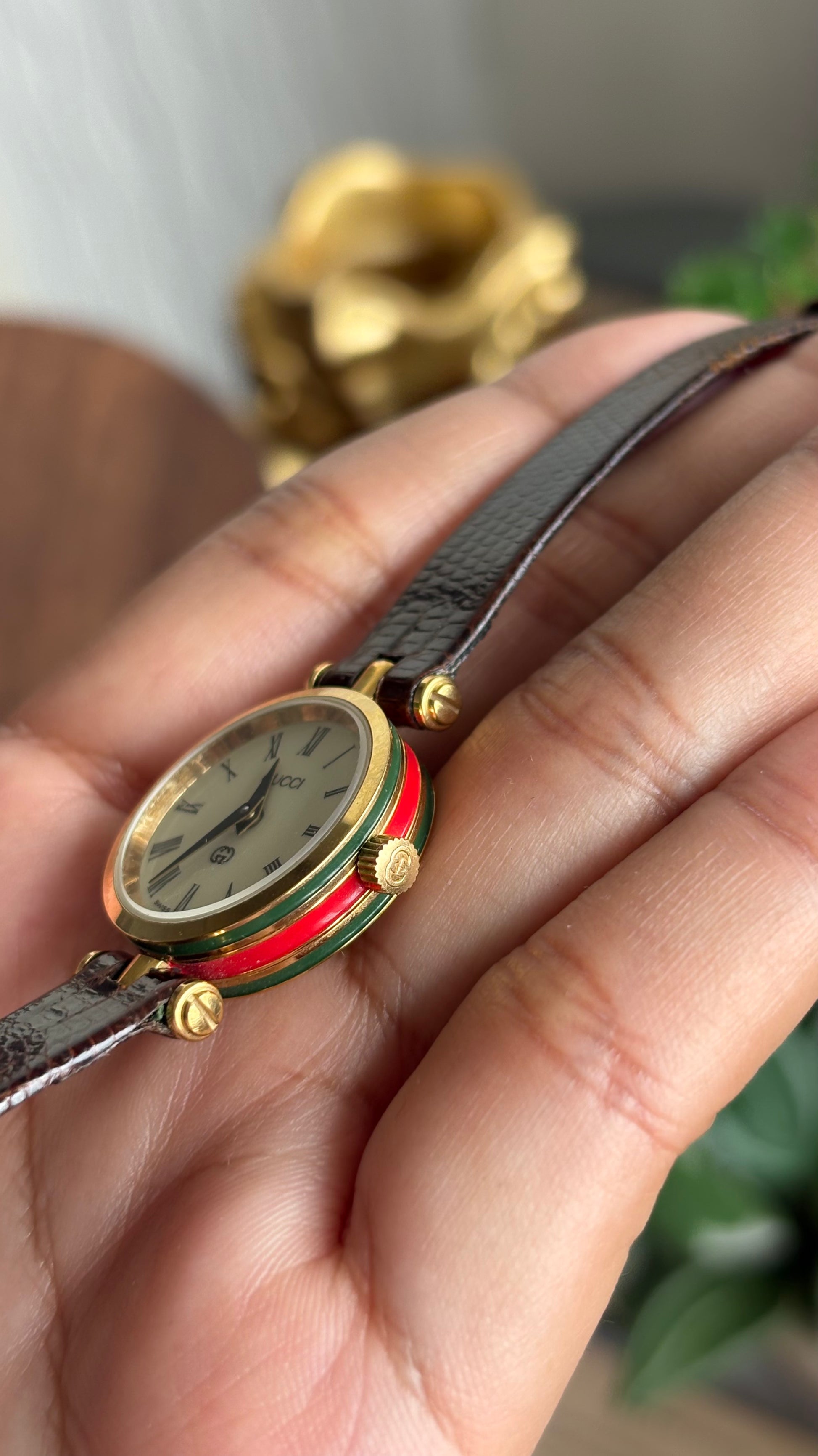 Vintage Gucci Women’s Dress Watch in Brown Leather Strap Rare Cherryline Bezel Accent in Roman Dial with Gucci Box
