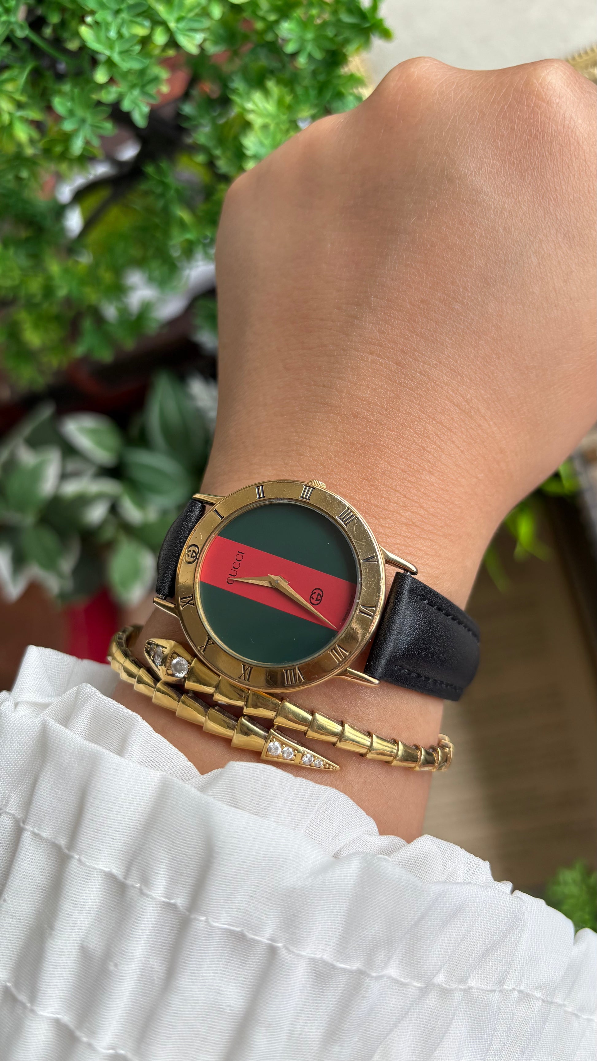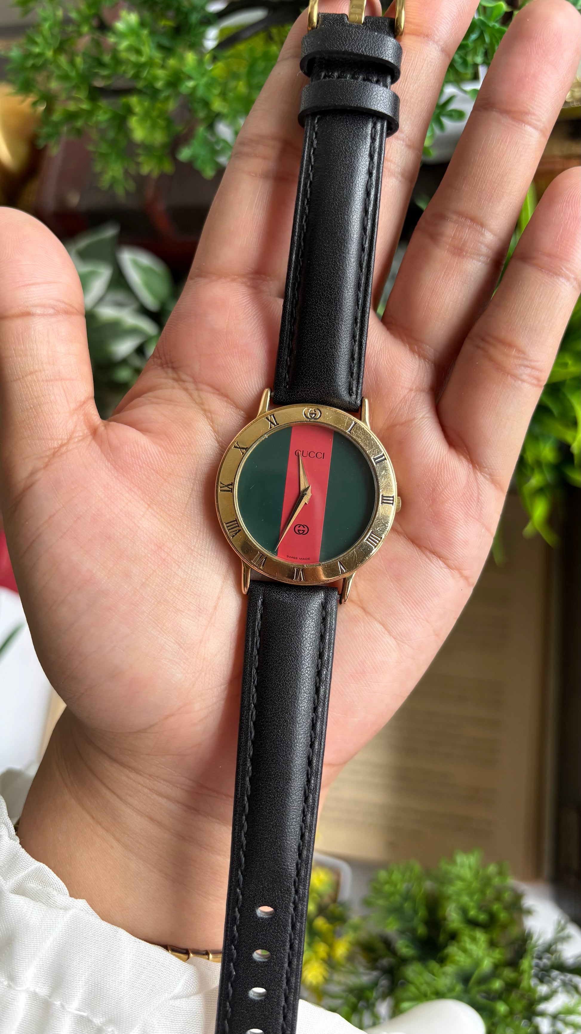 Vintage Gucci Men’s Dress Watch in Black Leather Strap Cherryline Dial with Gucci Box