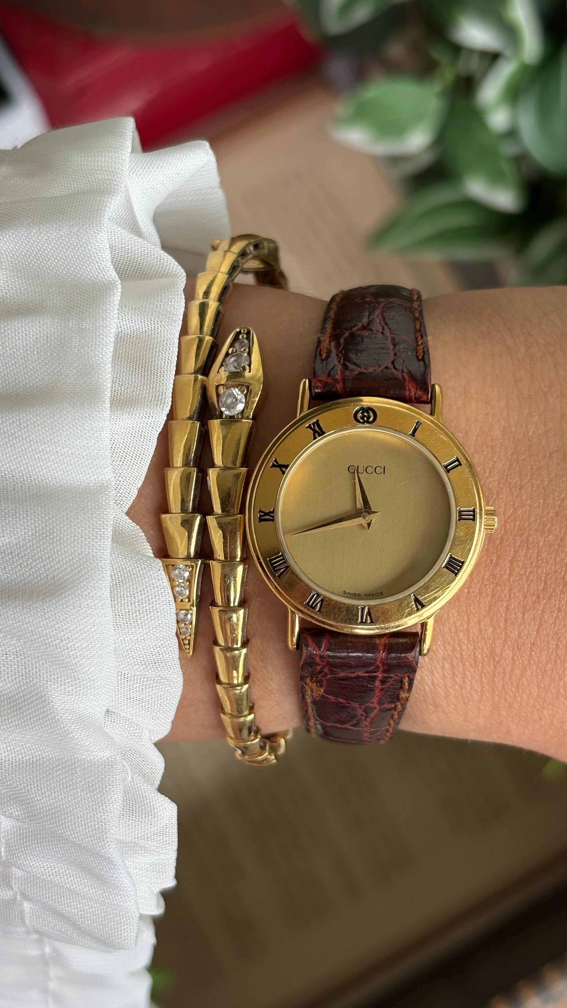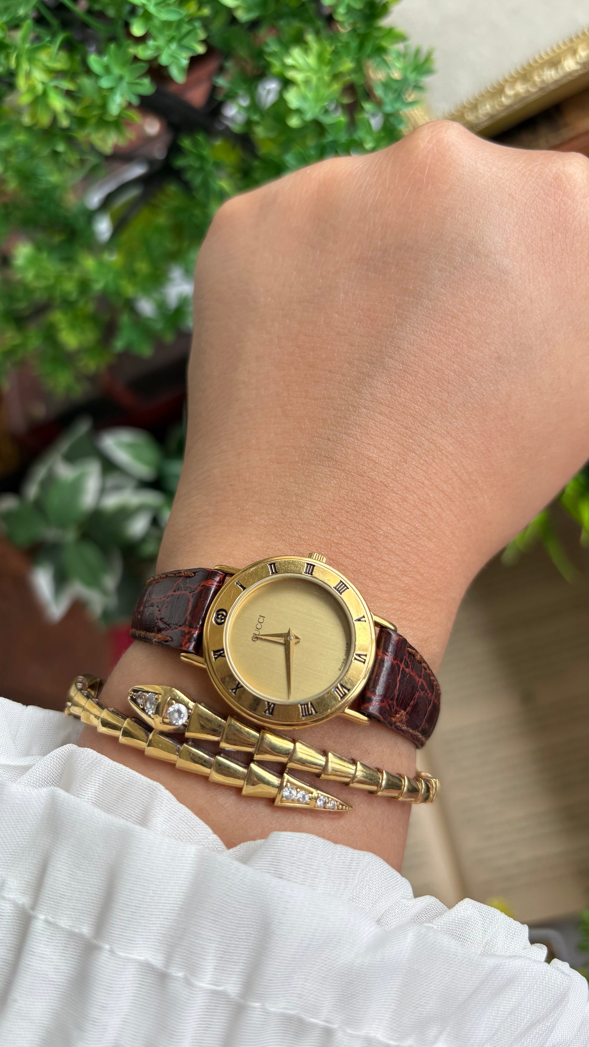Vintage Gucci Women’s Dress Watch in Brown Leather Strap Classic Roman Bezel