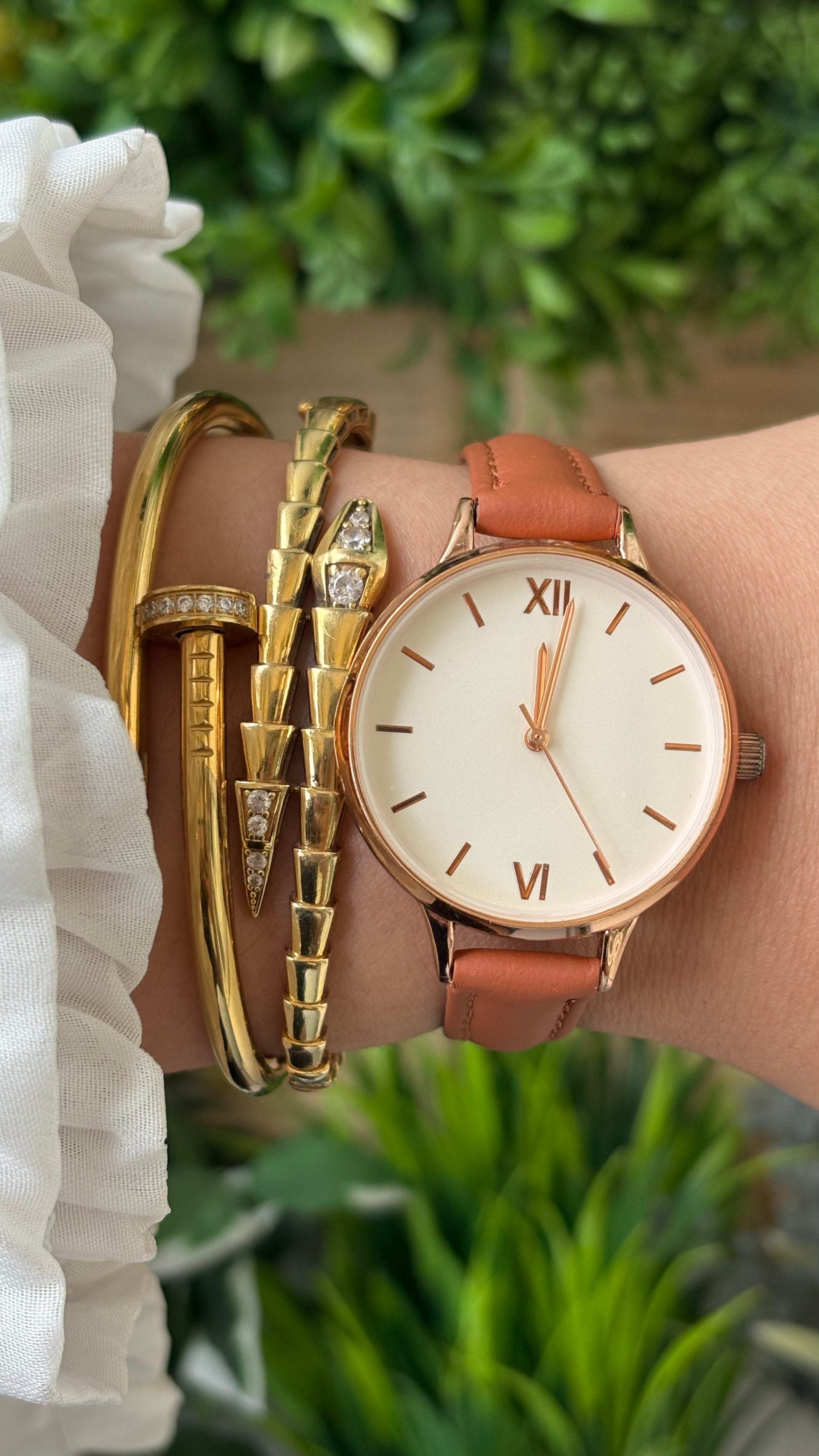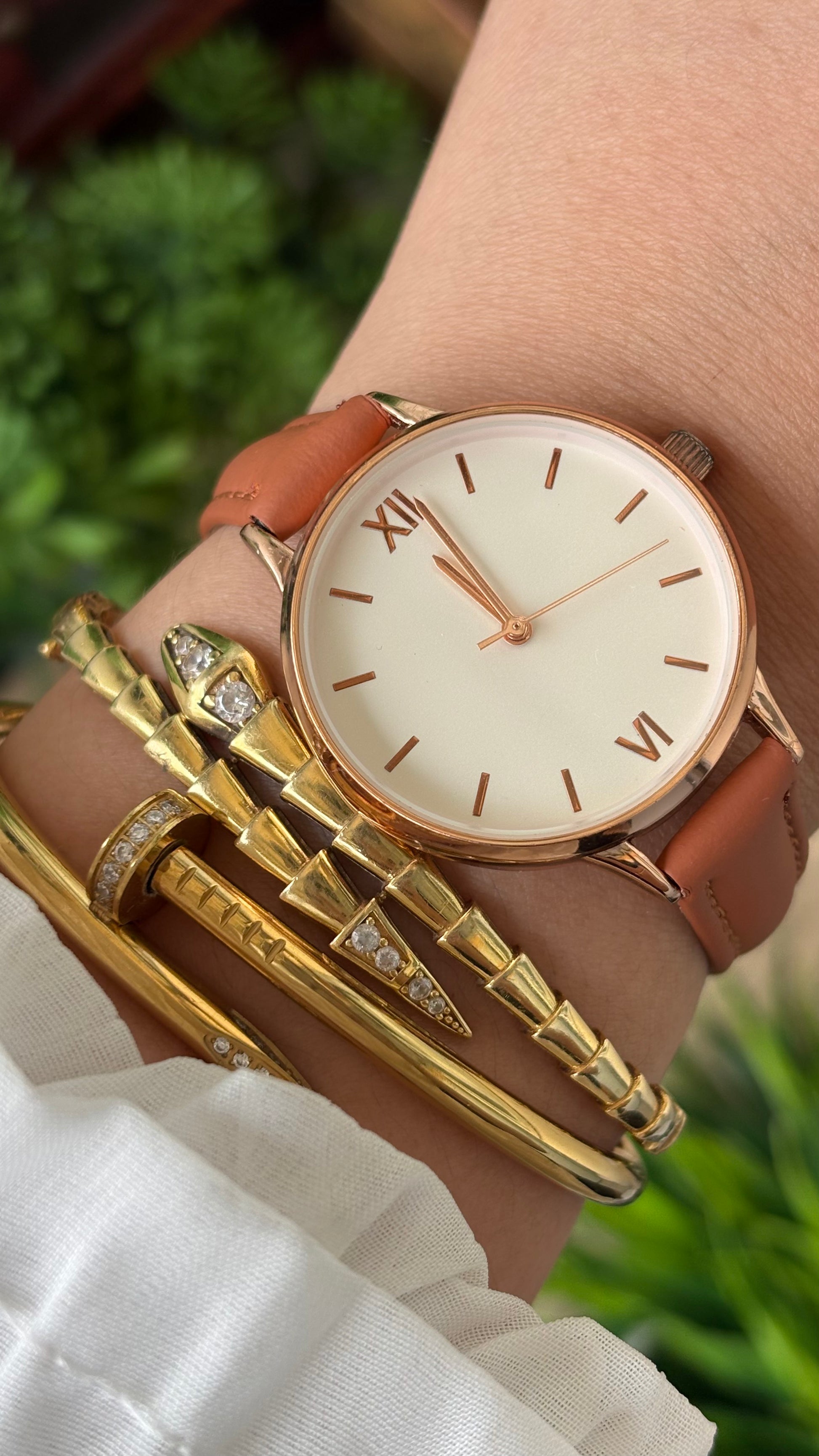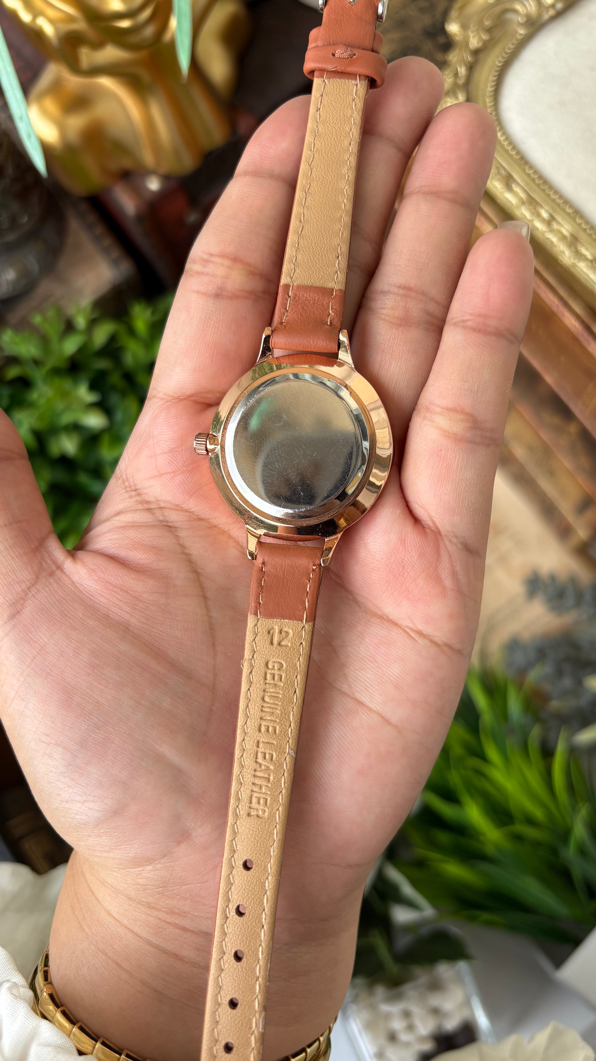Vintage Japan Quartz Minimalist Watch in Rose Gold Tone Honey Brown Leather #00918