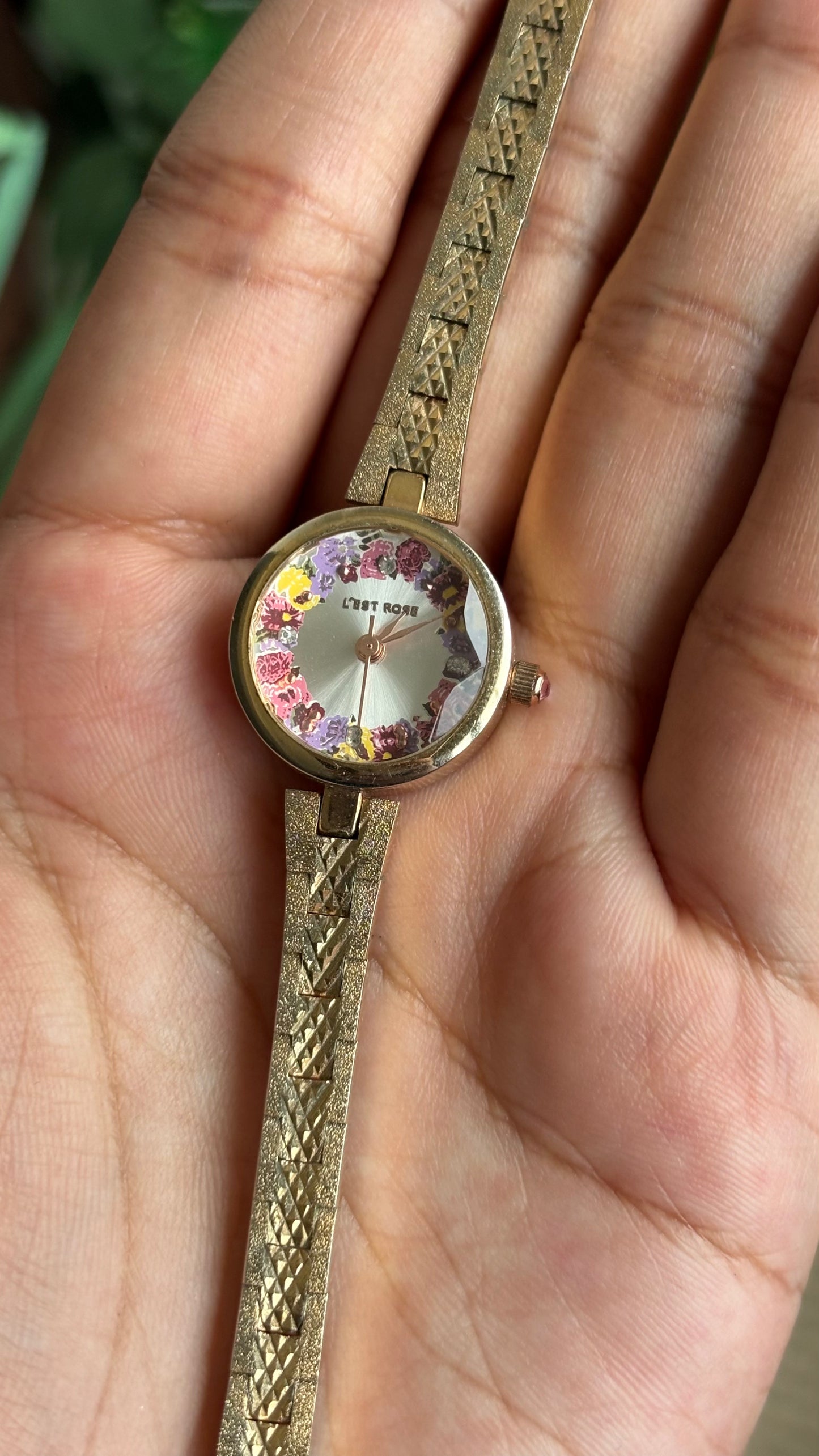 Vintage L'est Rose Watch in Gold Tone Flower Painted Dial