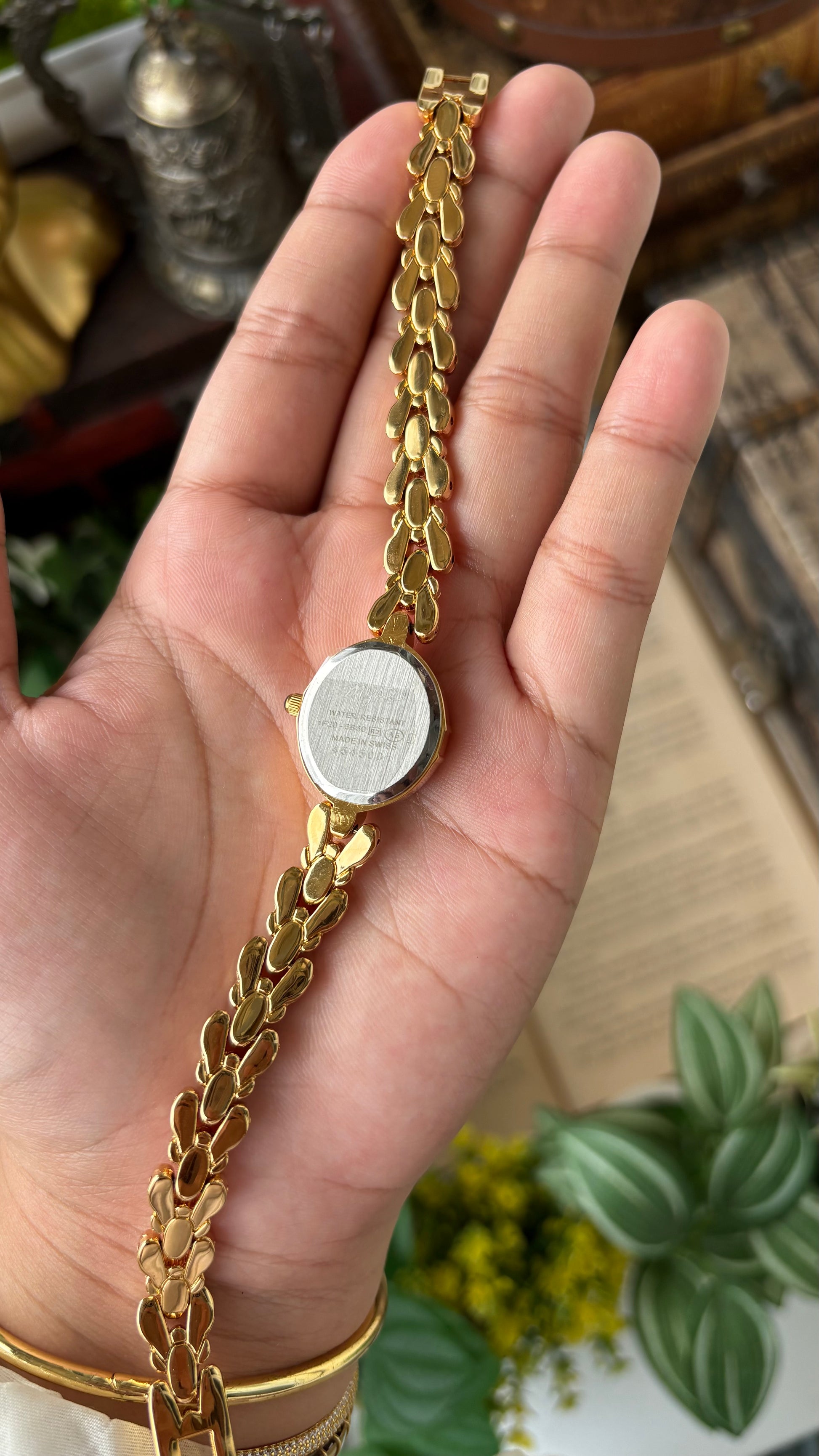 Vintage Myar Swiss Rhinestone Watch in Gold Tone Oval Dial Mother of Pearl Dial Quartz
