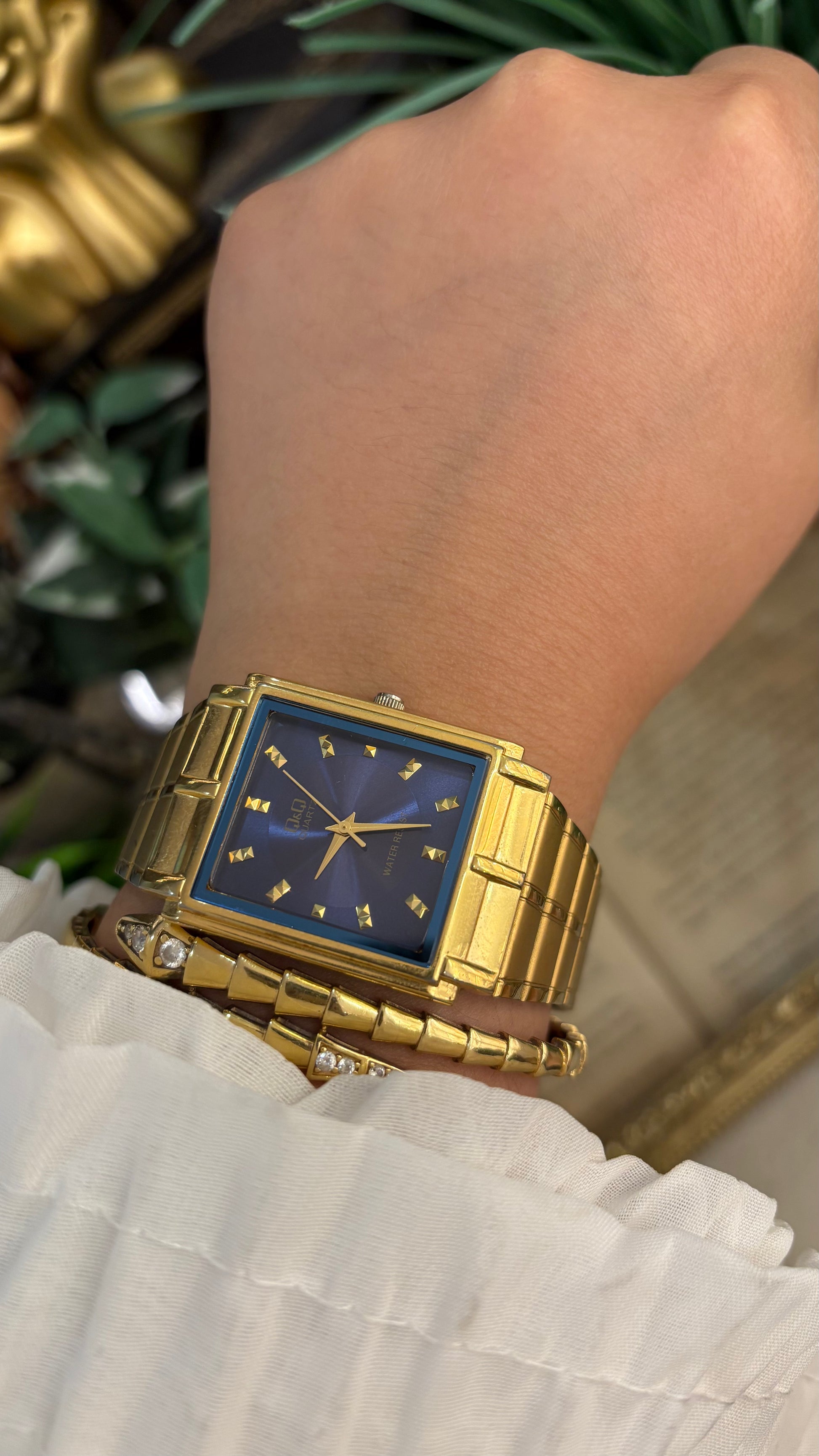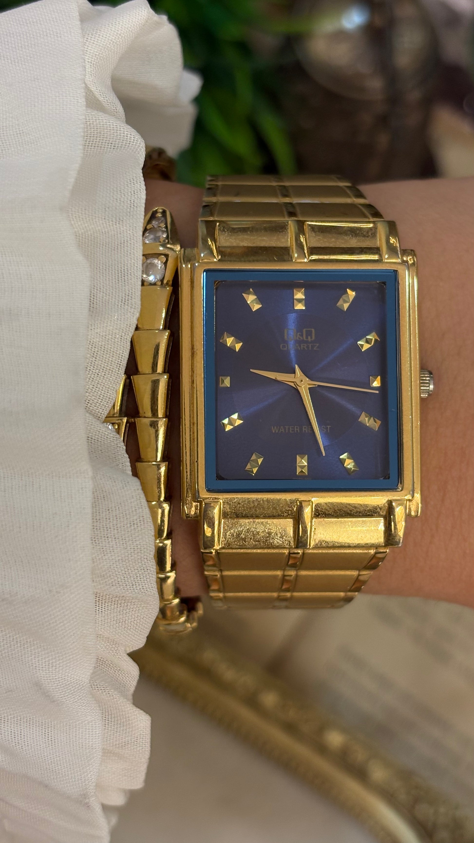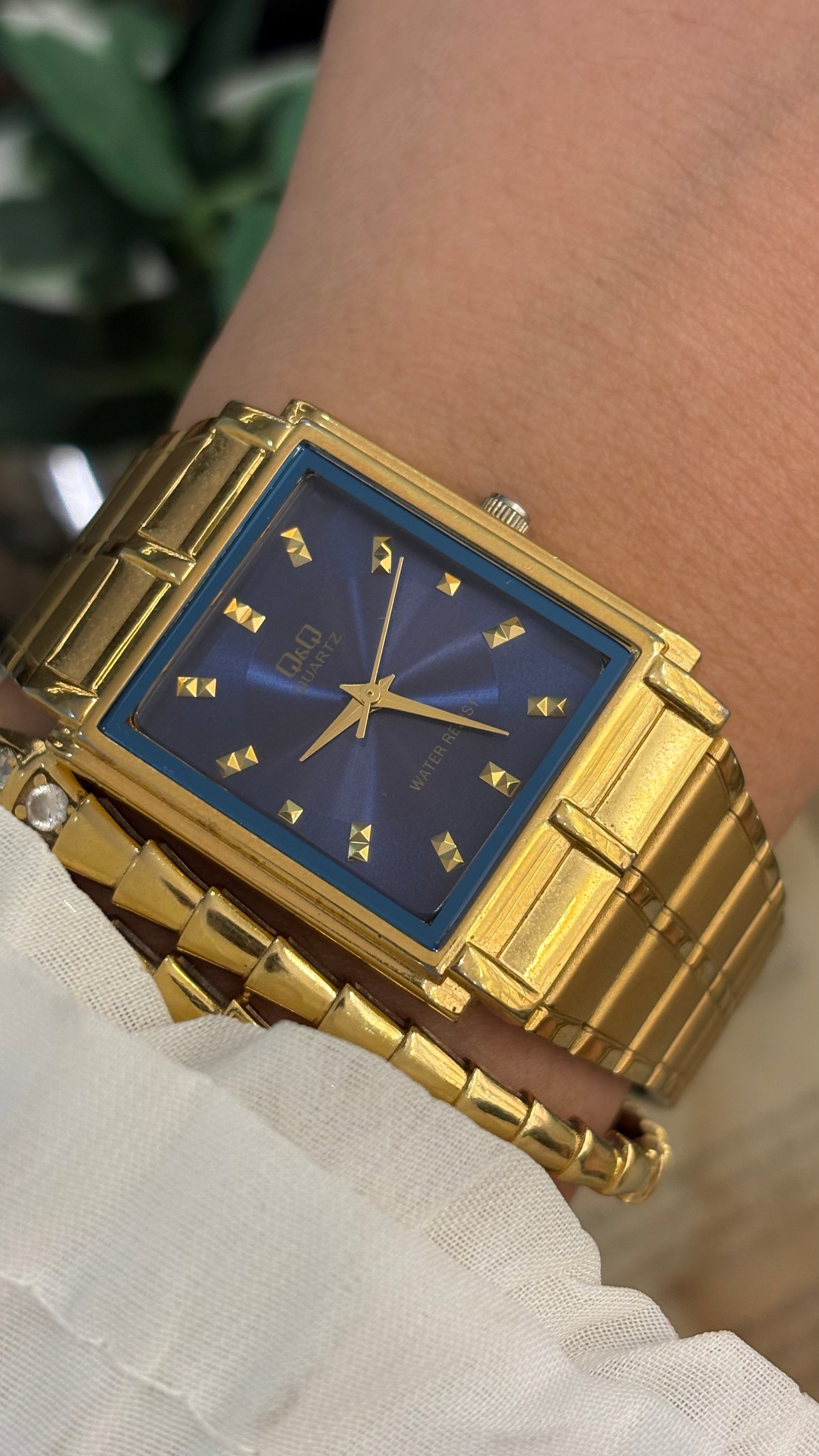 Vintage Q&Q Citizen Mens Classic Tank Watch in Gold Tone Navy Blue Dial Quartz