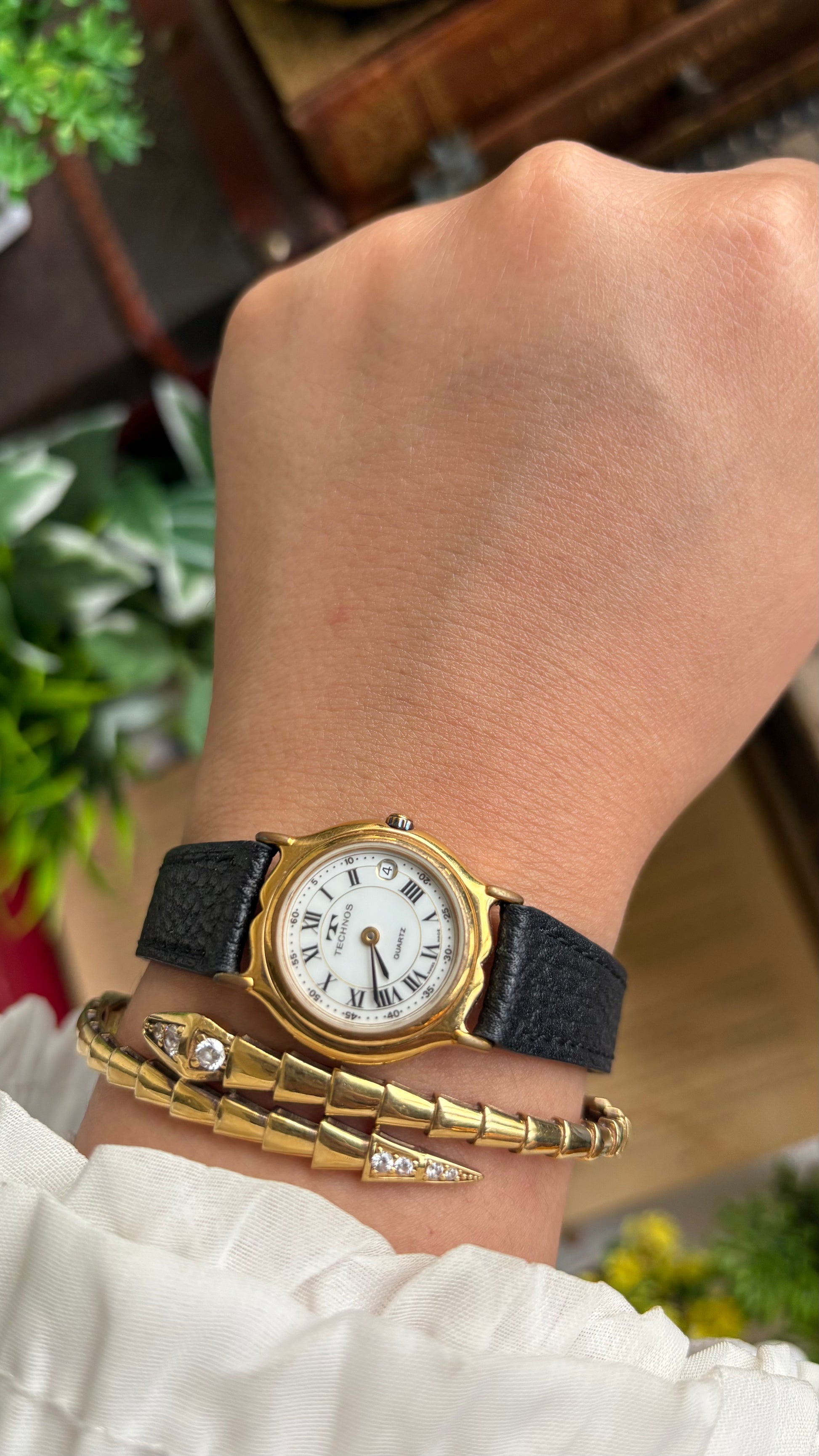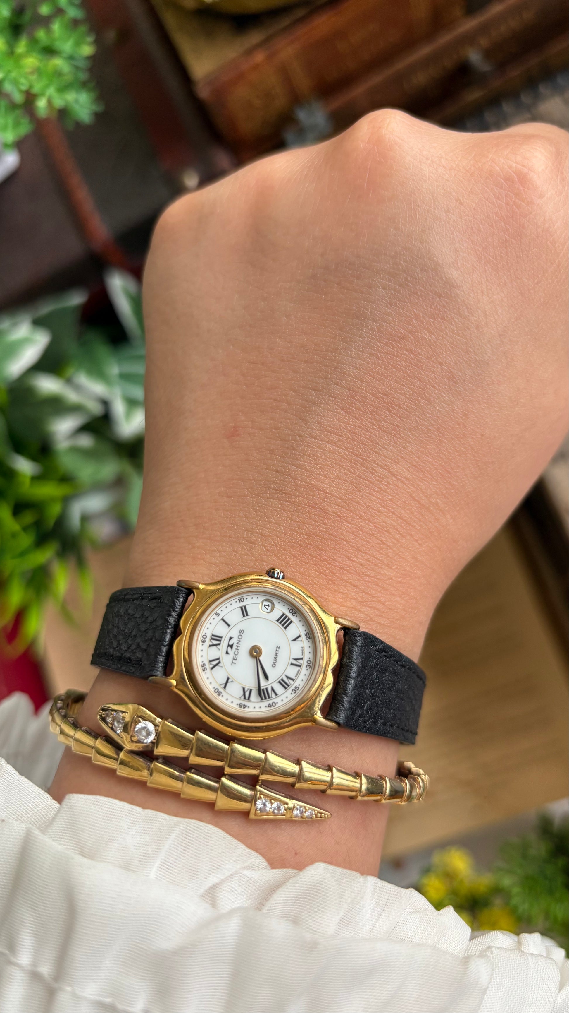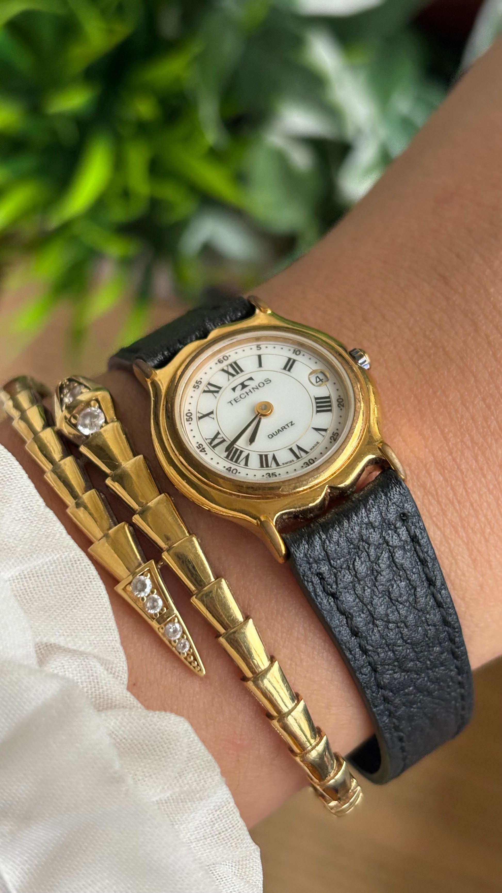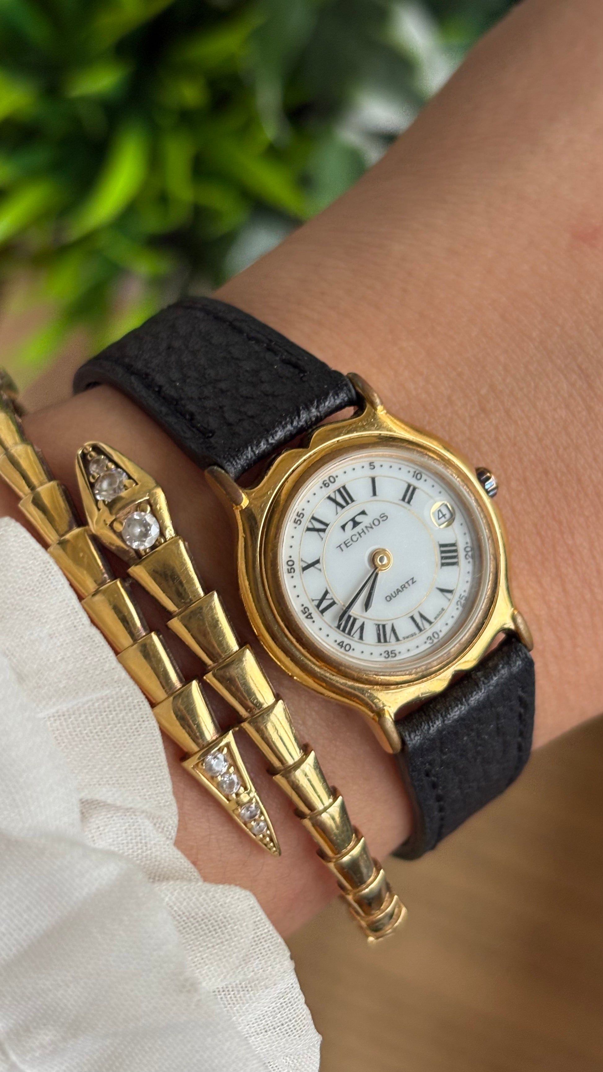 Vintage Technos Swiss Watch in Black Leather Strap Roman Dial with Window Date