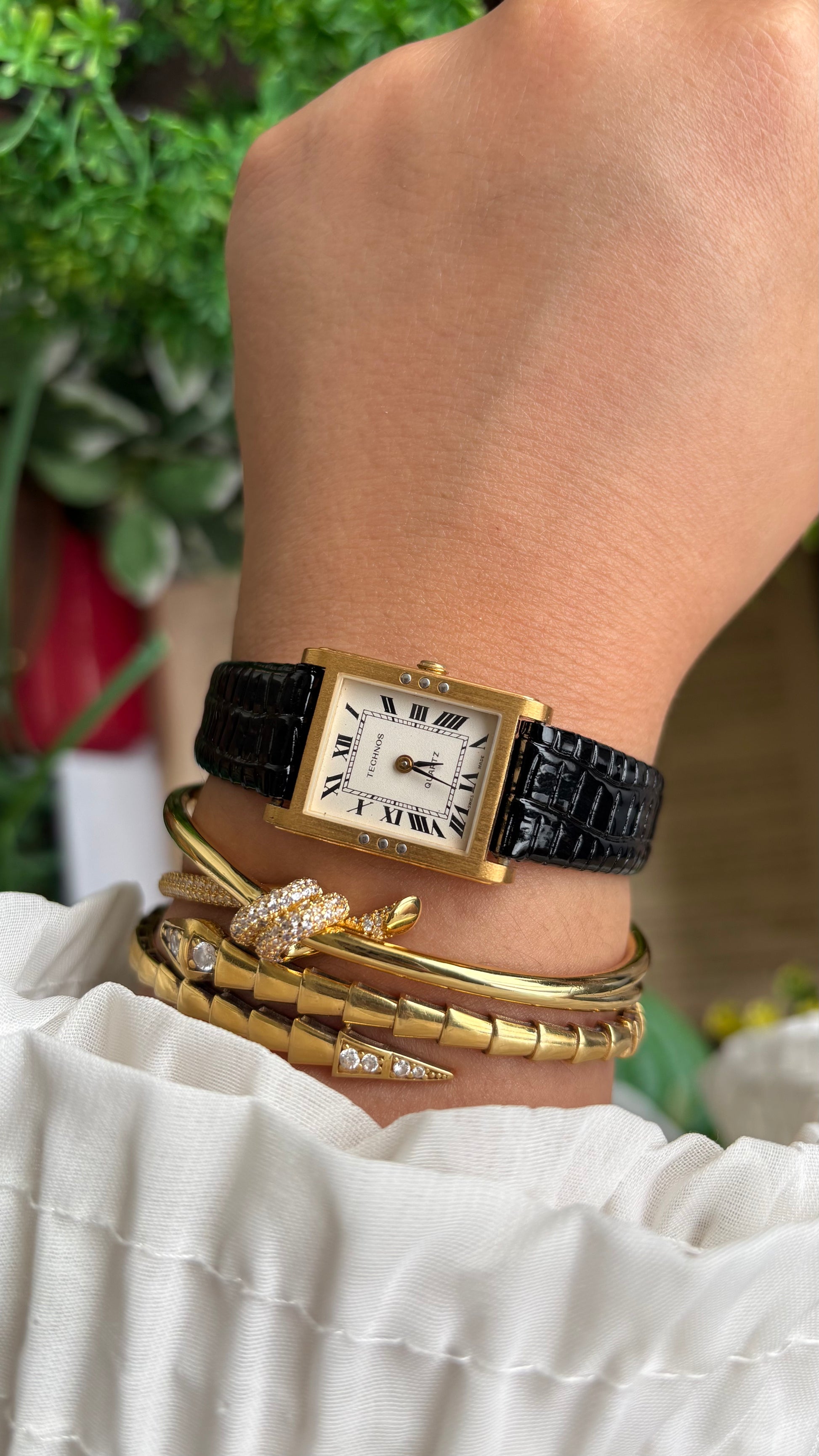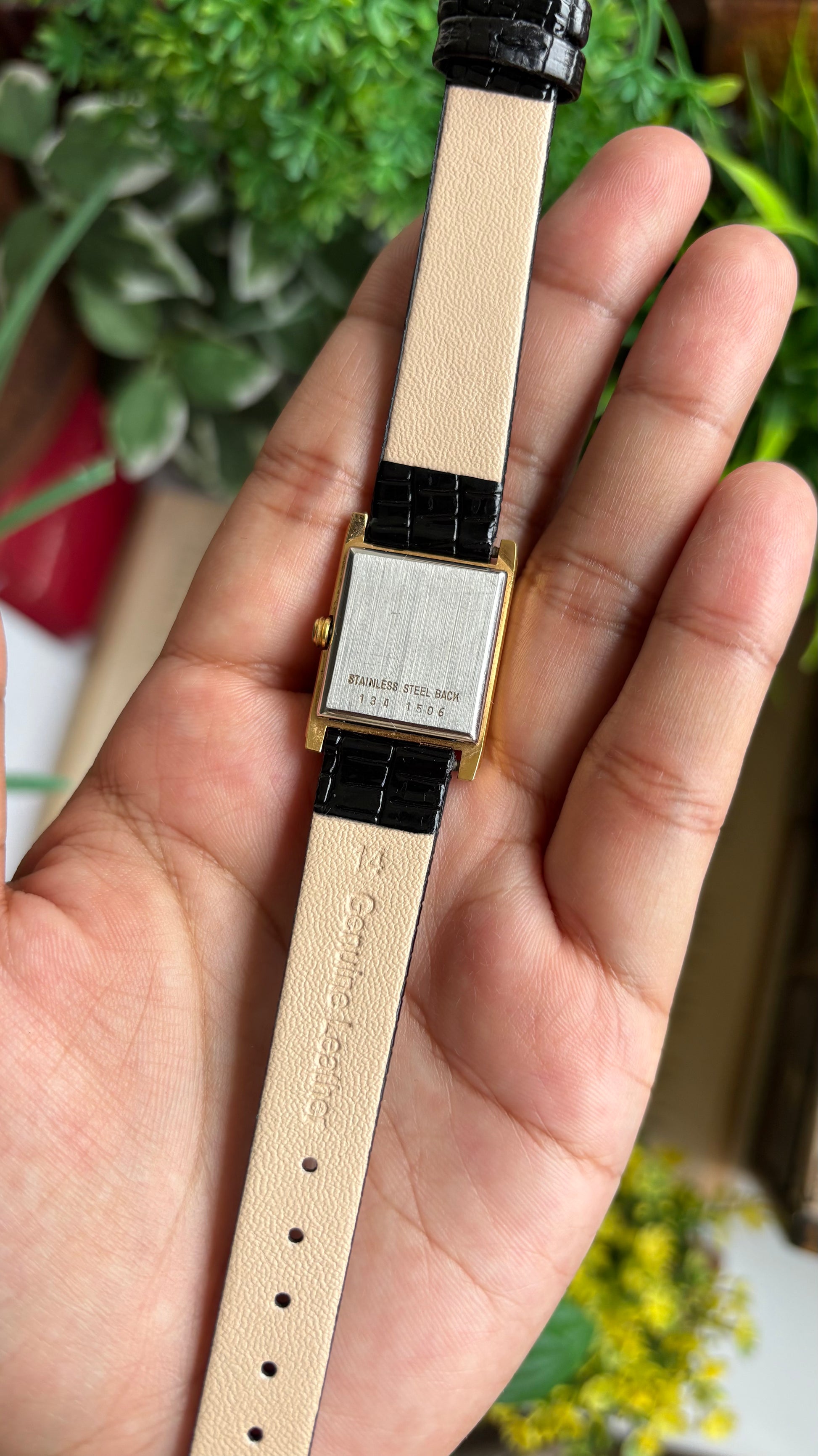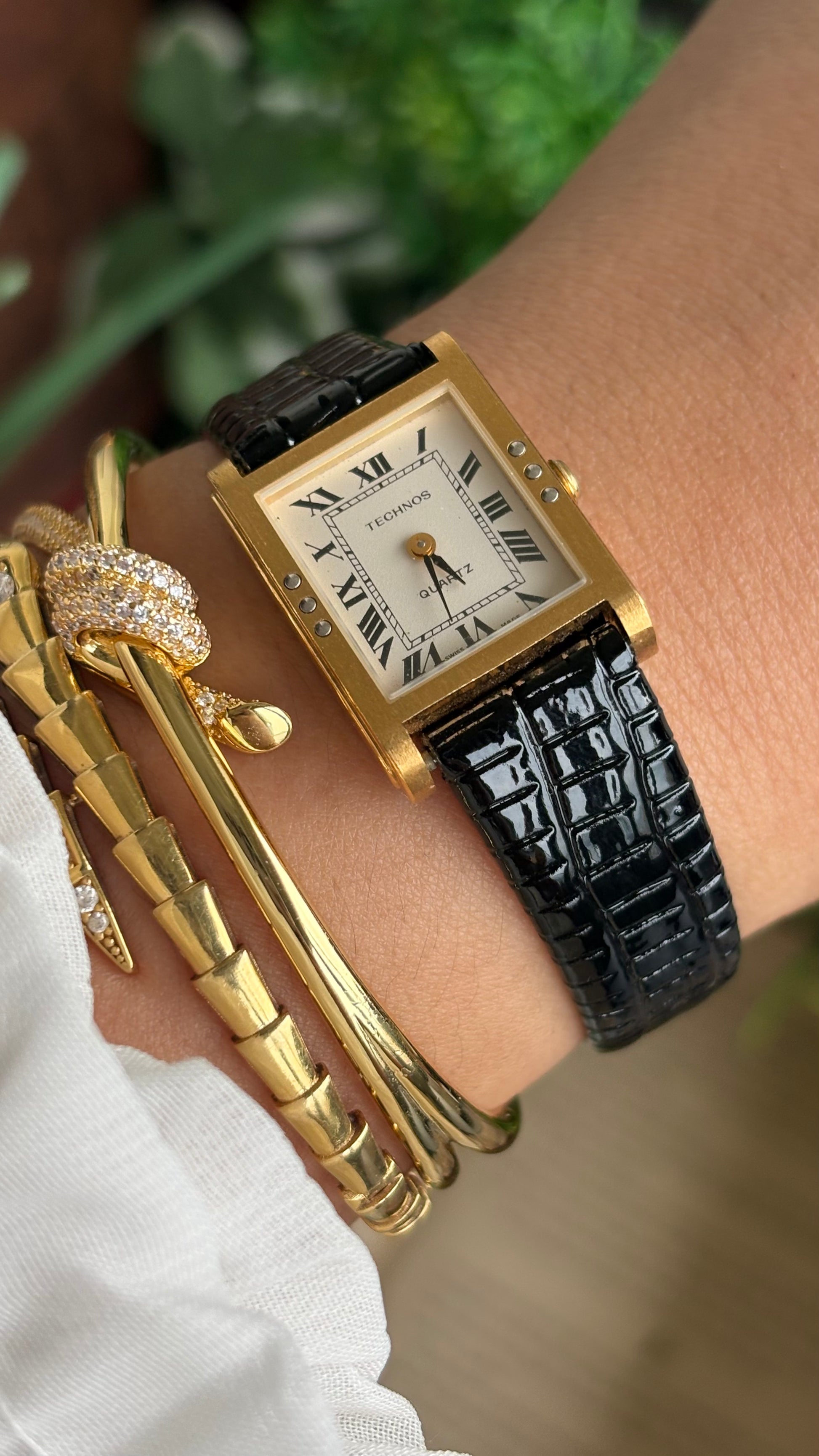 Vintage Technos Swiss Tank Watch in Black Leather Strap Cartier Style