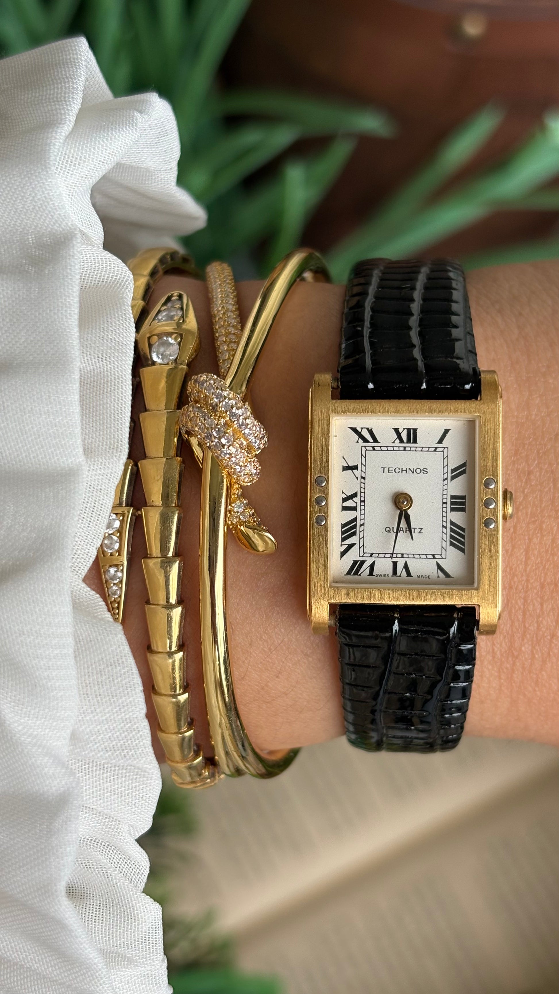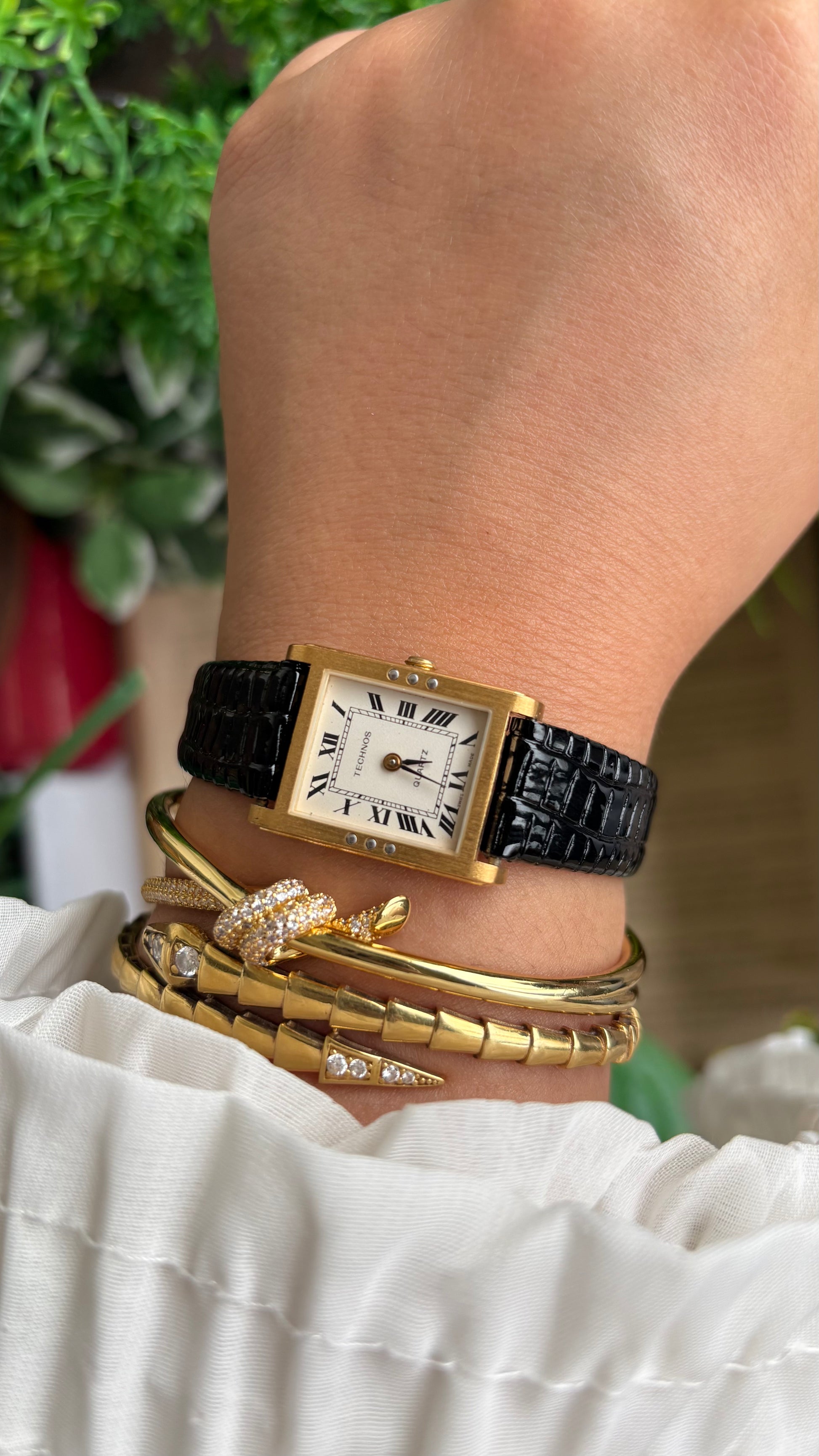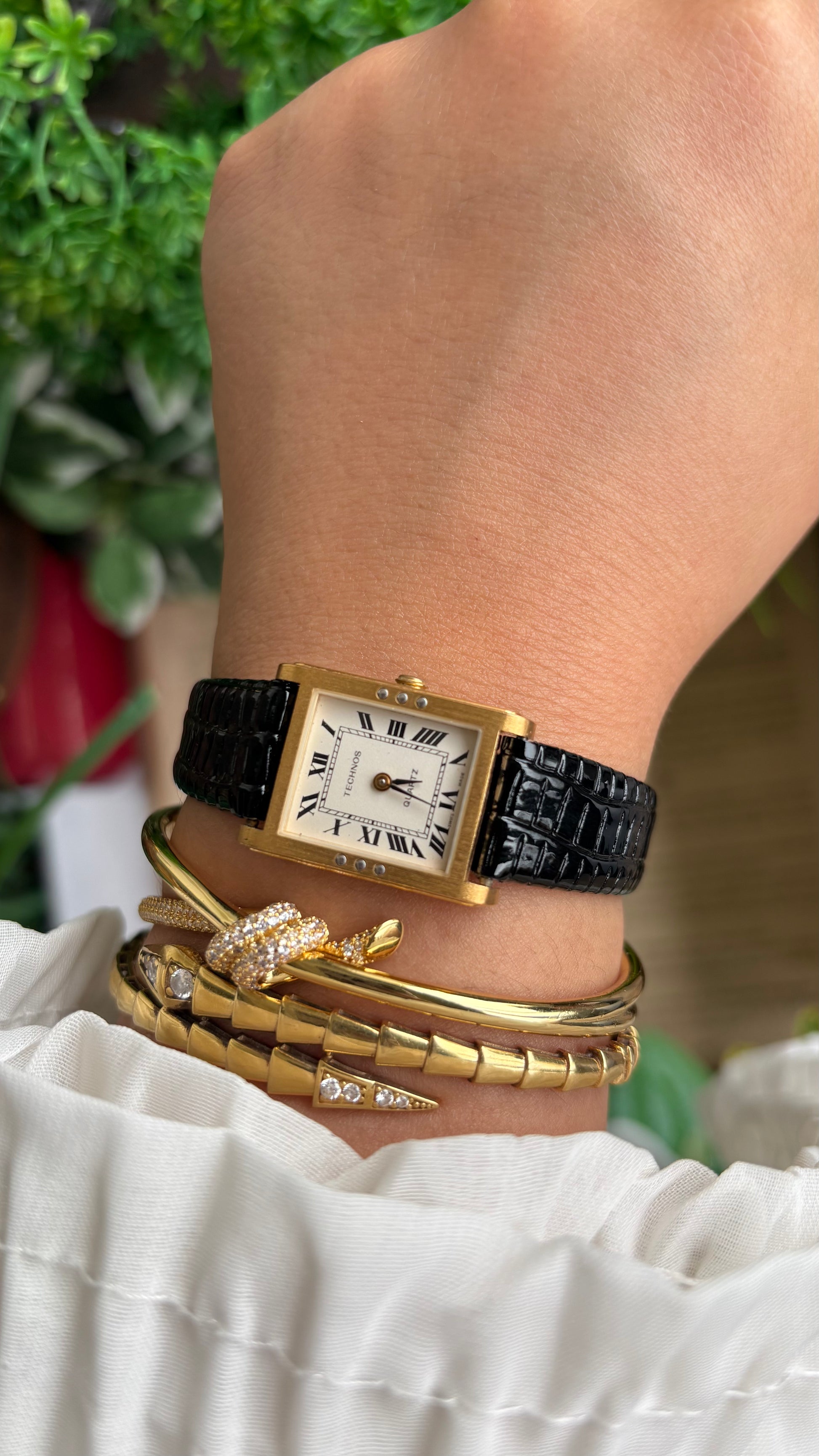 Vintage Technos Swiss Tank Watch in Black Leather Strap Cartier Style